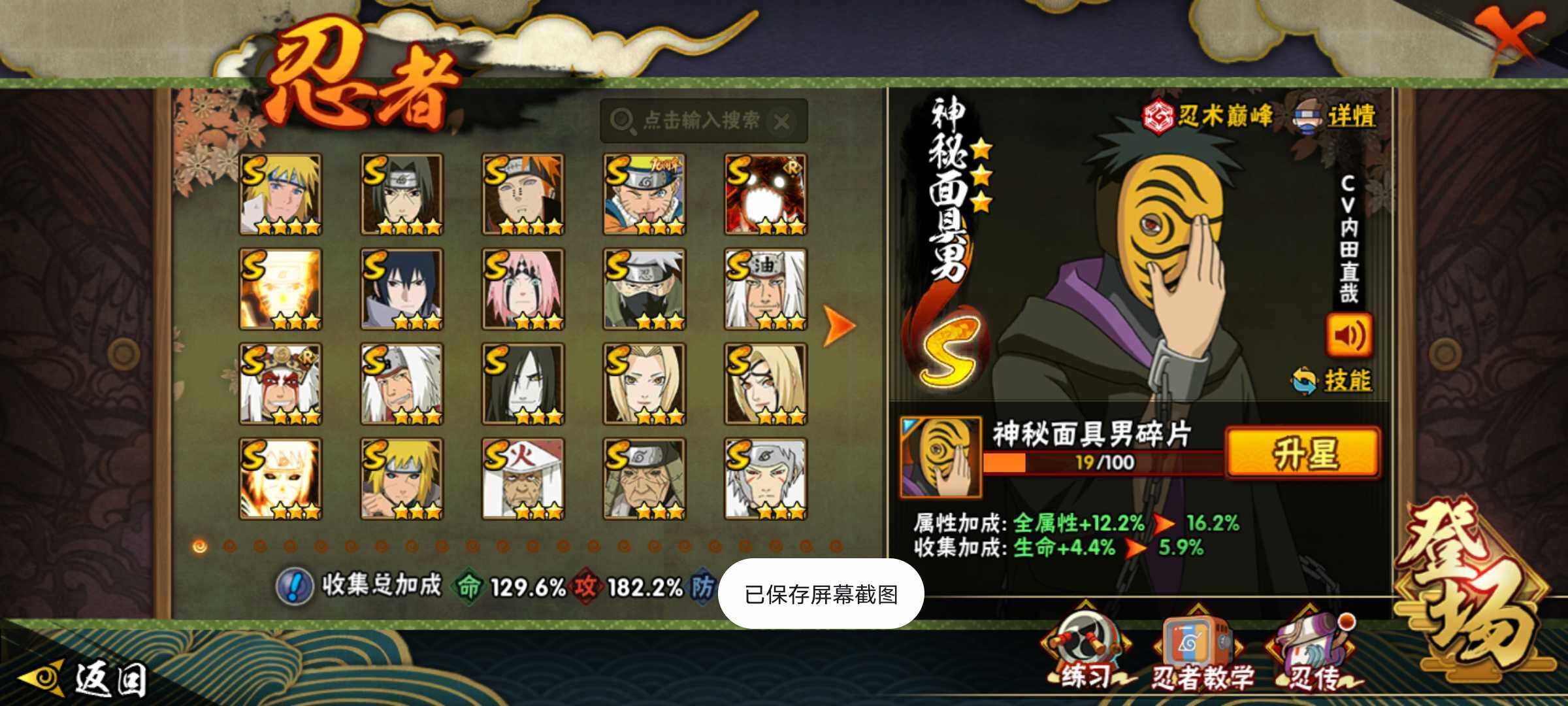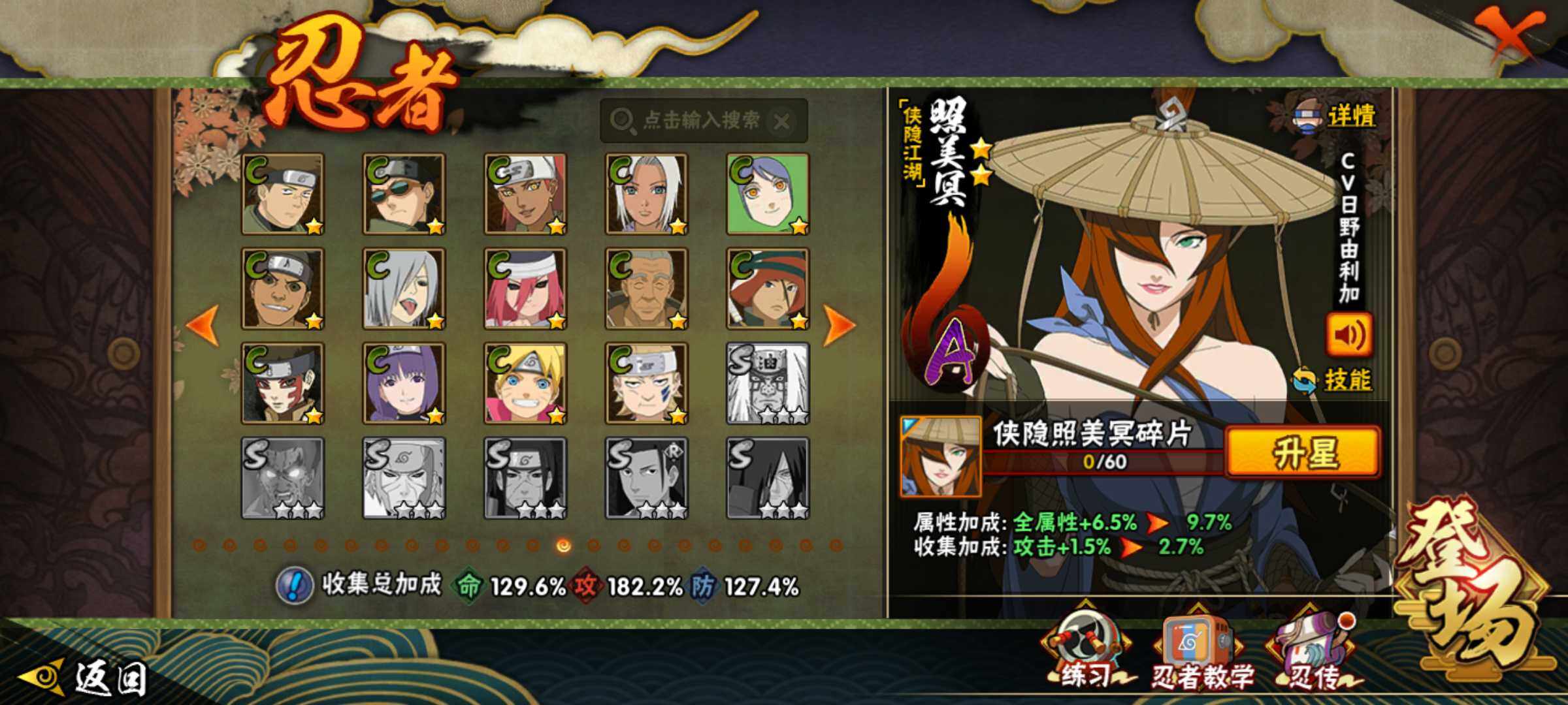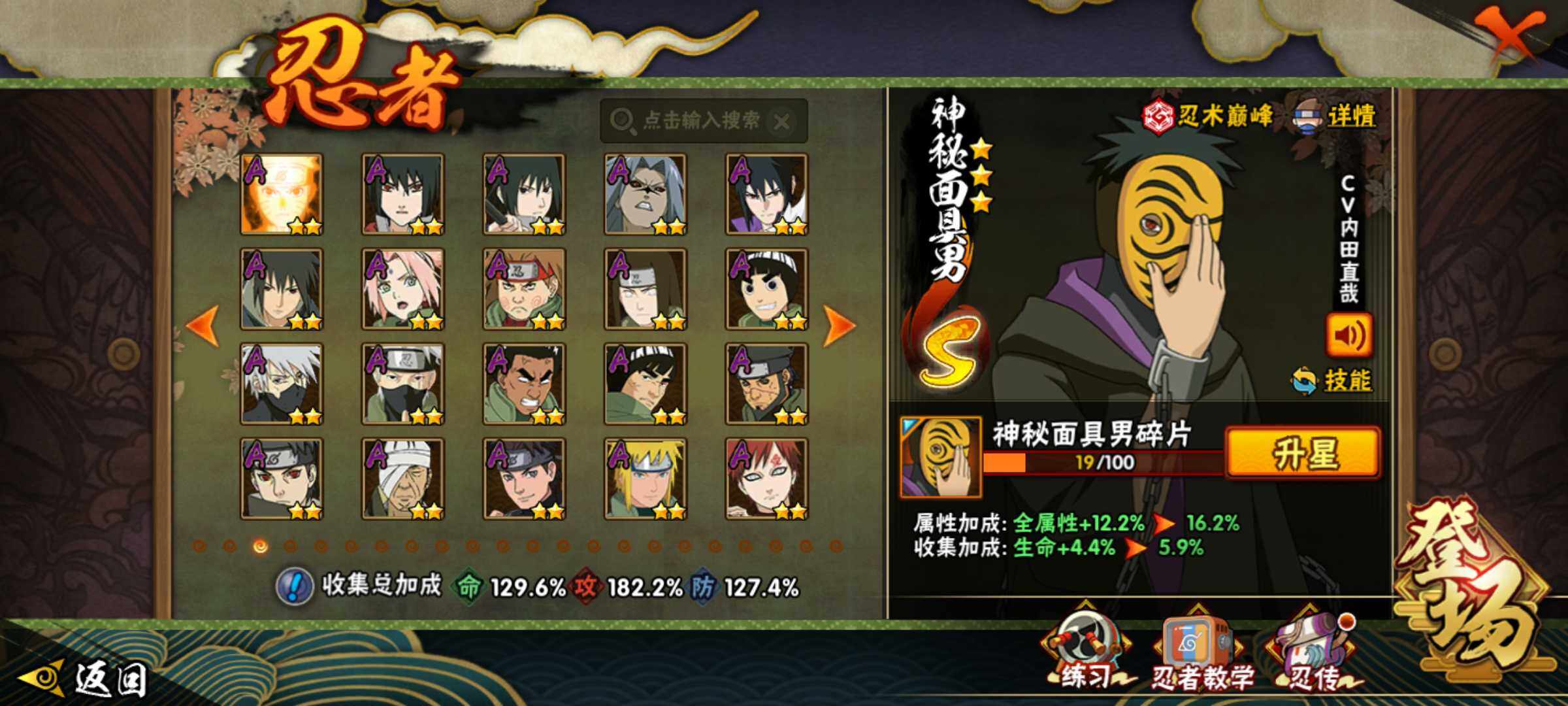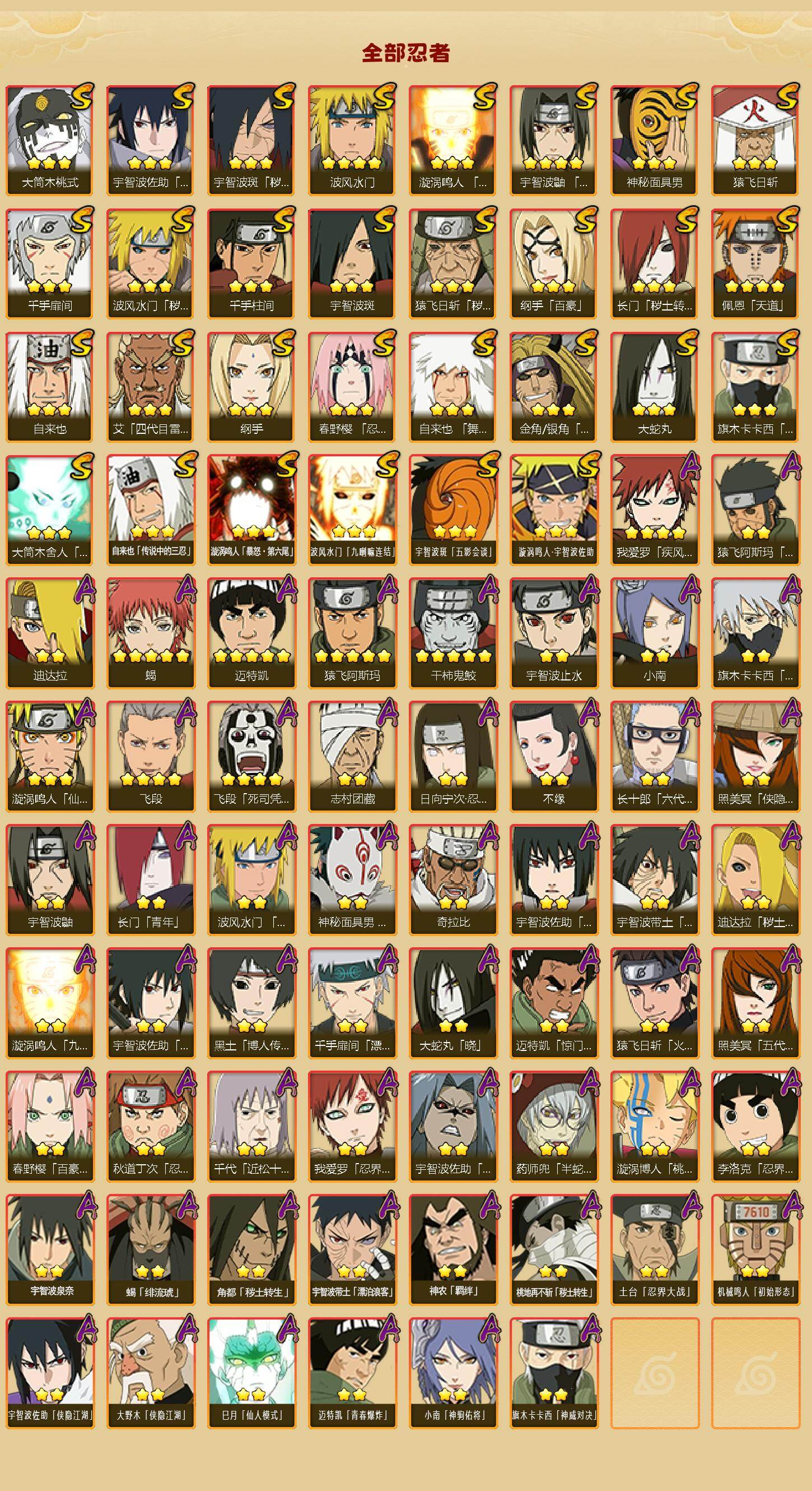 【S级忍者】:长门「秽土转生」(3星),金角·银角「秽土转生」(3星),猿飞日斩「秽土转生」(3星),波风水门「秽土转生」(3星),宇智波斑「秽土转生·解」(3星),春野樱「忍界大战」(3星),宇智波鼬「须佐能乎」(4星),旗木卡卡西「须佐能乎」(3星),艾「四代目雷影」(3星),自来也(3星),自来也「舞之豪杰」(3星),大蛇丸(3星),自来也「传说中的