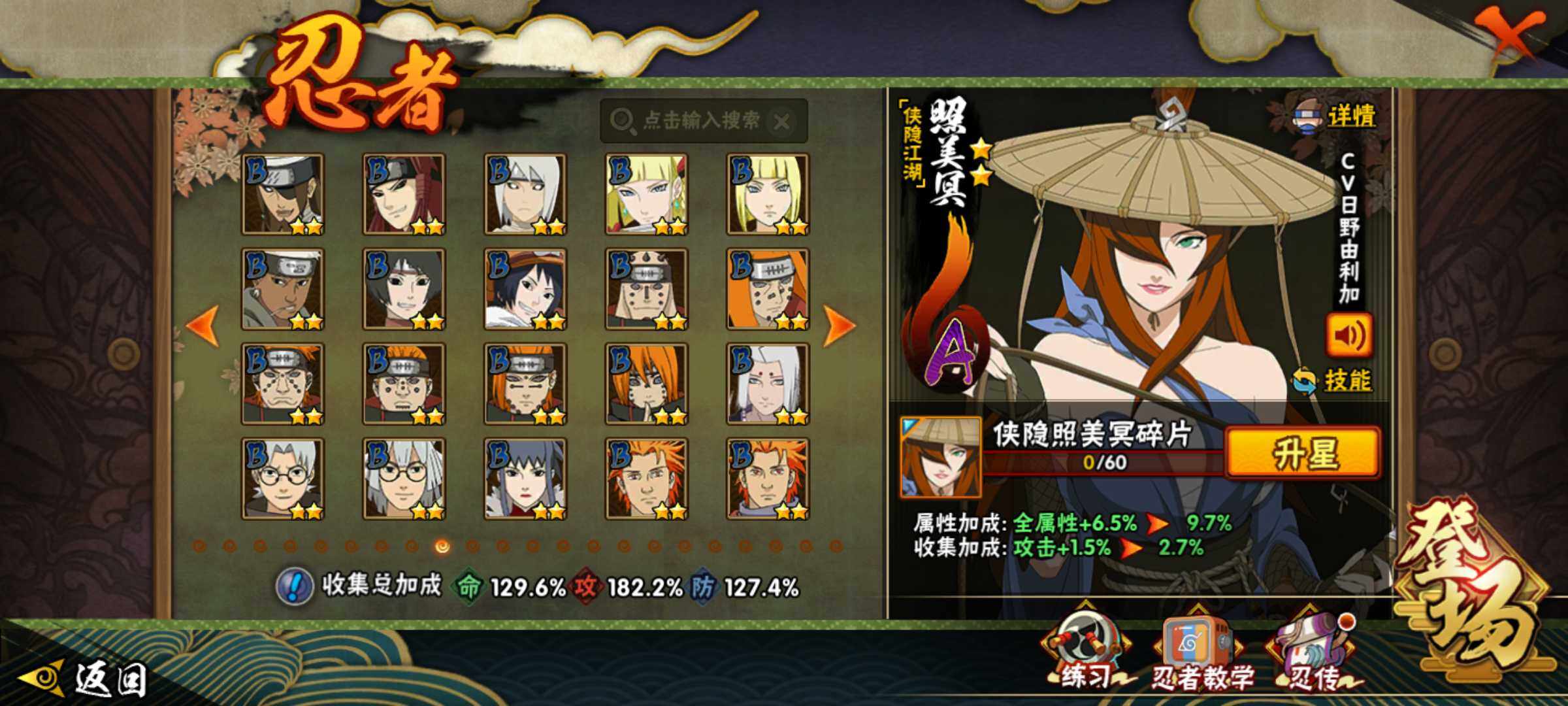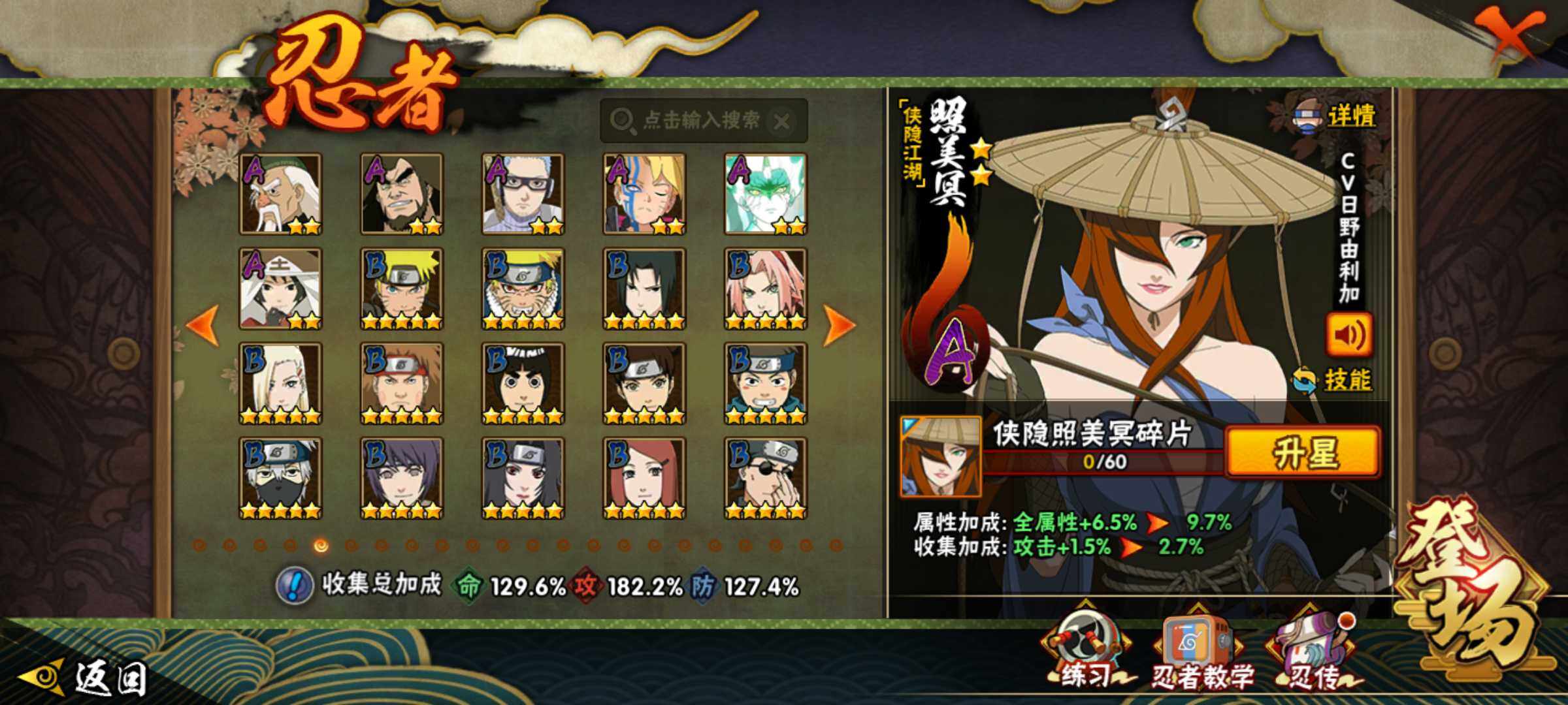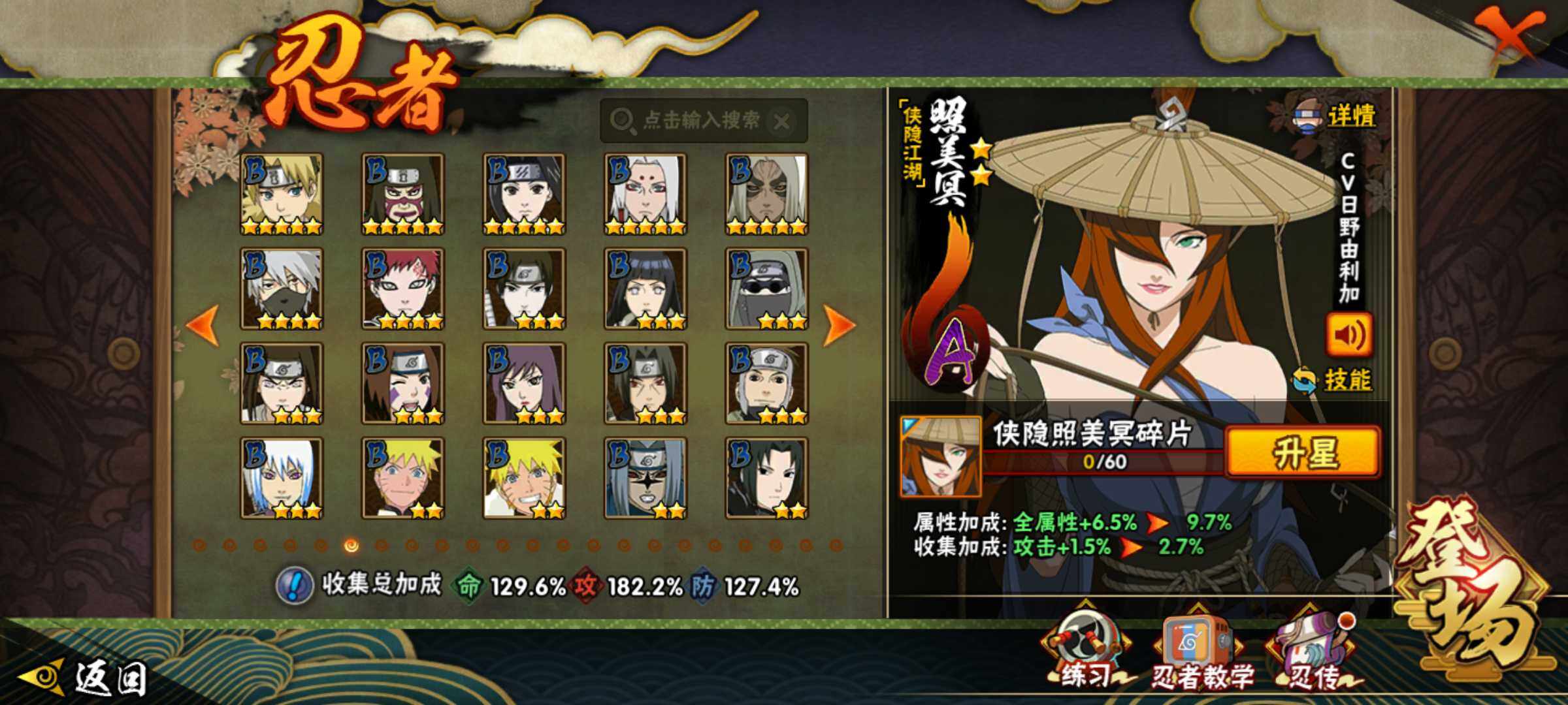【S级忍者】:长门「秽土转生」(3星),金角·银角「秽土转生」(3星),猿飞日斩「秽土转生」(3星),波风水门「秽土转生」(3星),宇智波斑「秽土转生·解」(3星),春野樱「忍界大战」(3星),宇智波鼬「须佐能乎」(4星),旗木卡卡西「须佐能乎」(3星),艾「四代目雷影」(3星),自来也(3星),自来也「舞之豪杰」(3星),大蛇丸(3星),自来也「传说中的