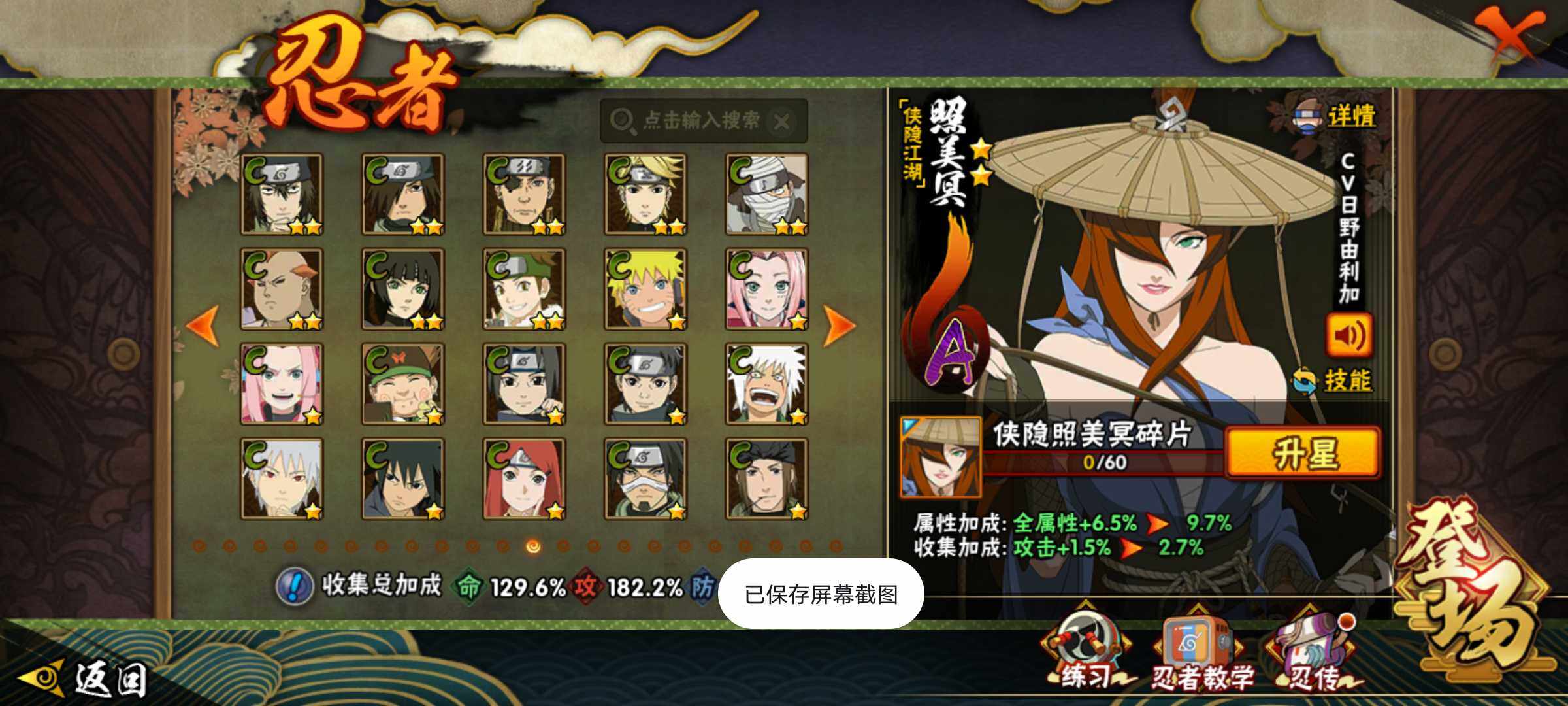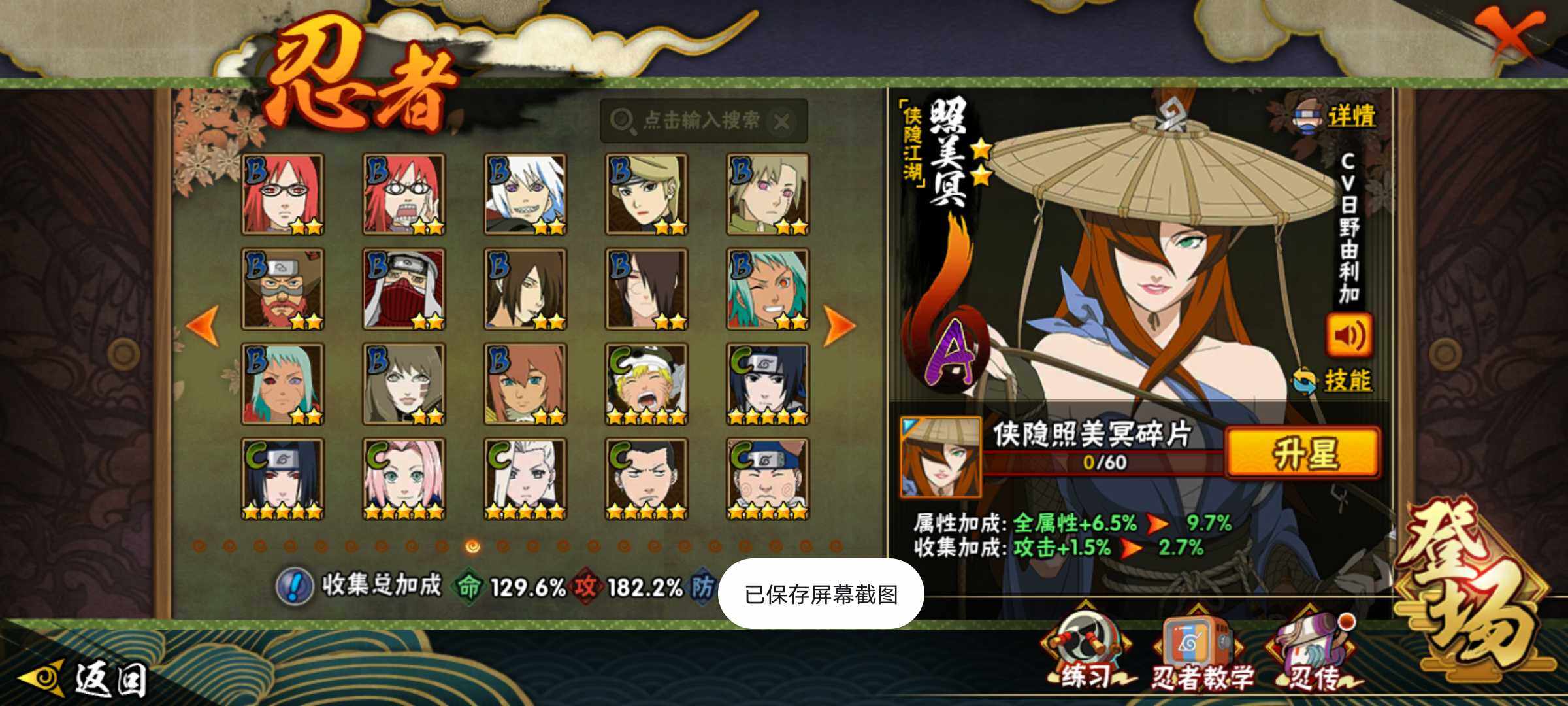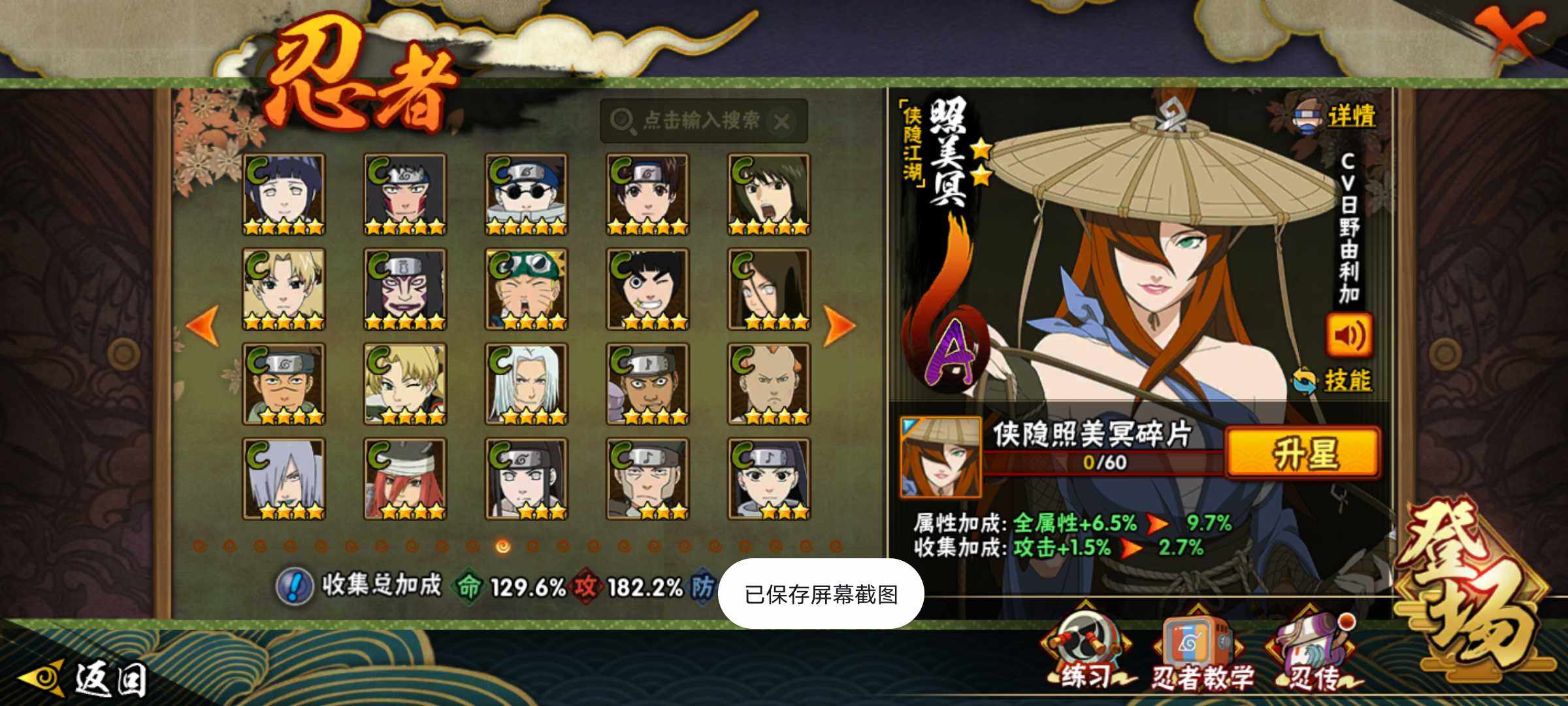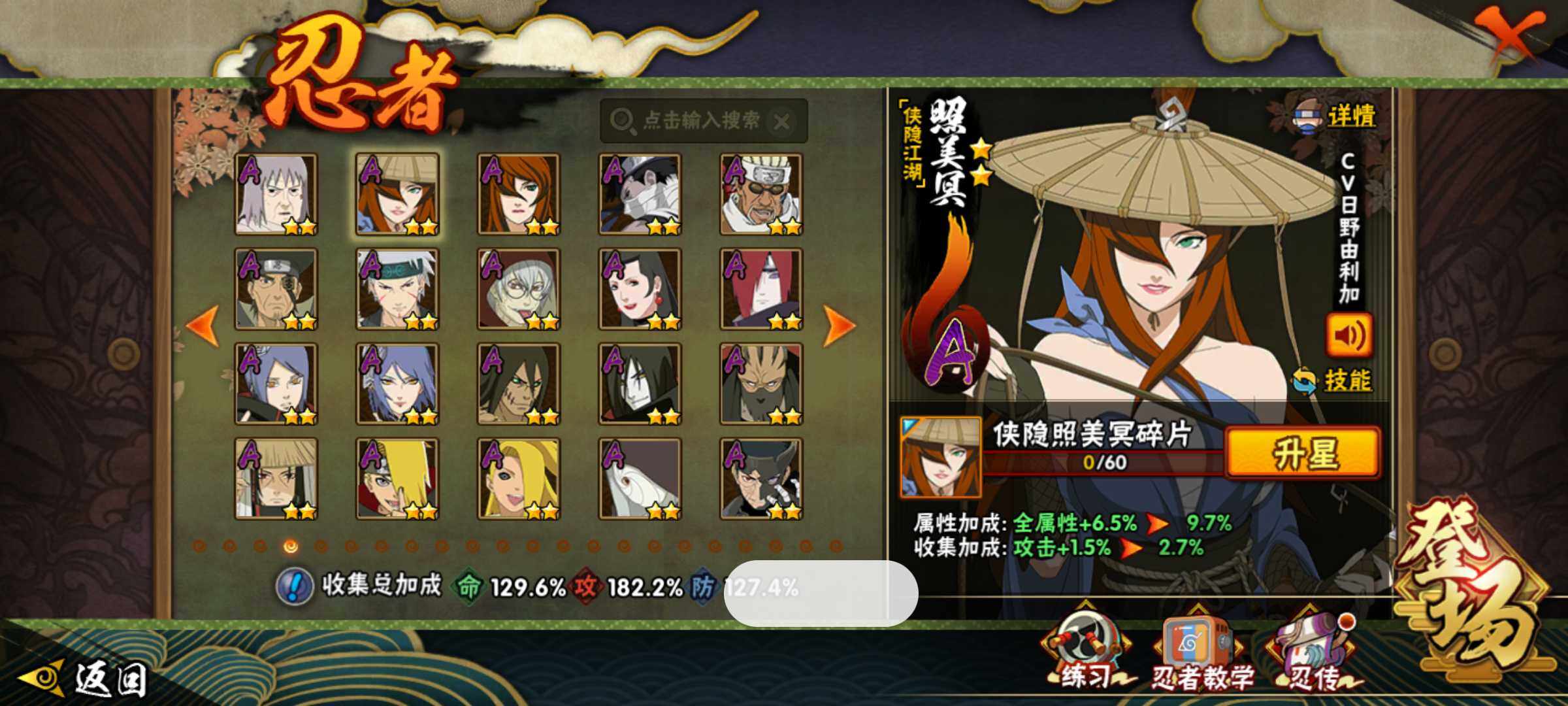 【S级忍者】:长门「秽土转生」(3星),金角·银角「秽土转生」(3星),猿飞日斩「秽土转生」(3星),波风水门「秽土转生」(3星),宇智波斑「秽土转生·解」(3星),春野樱「忍界大战」(3星),宇智波鼬「须佐能乎」(4星),旗木卡卡西「须佐能乎」(3星),艾「四代目雷影」(3星),自来也(3星),自来也「舞之豪杰」(3星),大蛇丸(3星),自来也「传说中的