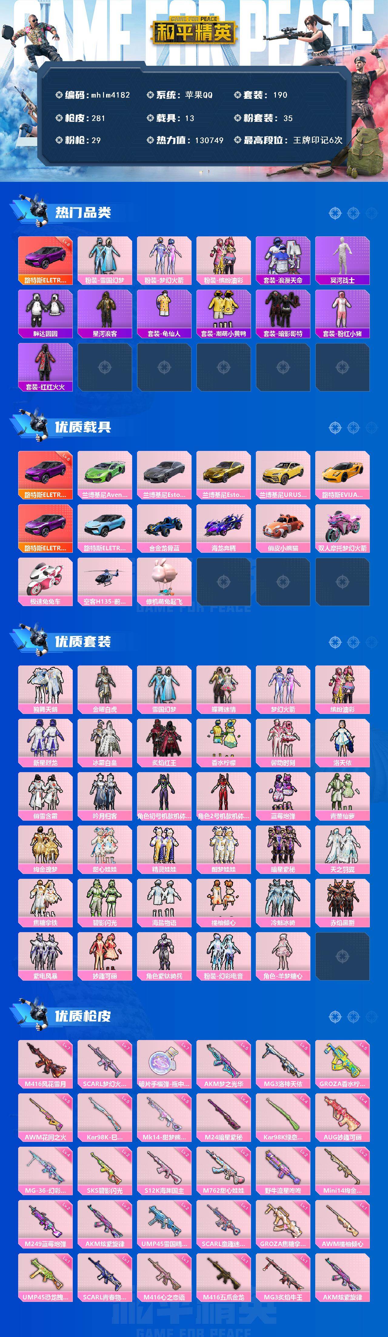【mhlm4182】苹果 手Q-35粉装-29特效枪-13载具-13粉色飞行器-130749热力值-6王牌印记-190套装-281枪皮