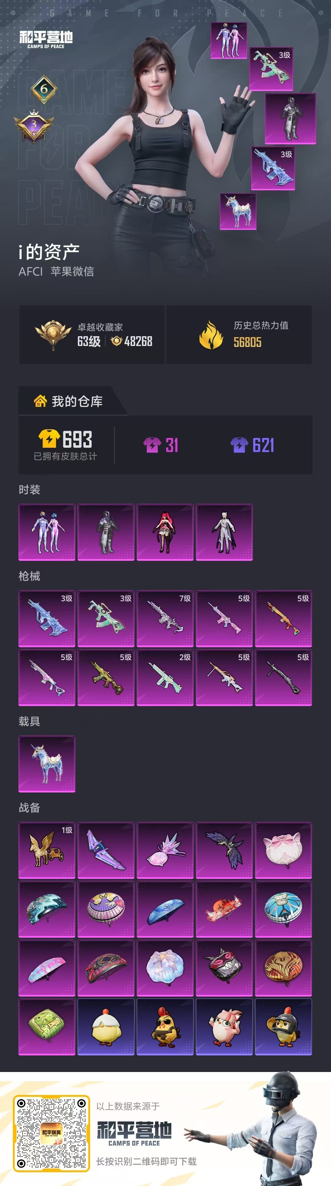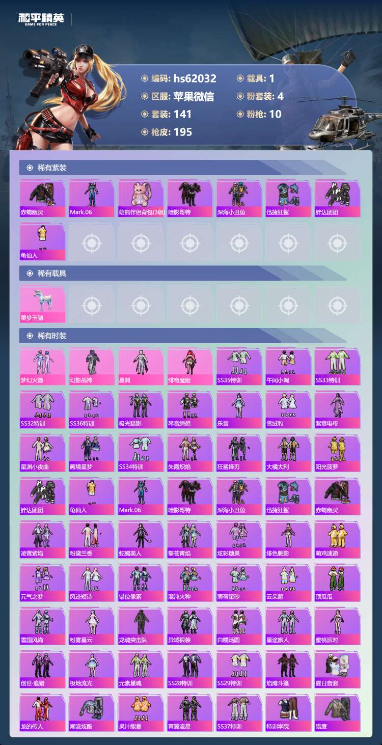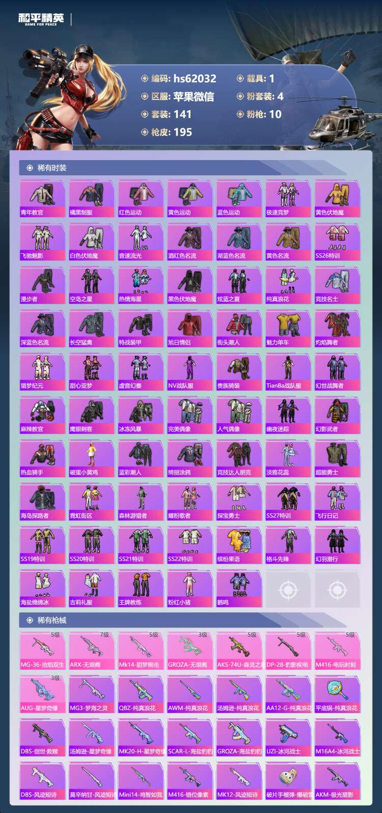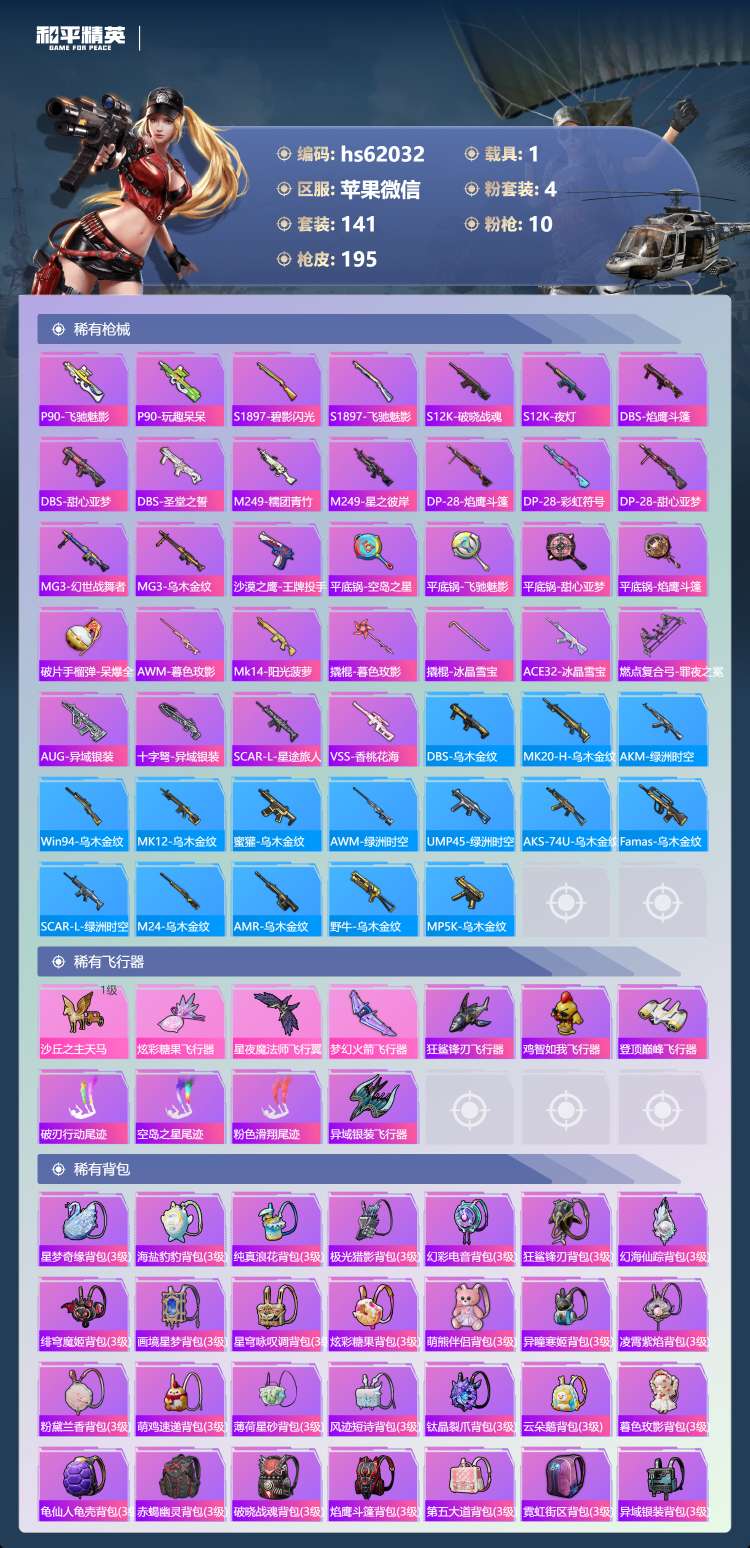 hs62032 苹果微-6王牌印记-4粉装-10特效枪-1载具-56805热力值-141套装-19