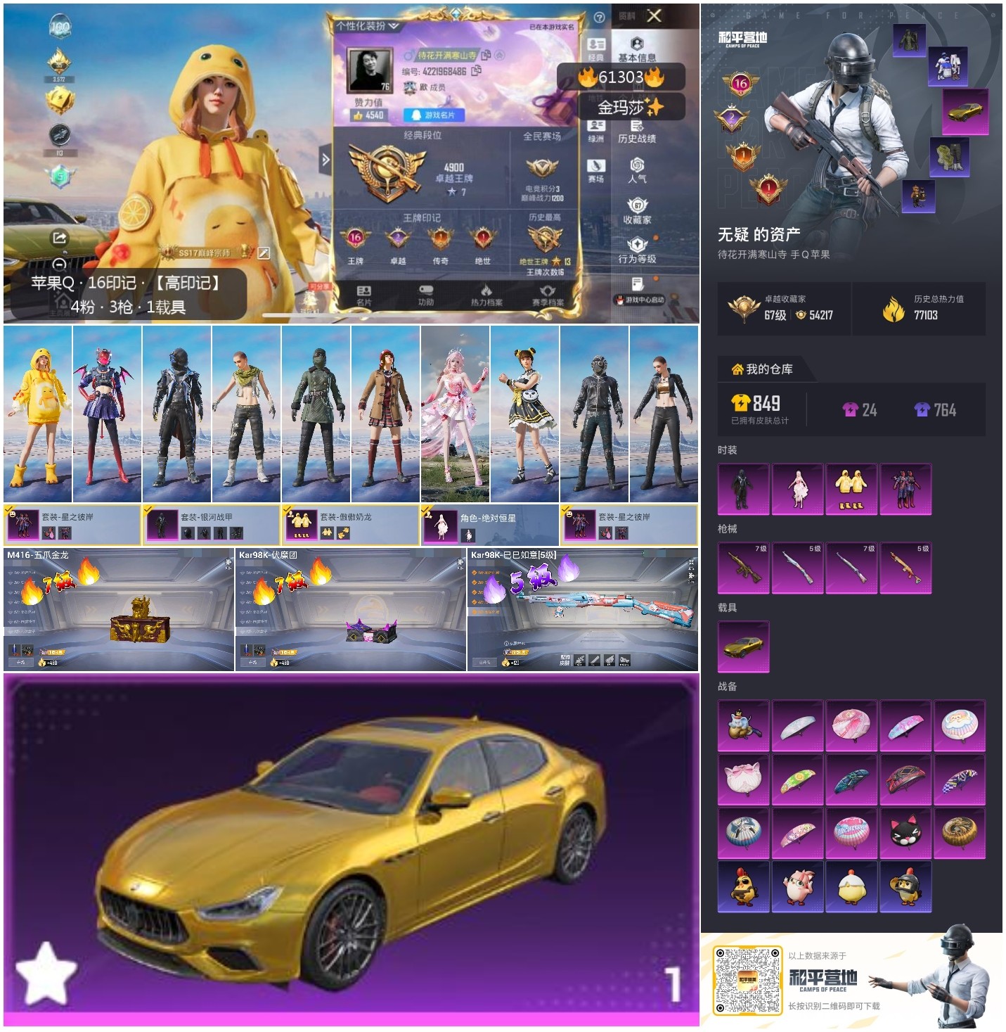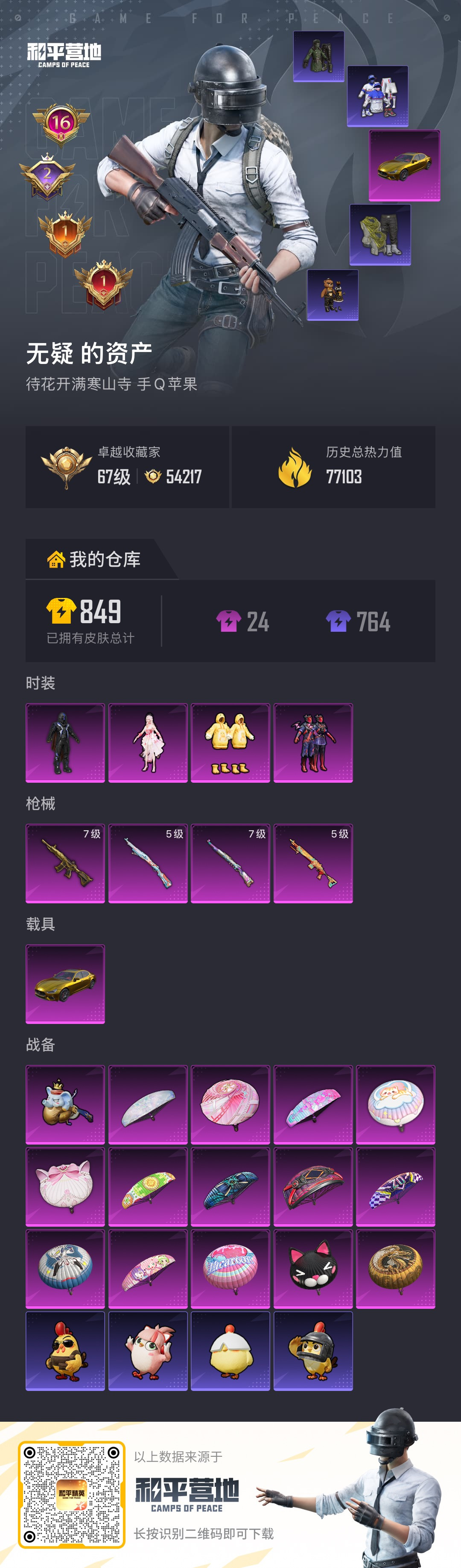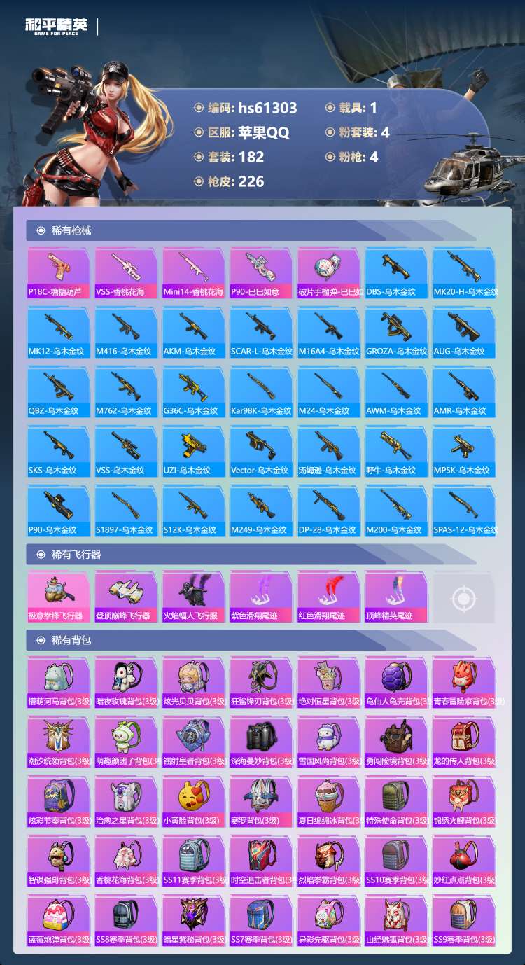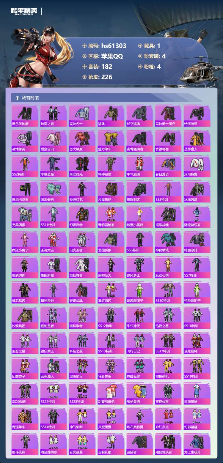 hs61303 苹果手Q-16王牌印记-4粉装-4特效枪-1载具-77103热力值-182套装-22