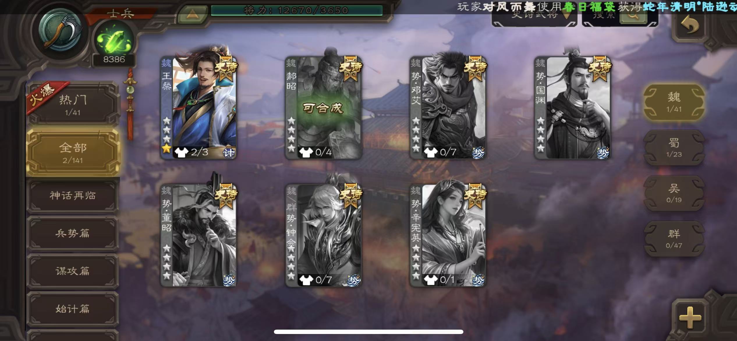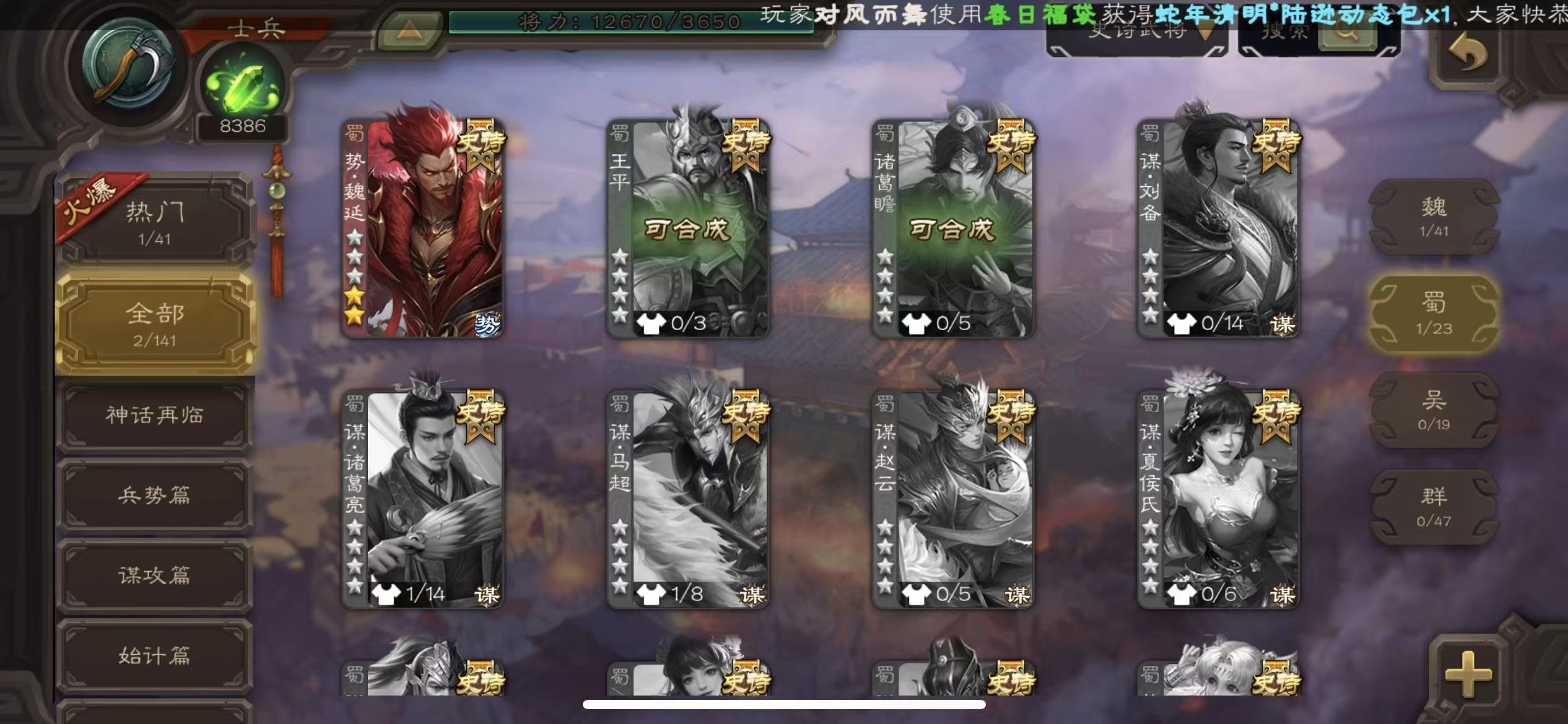 士兵火龙果势魏延8300将魂6.8万羽毛136招募令三卡
