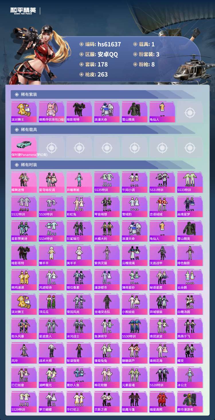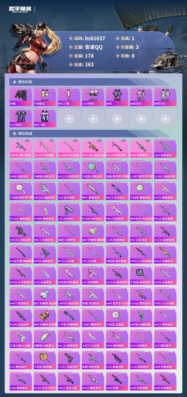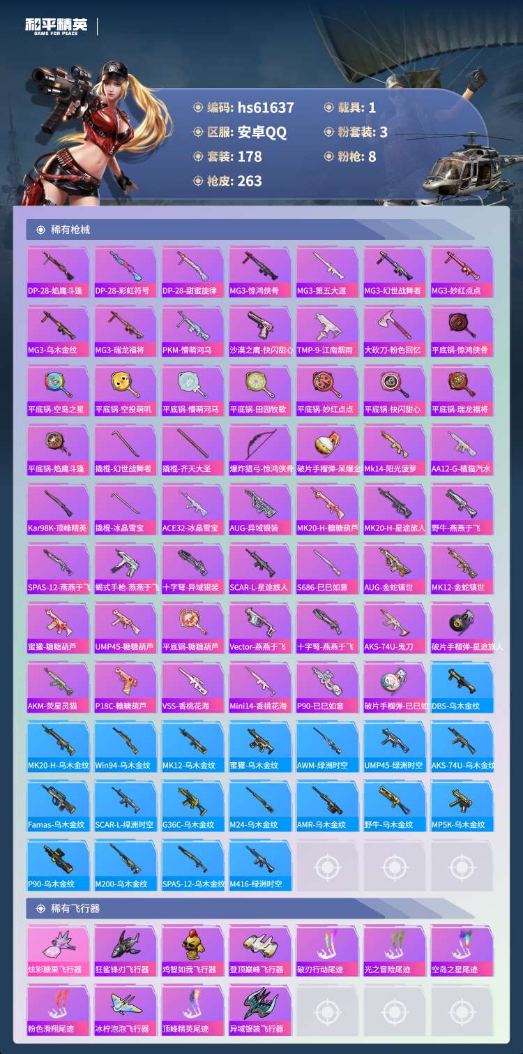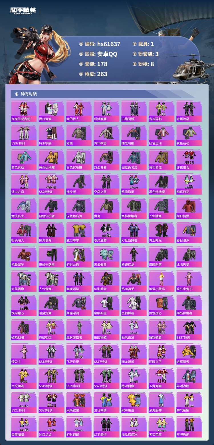 hs61637 安卓手Q-19王牌印记-3粉装-8特效枪-1载具-74341热力值-178套装-26