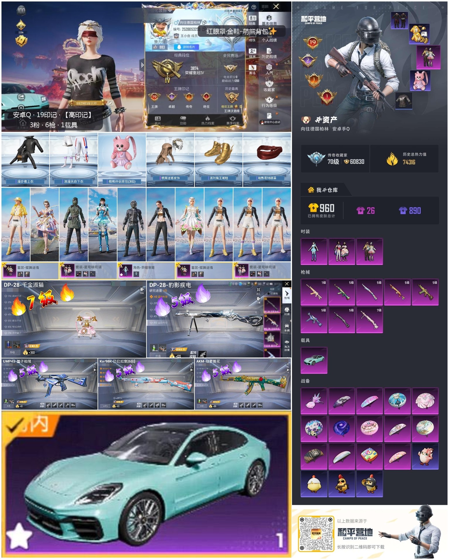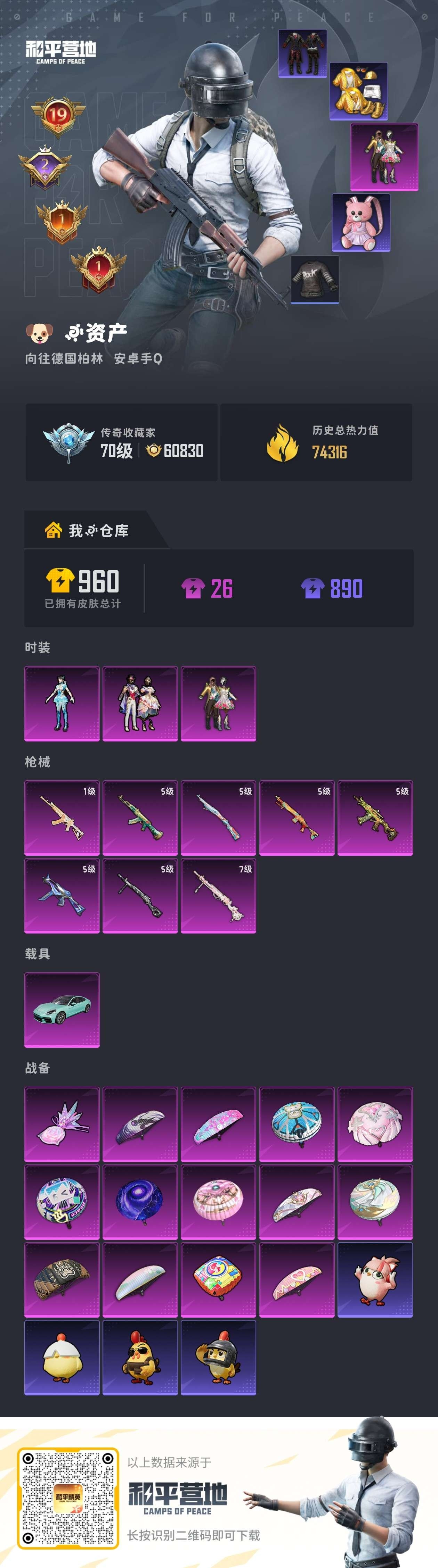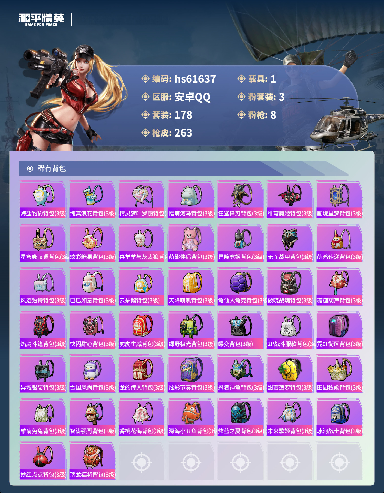 hs61637 安卓手Q-19王牌印记-3粉装-8特效枪-1载具-74341热力值-178套装-26
