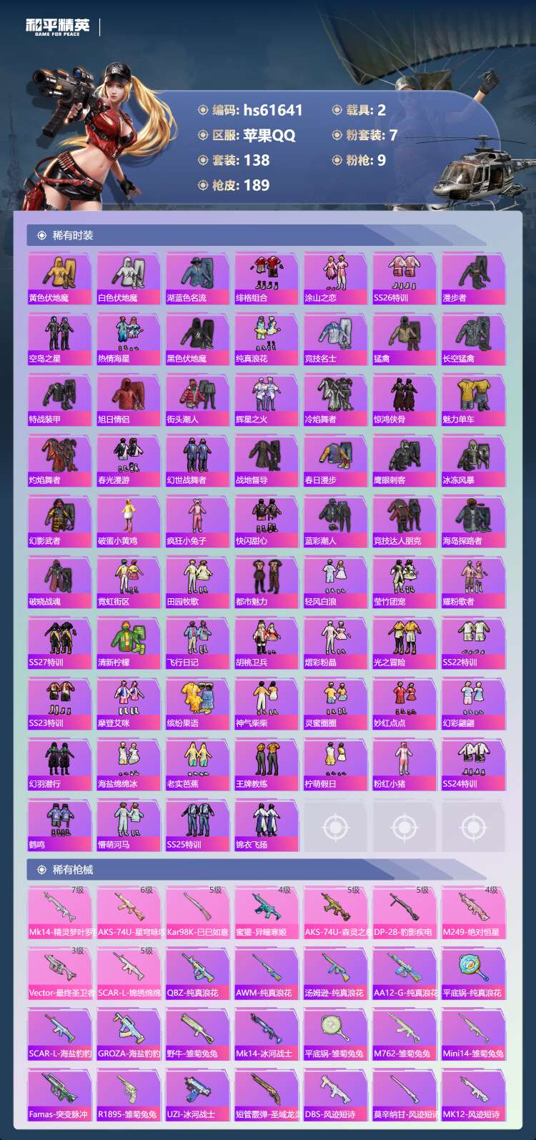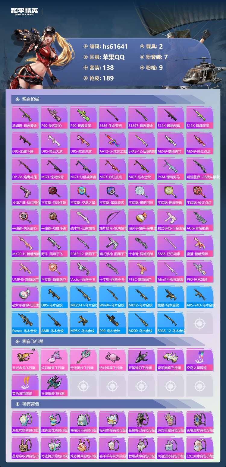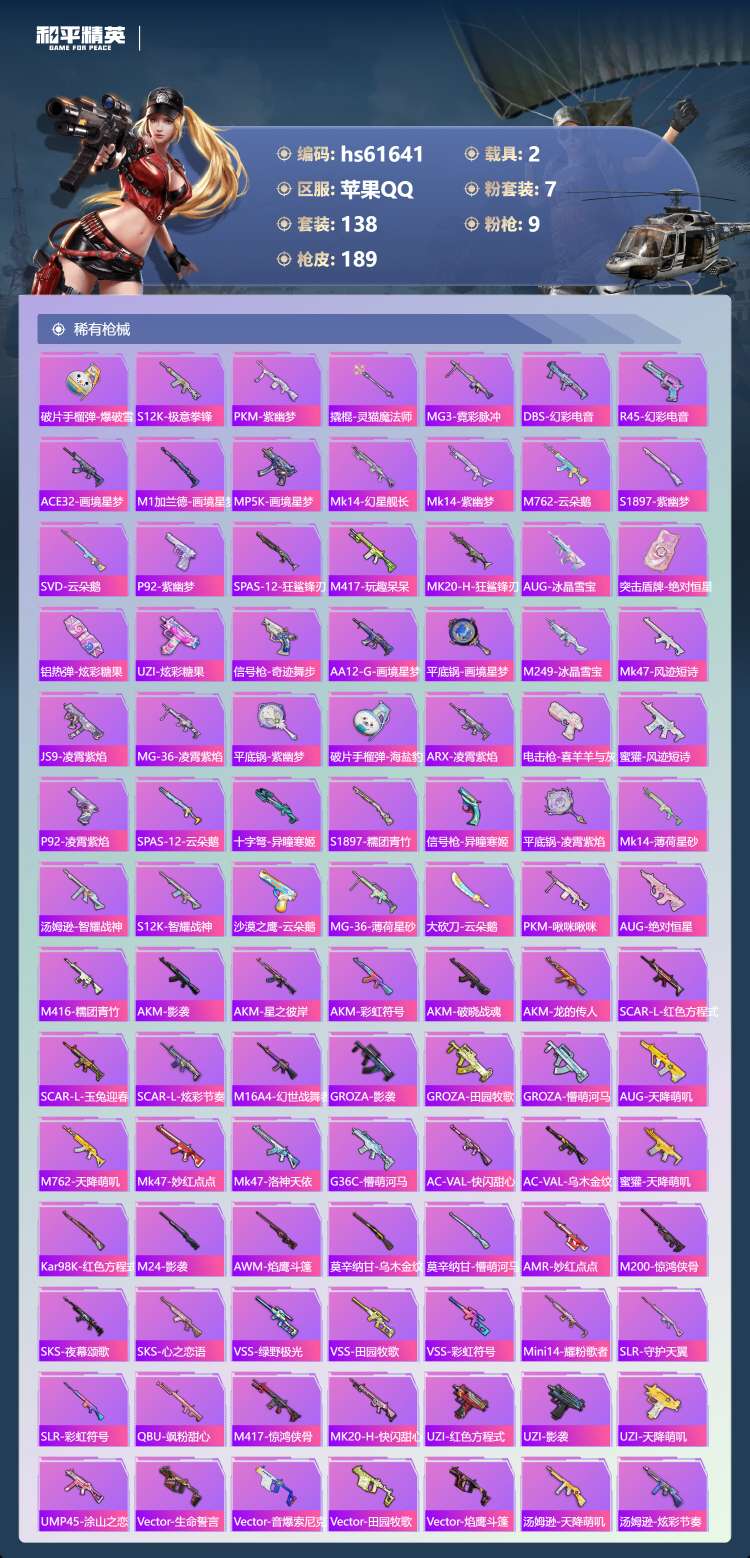 hs61641 苹果手Q-16王牌印记-7粉装-9特效枪-2载具-58267热力值-138套装-18