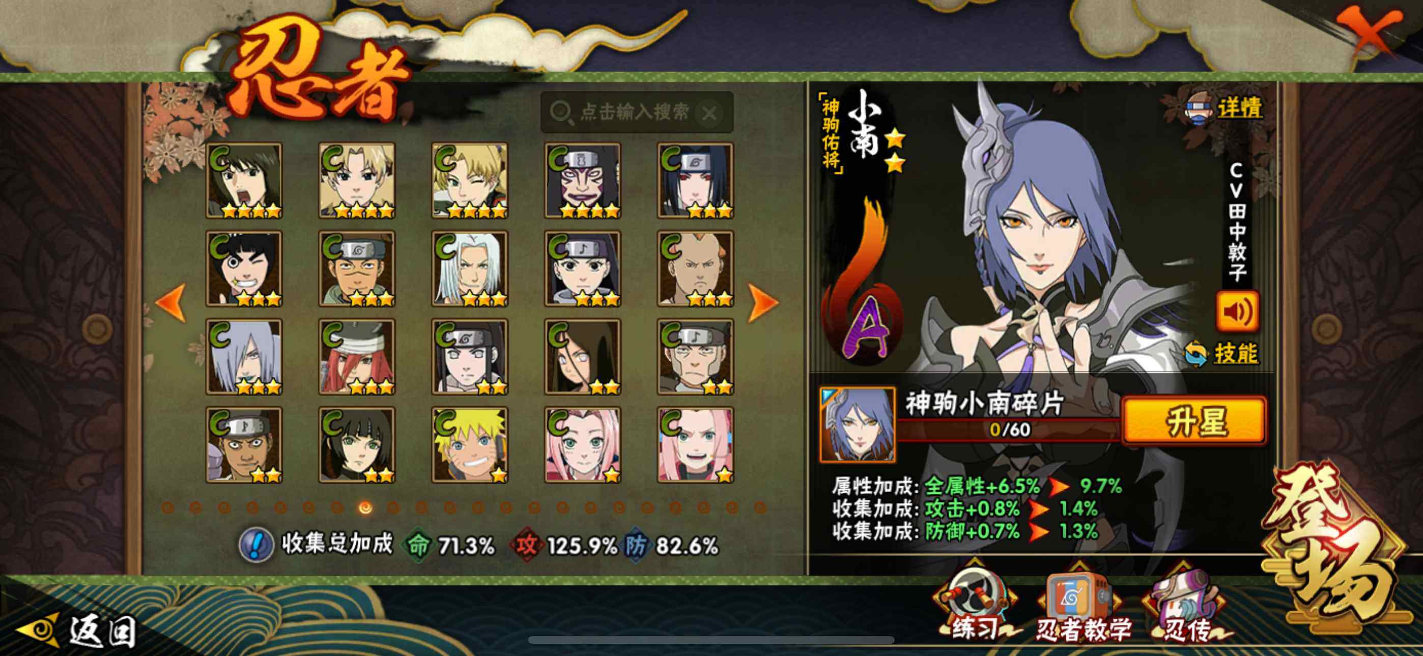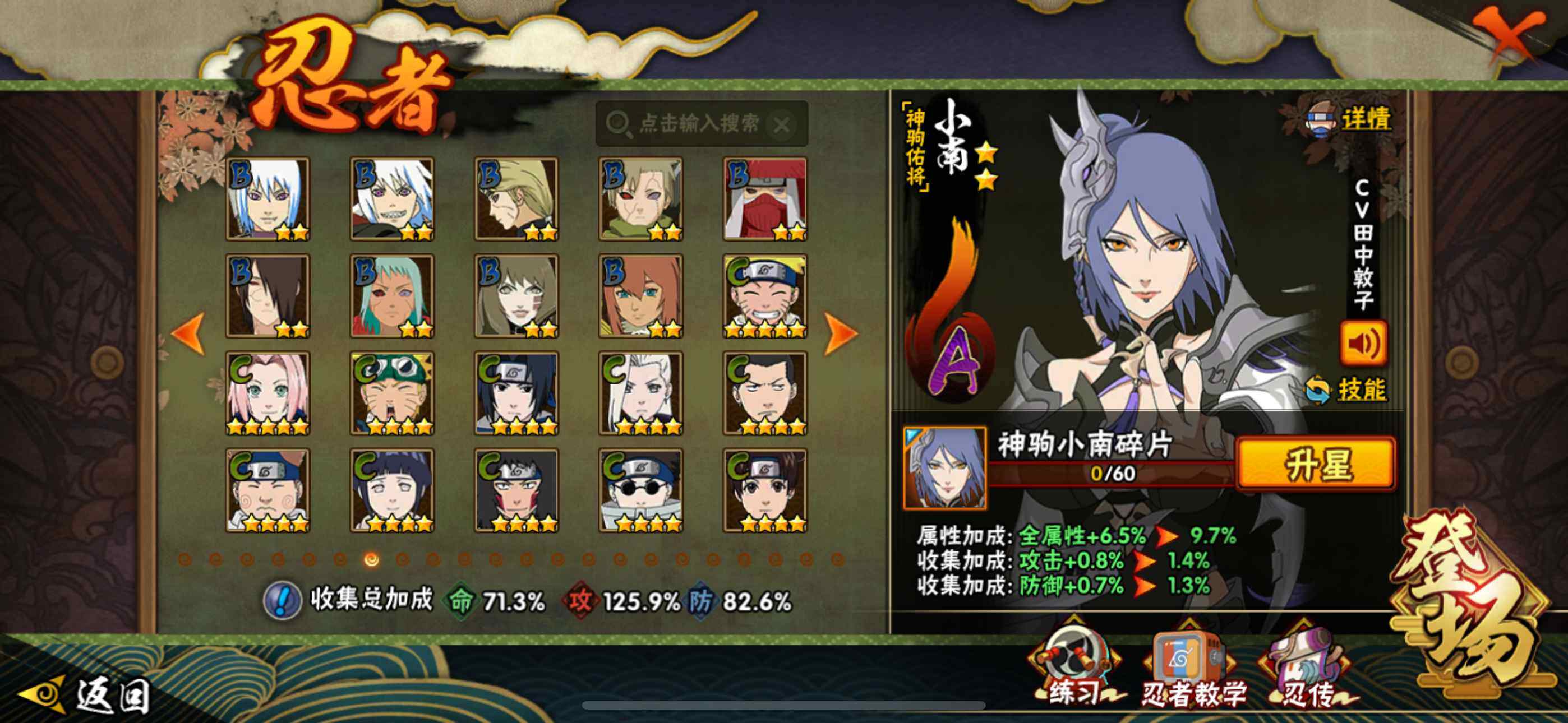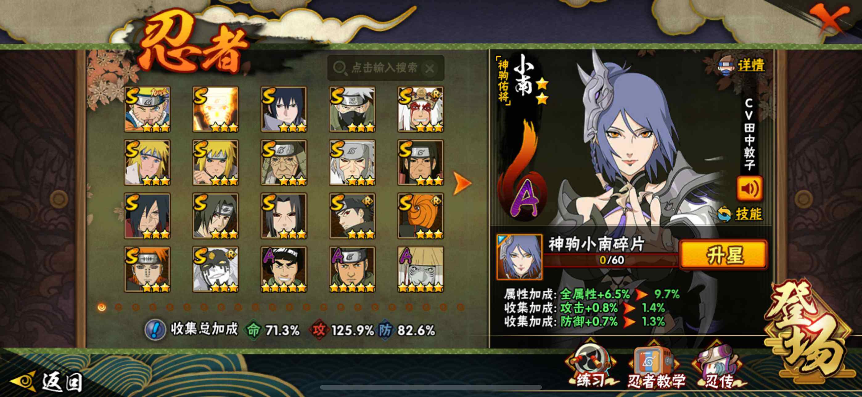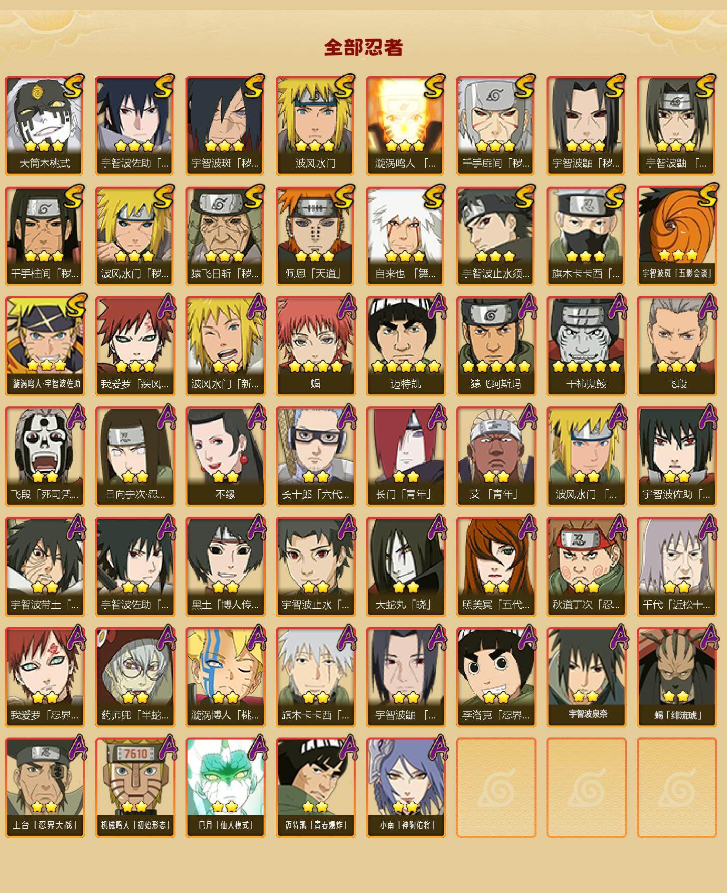 【S级忍者】:猿飞日斩「秽土转生」(3星),波风水门「秽土转生」(3星),千手扉间「秽土转生」(3星),千手柱间「秽土转生」(3星),宇智波鼬「秽土转生」(3星),宇智波斑「秽土转生·解」(3星),宇智波鼬「须佐能乎」(3星),宇智波止水「须佐能乎」(3星),旗木卡卡西「须佐能乎」(3星),自来也「舞之豪杰」(3星),波风水门(3星),漩涡鸣人「九喇嘛连结