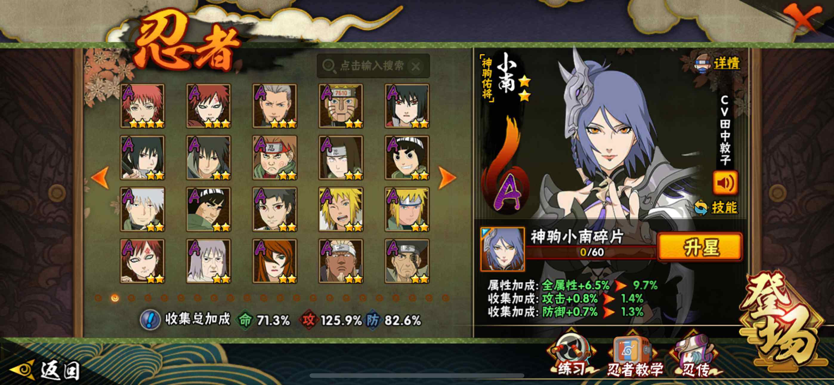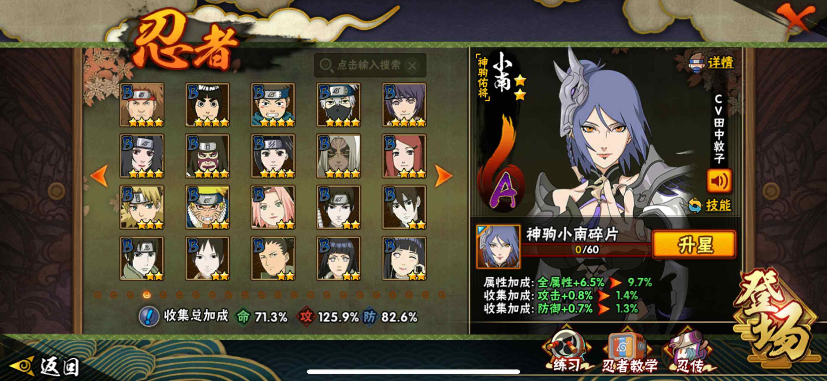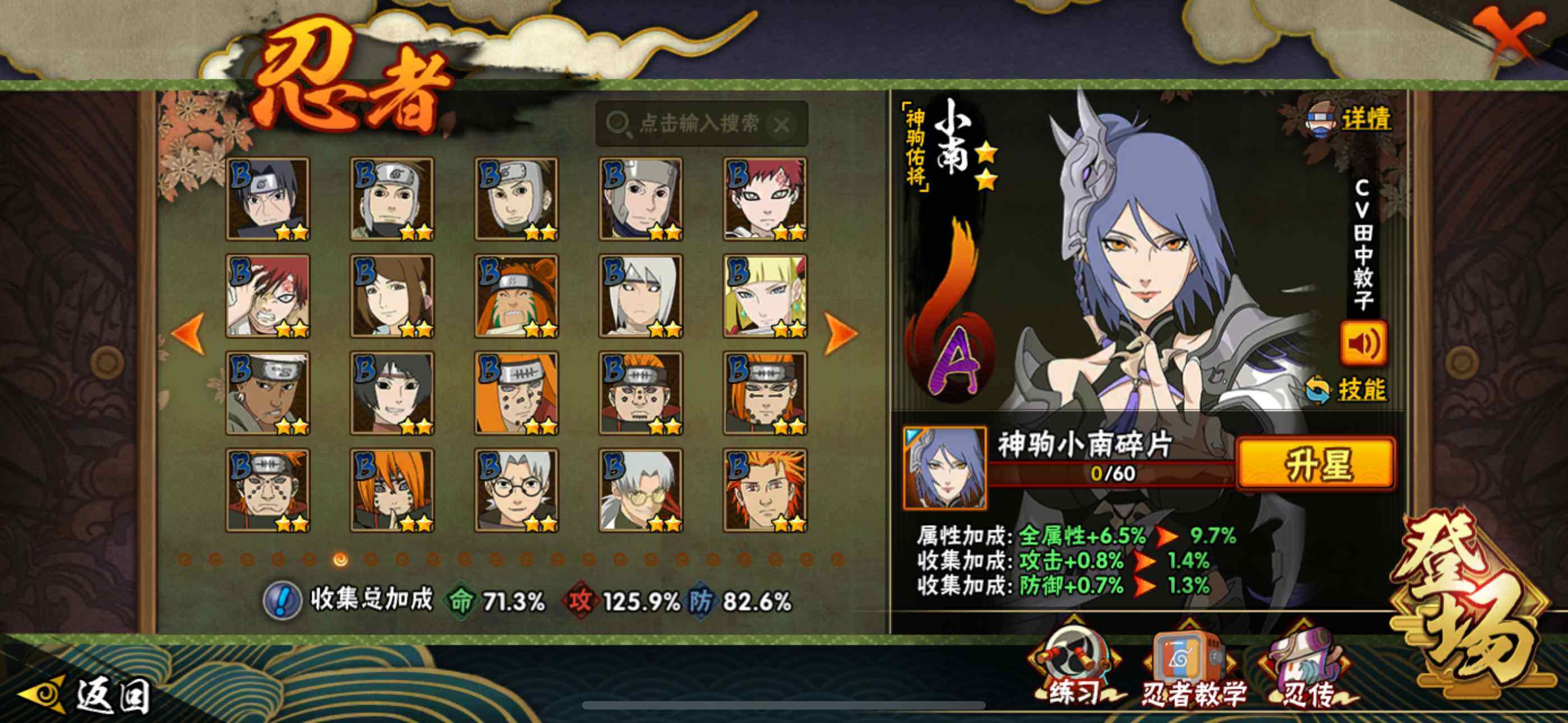 【S级忍者】:猿飞日斩「秽土转生」(3星),波风水门「秽土转生」(3星),千手扉间「秽土转生」(3星),千手柱间「秽土转生」(3星),宇智波鼬「秽土转生」(3星),宇智波斑「秽土转生·解」(3星),宇智波鼬「须佐能乎」(3星),宇智波止水「须佐能乎」(3星),旗木卡卡西「须佐能乎」(3星),自来也「舞之豪杰」(3星),波风水门(3星),漩涡鸣人「九喇嘛连结