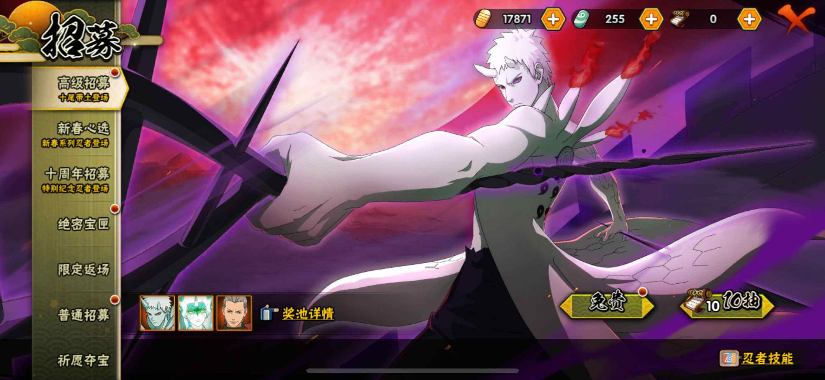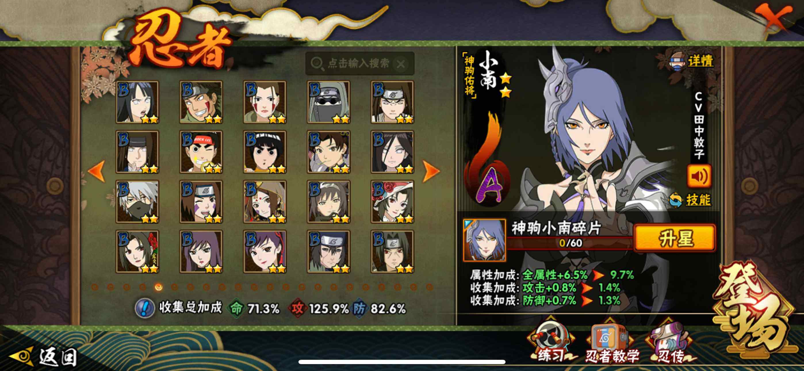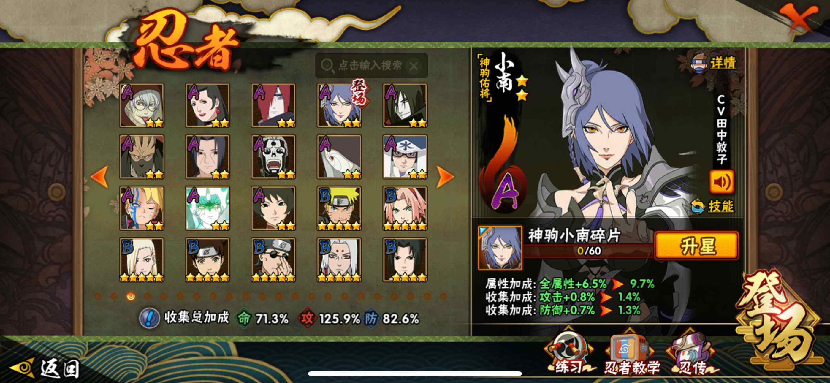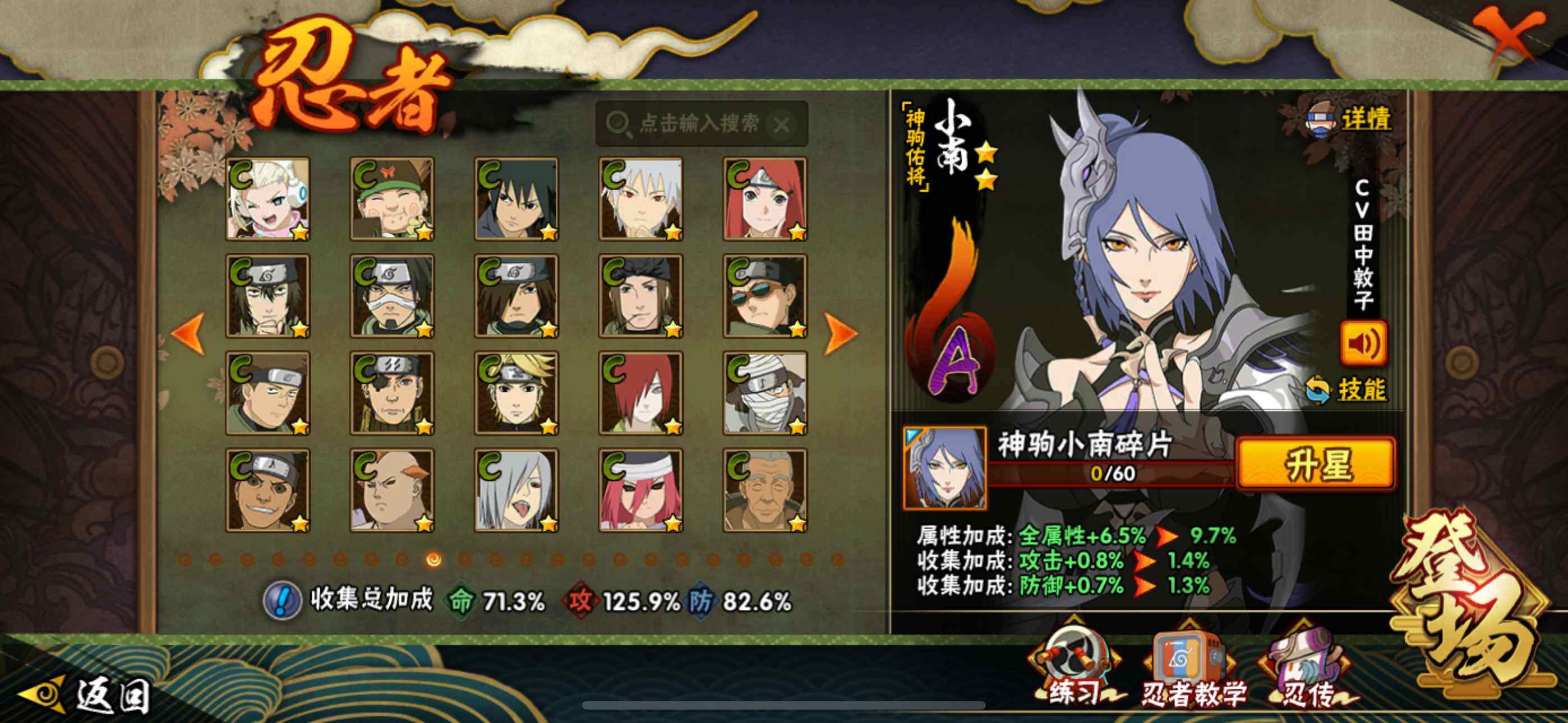 【S级忍者】:猿飞日斩「秽土转生」(3星),波风水门「秽土转生」(3星),千手扉间「秽土转生」(3星),千手柱间「秽土转生」(3星),宇智波鼬「秽土转生」(3星),宇智波斑「秽土转生·解」(3星),宇智波鼬「须佐能乎」(3星),宇智波止水「须佐能乎」(3星),旗木卡卡西「须佐能乎」(3星),自来也「舞之豪杰」(3星),波风水门(3星),漩涡鸣人「九喇嘛连结