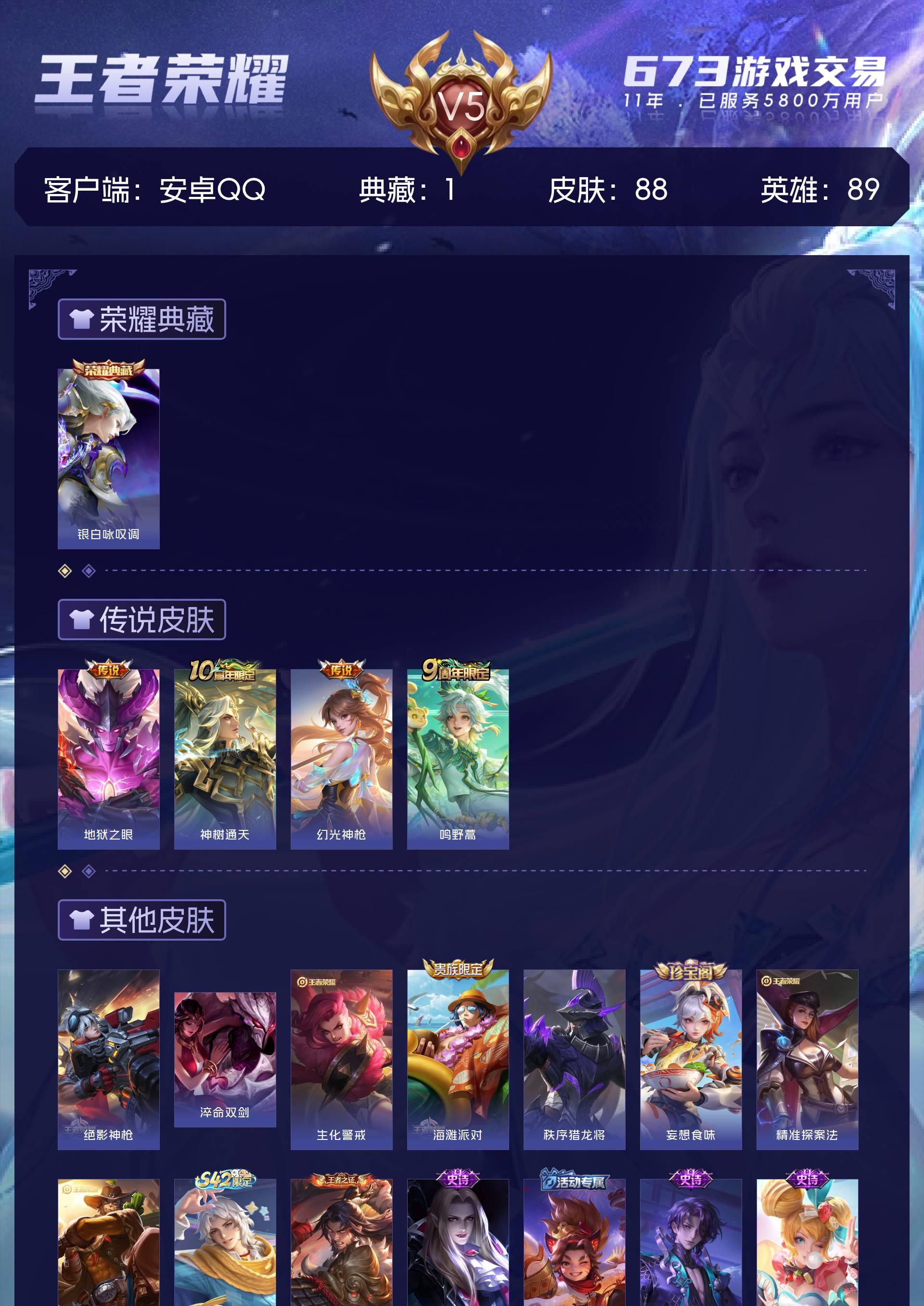 V5 皮肤88 英雄89 至尊星耀 荣耀典藏1 传说4 其他皮肤87