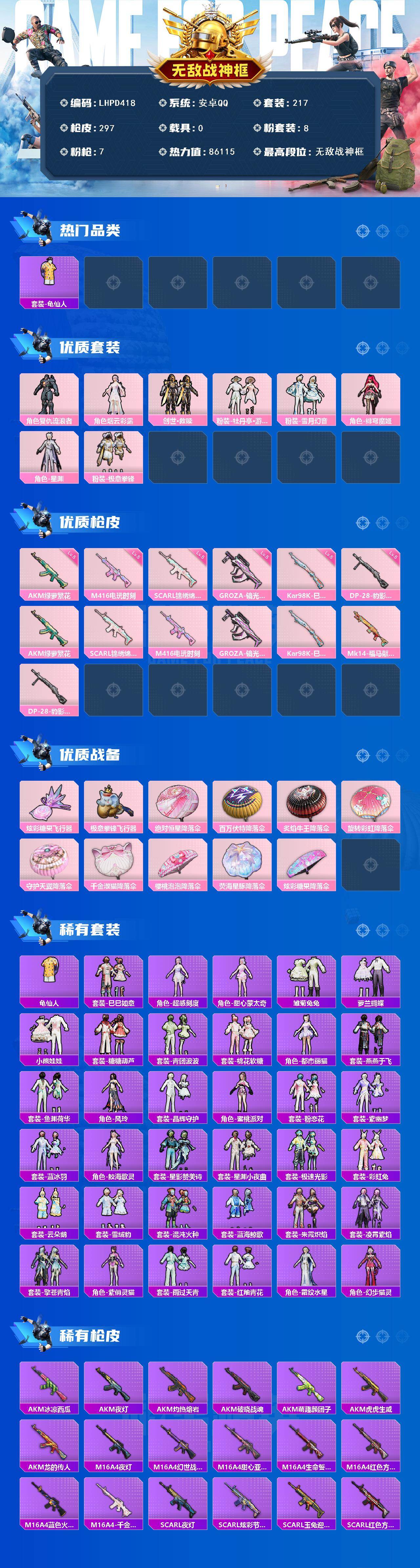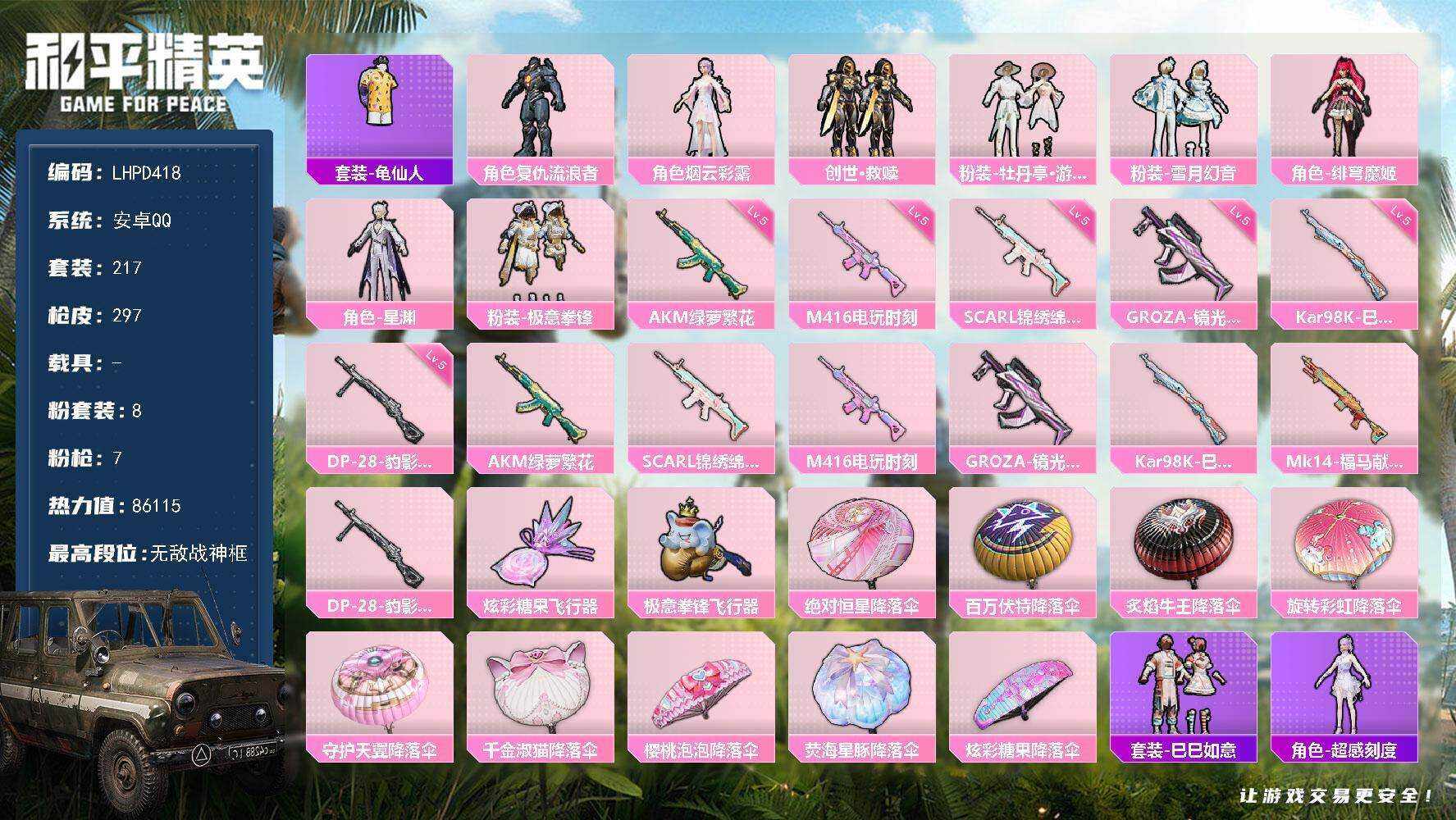 【店主推荐捡漏号!可直接换绑】安卓 手Q-无敌战神框-8粉装-7特效枪-0载具-2粉色飞行器-86115热力值-19王牌印记-217套装-297枪皮【热门品类】:套装-龟仙人【粉色套装】:角色-复仇流浪者,角色-烟云彩露,套装-创世·救赎,粉装-牡丹亭·游园,粉装-雪月幻音,角色-绯穹魔姬,角色-星渊,粉装-极意拳锋【粉色枪皮等级】:AKM-绿萝繁花(五级),SCAR-L-锦绣绵绵(五级),M4