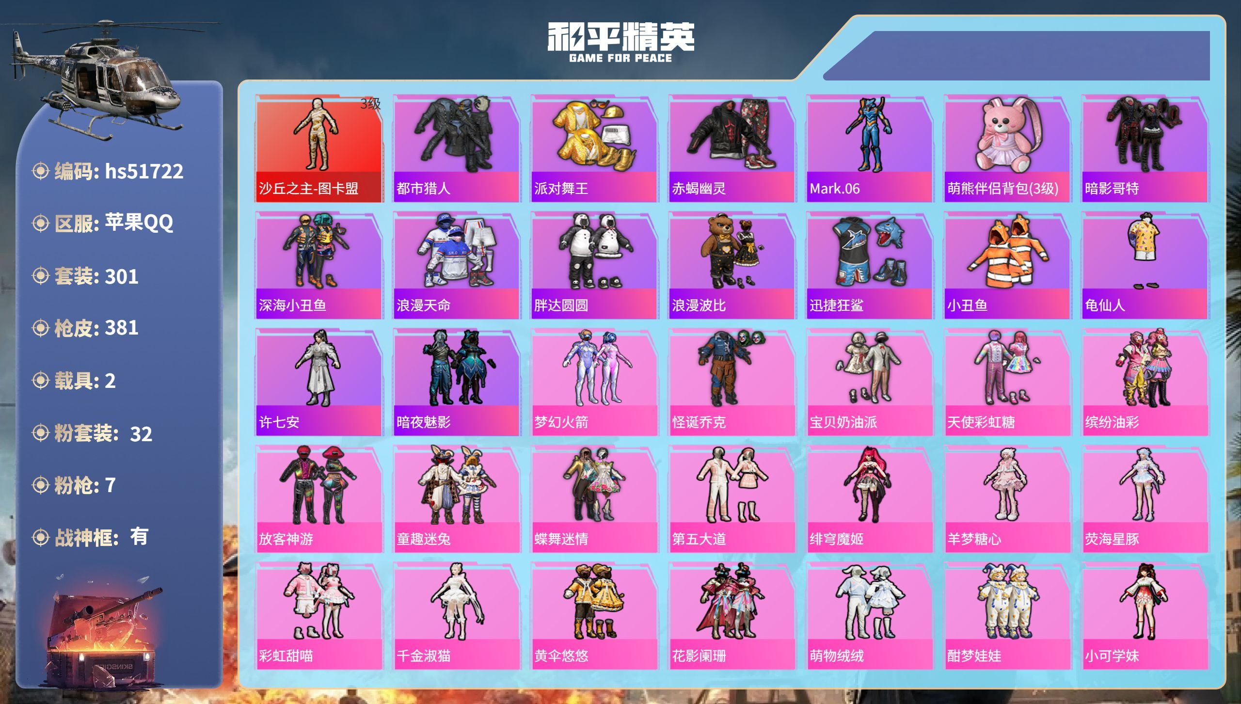 【木乃伊紫螳螂黑丝冰雪女王14载具30粉装12特效枪身法素材号 秒换绑不用等】 苹果Q区-124983热力值-15印记-190套装-265枪皮 【14载具】 玛莎拉蒂粉色 护世瑞兽 玛莎拉蒂金色 兰博轿车尊享铂 兰博SUV黄色 特斯拉R水滴蓝 特斯拉R沁心粉 合金龙骨蓝色 焰龙咆哮 海龙奔腾 萌喵橘座 空客蔚蓝之翼僚机 双人摩托梦幻火箭 兰博SVJ炫光金【3稀有】 木乃伊 沙漠守护者【30粉装】 初号机款机体服(紫螳螂) 林间仙鹿 梦幻火箭 雪国幻梦(冰雪女王) 宝贝奶油派 天使彩虹糖 甜心巧克
