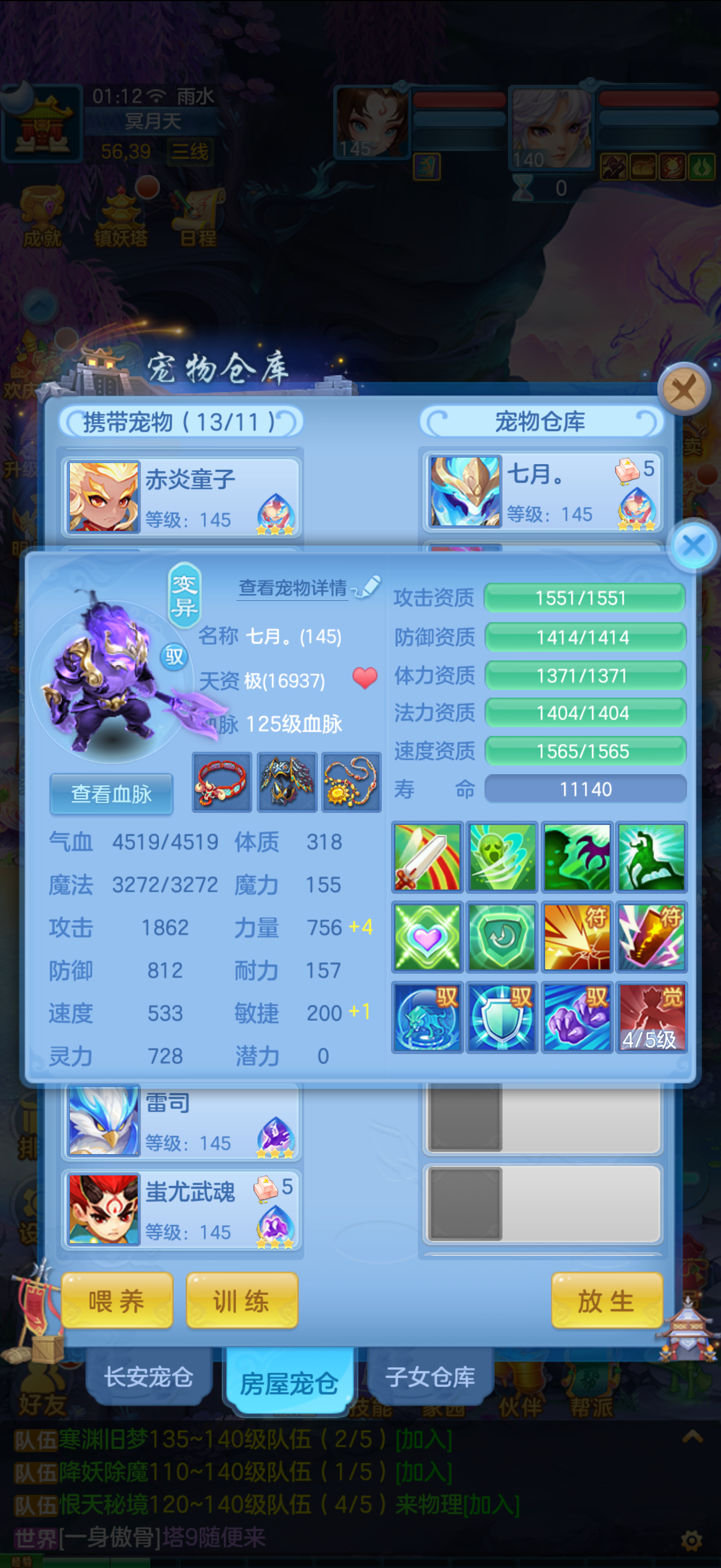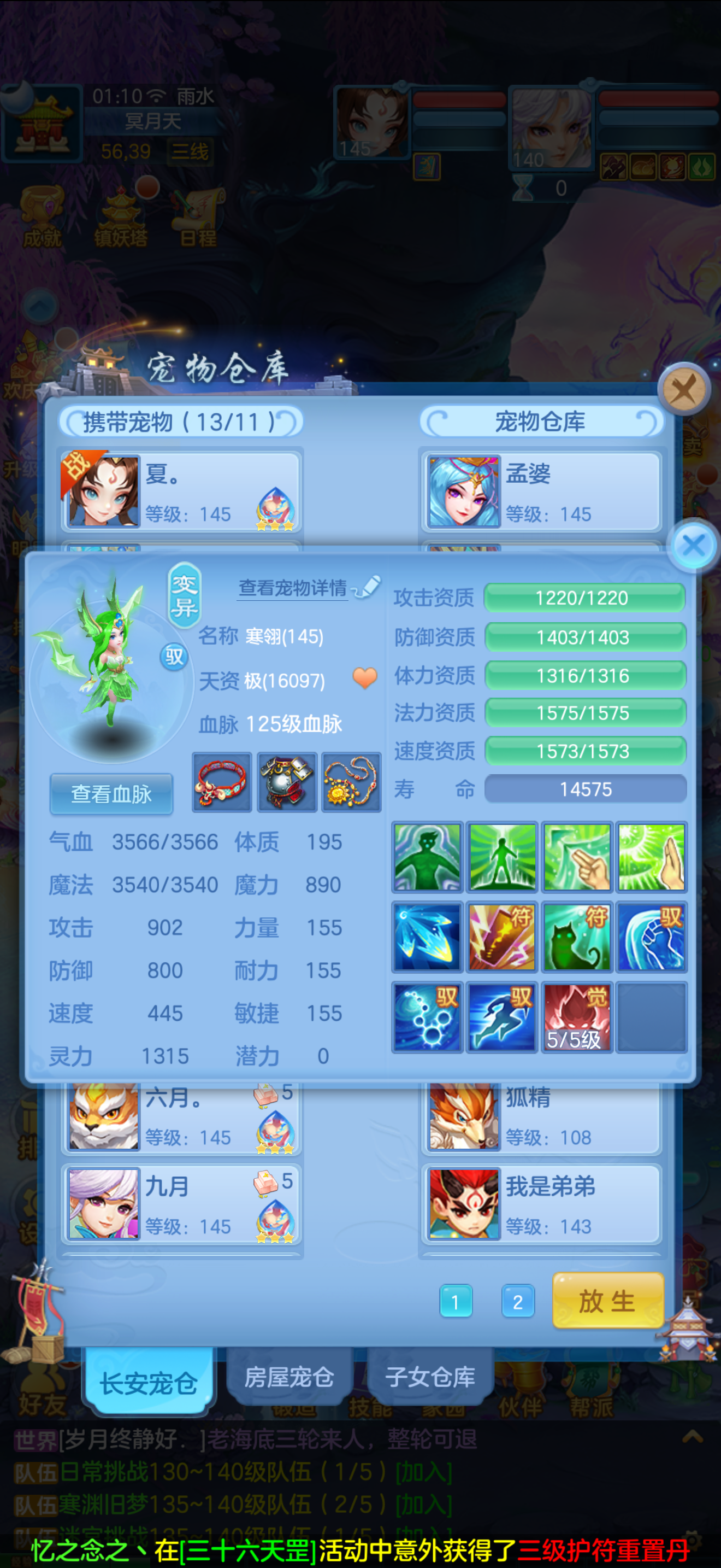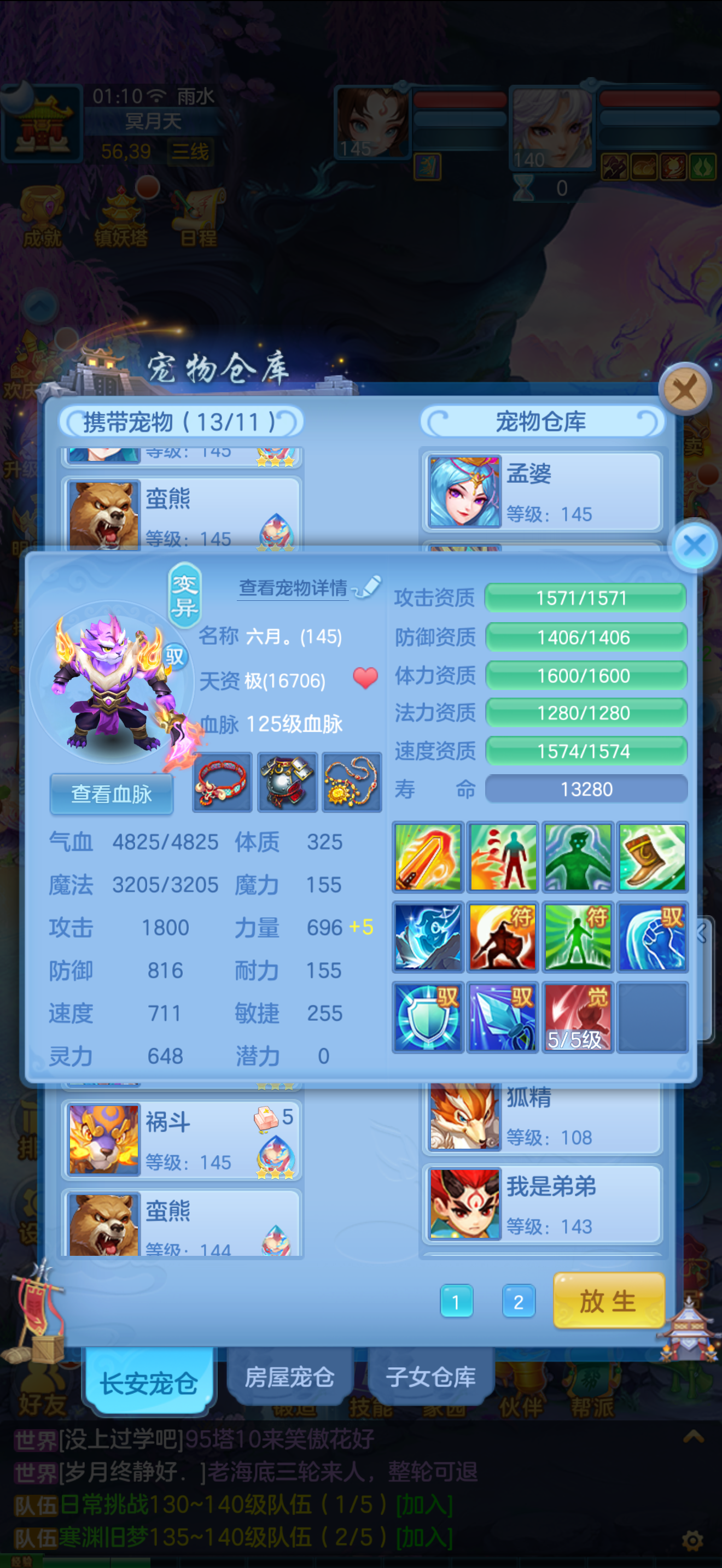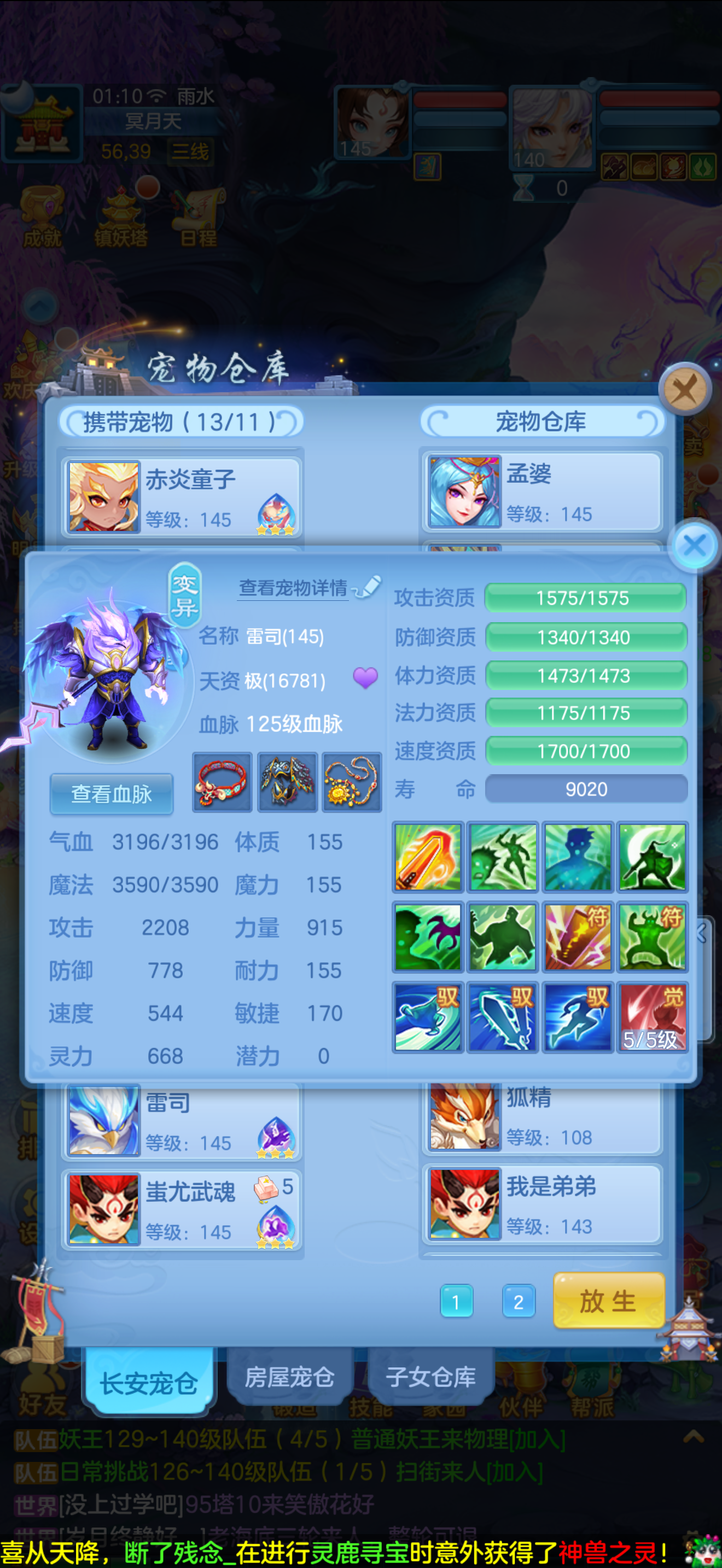 1个神兽,10个6技能,13个特殊5技能,满强身满修