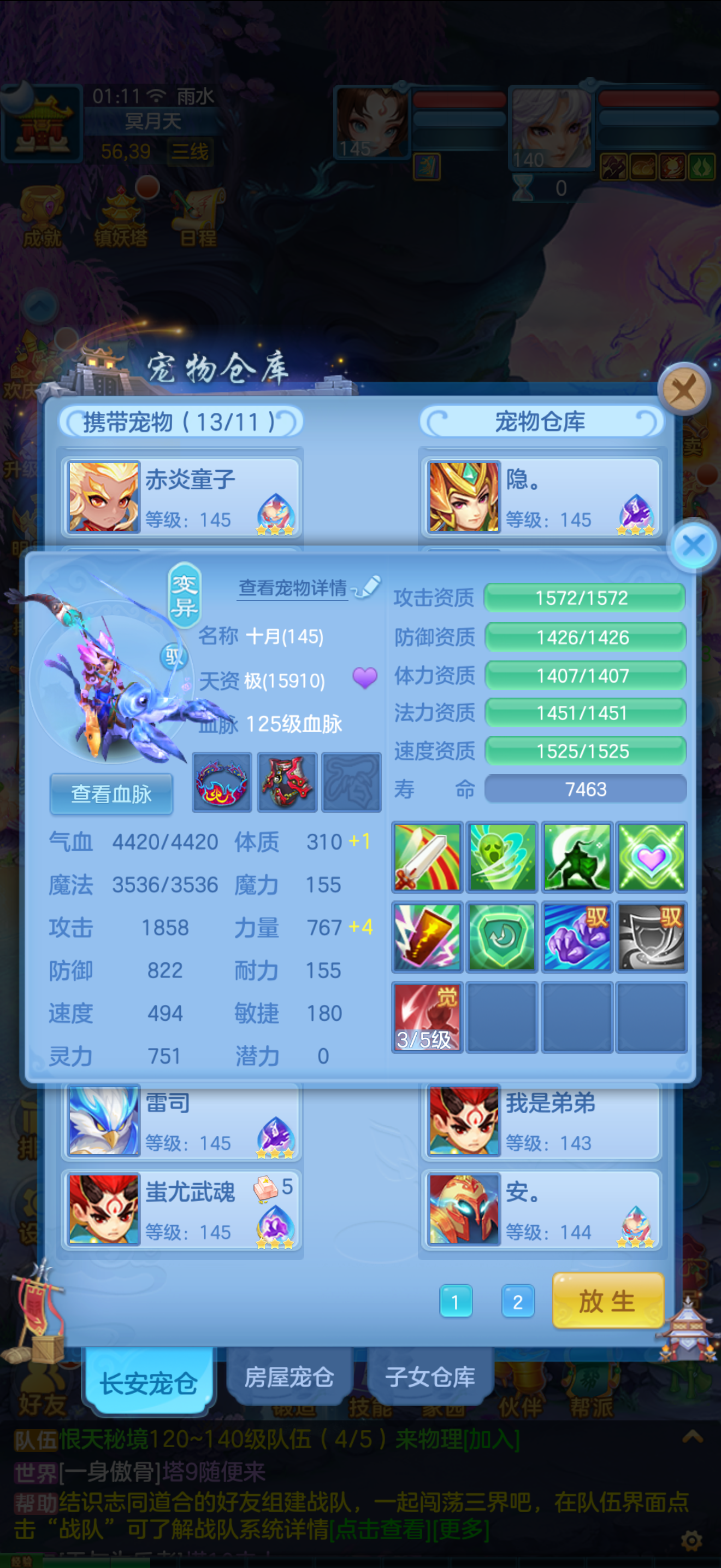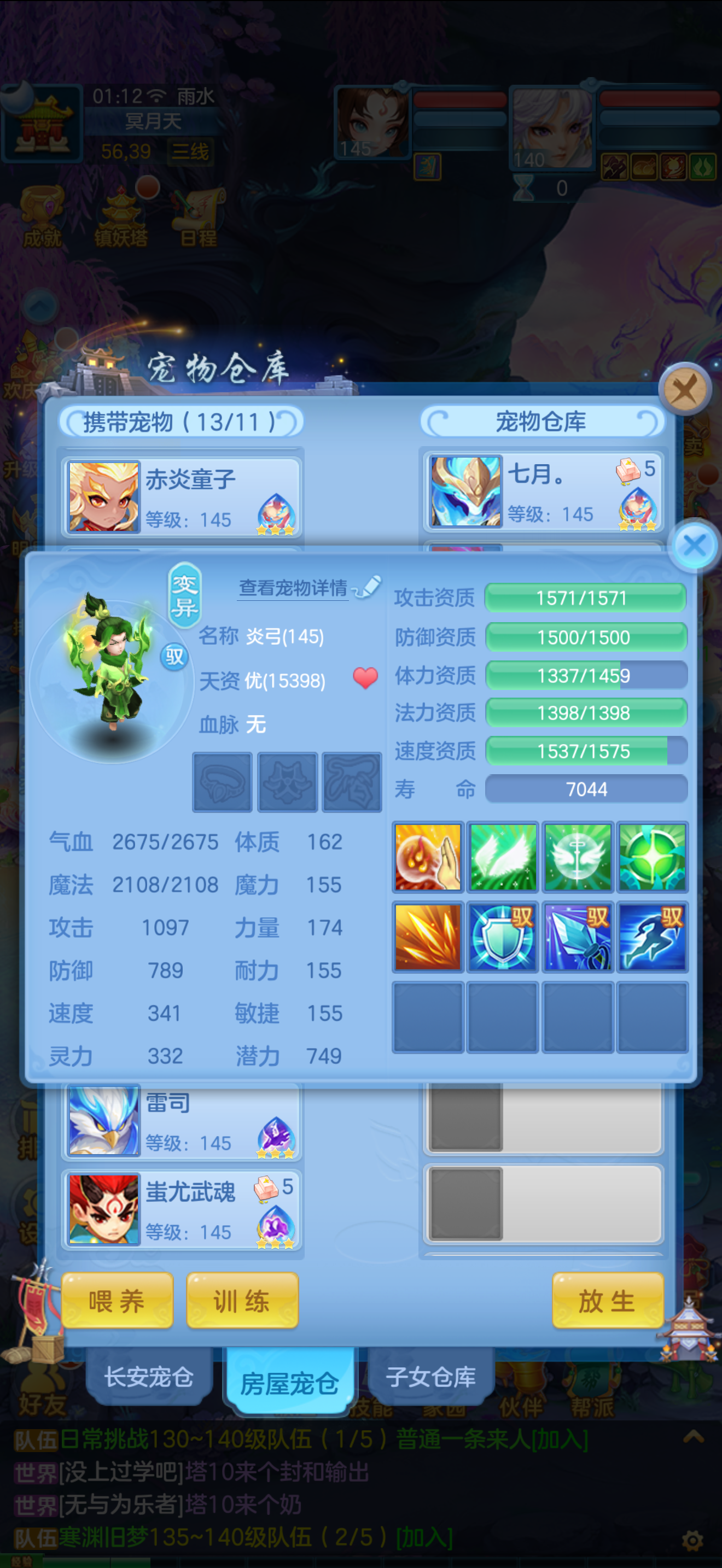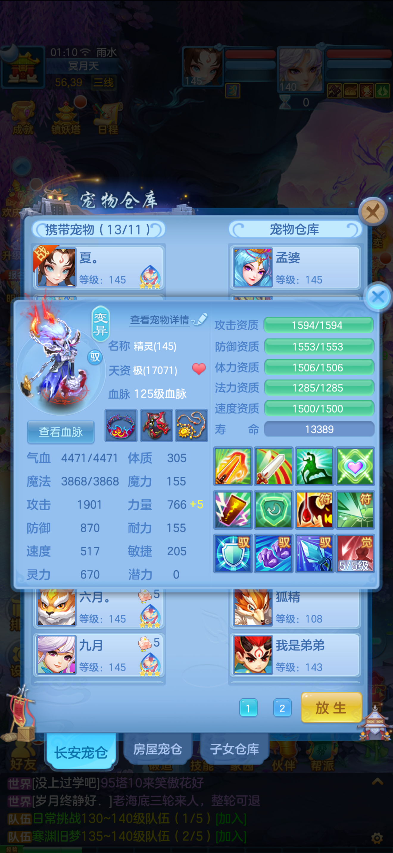 1个神兽,10个6技能,13个特殊5技能,满强身满修