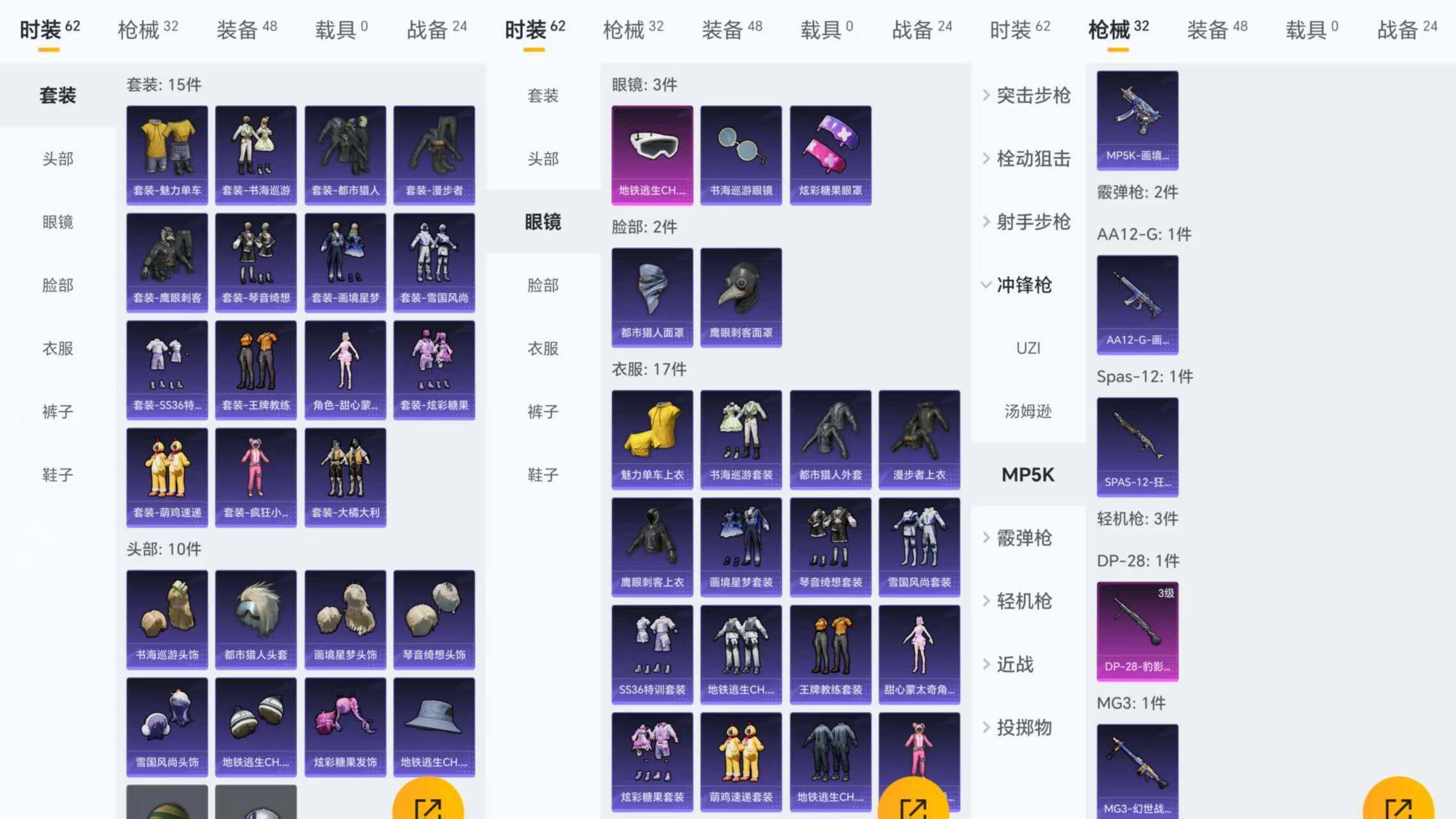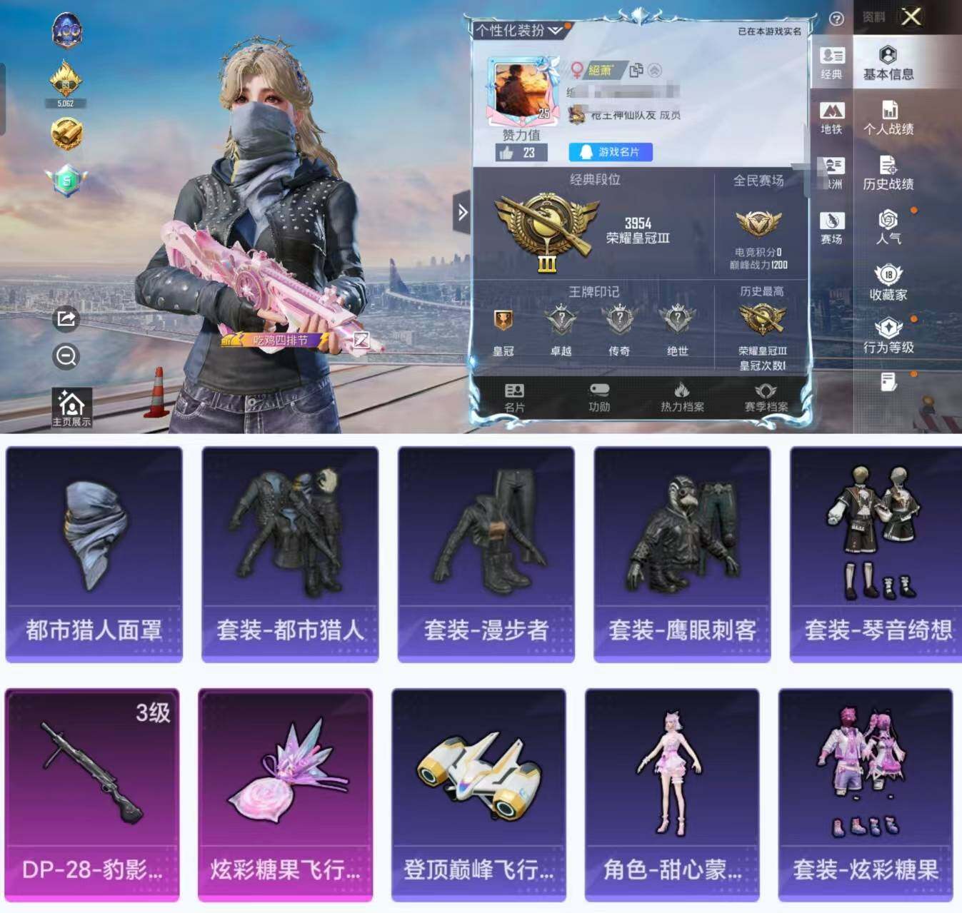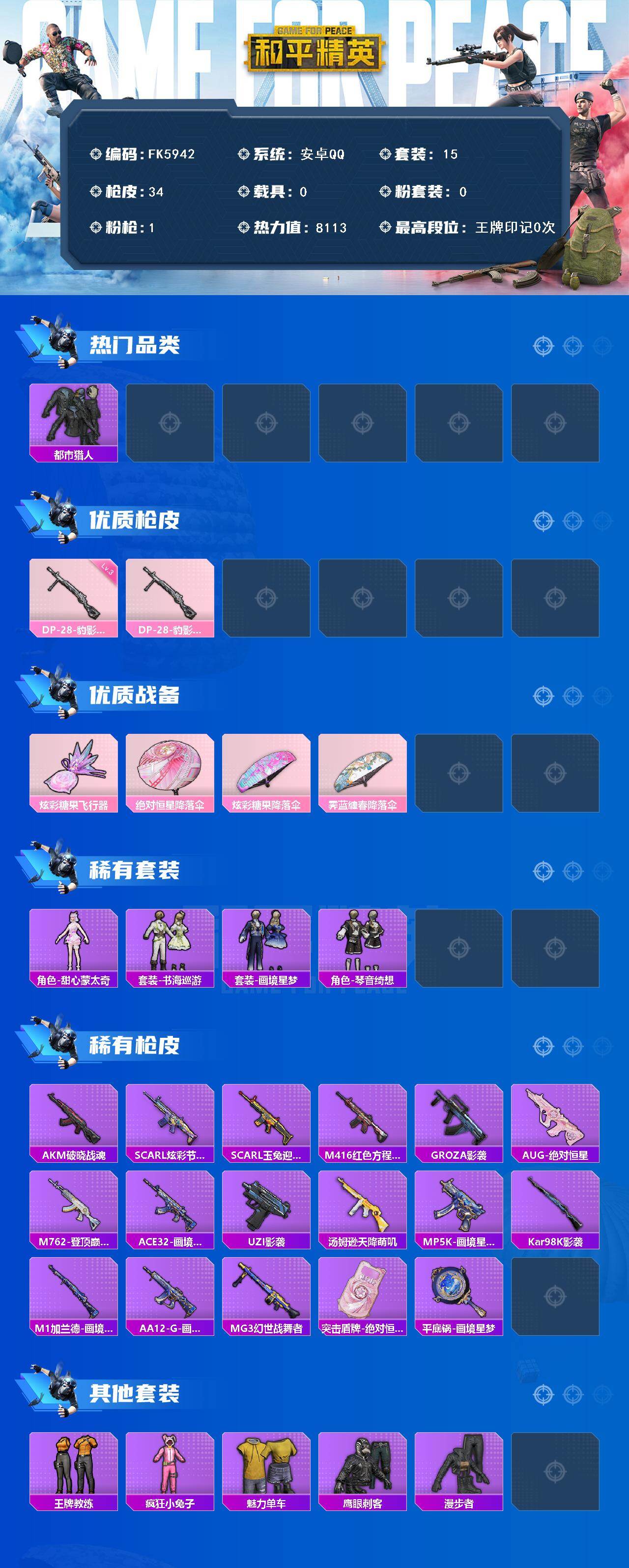【FK5942】15套装/枪械1/装备49/战备24/热力值8113/三级DP-28-豹影疾电/都市猎人/DP-28-豹影疾电/炫彩糖果飞行器/绝对恒星降落伞/炫彩糖果降落伞/霁蓝缠春降落伞/角色-甜心蒙太奇/套装-雪国风尚/套装-炫彩糖果/套装-书海巡游/套装-画境星梦/套装-琴音绮想/AKM-破晓战魂/SCAR-L-炫彩节奏/SCAR-L-玉兔迎春/M416-红色方程式/GROZA-影袭/A