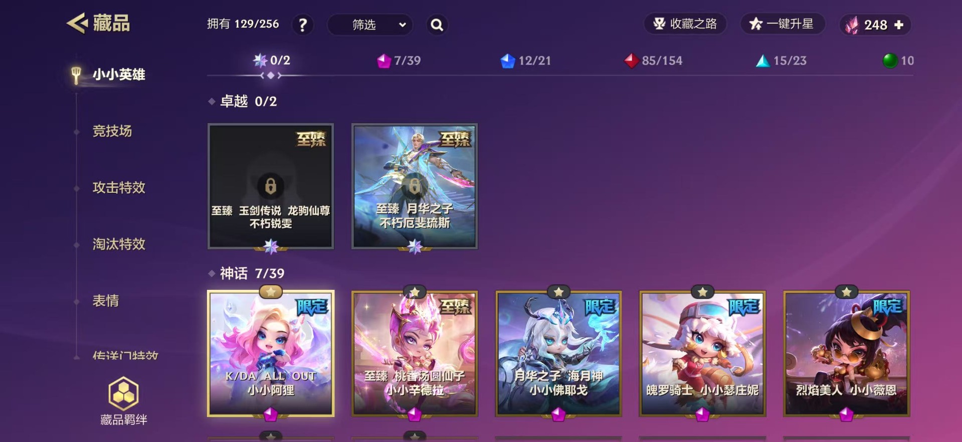 【小小英雄(神话)】至臻 桃香汤圆仙子 小小辛德拉,魄罗骑士 小小瑟庄妮,烈焰美人 小小薇恩,月华之子 海月神 小小佛耶戈,K/DA ALL OUT 小小伊芙琳,K/DA ALL OUT 小小阿狸,至臻 K/DA ALL OUT 小小阿狸