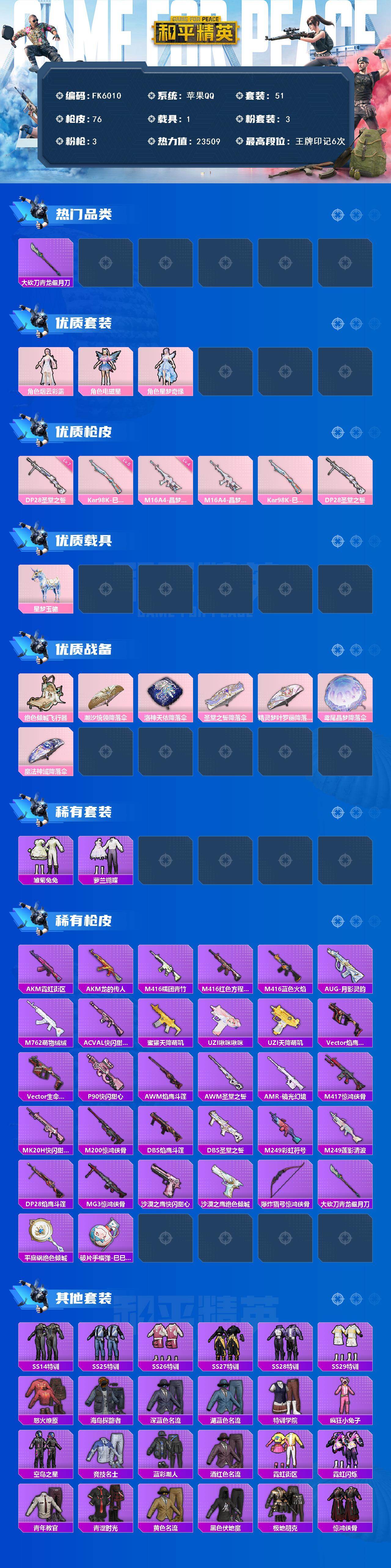 【FK6010】51套装/枪械3/装备106/载具1/战备66/王牌印记6/热力值23509/四级M16A4-晶梦幻蝶/五级Kar98K-巳巳如意/七级DP-28-圣堂之誓/大砍刀-青龙偃月/烟云彩露/电磁星/星梦奇缘/星梦玉骢/M16A4-晶梦幻蝶/Kar98K-巳巳如意/DP-28-圣堂之誓/绝色倾城飞行器/潮汐统领降落伞/洛神天依降落伞/圣堂之誓降落伞/精灵梦叶罗丽降落伞/鸢尾晶梦降落伞/