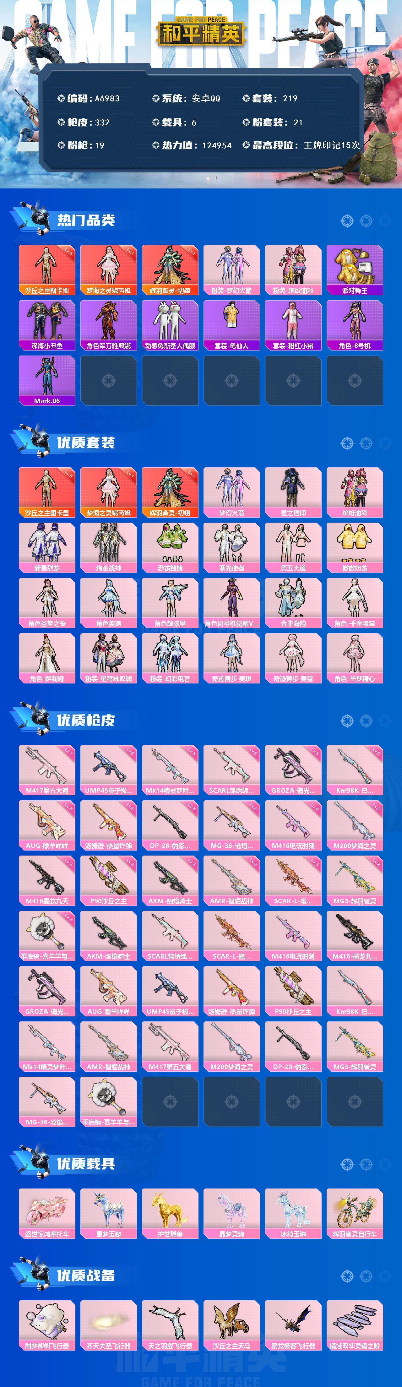 【A6983】安卓【辉羽雀灵-初翊(一级),梦海之灵-妮芮妲(一级),沙丘之主-图卡盟(五级)/粉装-梦幻火箭/粉装-缤纷油彩/套装-派对舞王/套装-深海小丑鱼/角色-军刀雅典娜/套装-动感兔斯基人偶服/套装-龟仙人/套装-粉红小猪/角色-8号机/角色-Mark.06/盛世惊鸿摩托车/星梦玉骢/护世瑞兽/晶梦灵驹/冰绡玉鳞/辉羽雀灵自行车】 手Q-3神装-21粉装-19特效枪-6载具-21粉色飞行器-124954热力值-15王牌印记-219套装-332枪皮