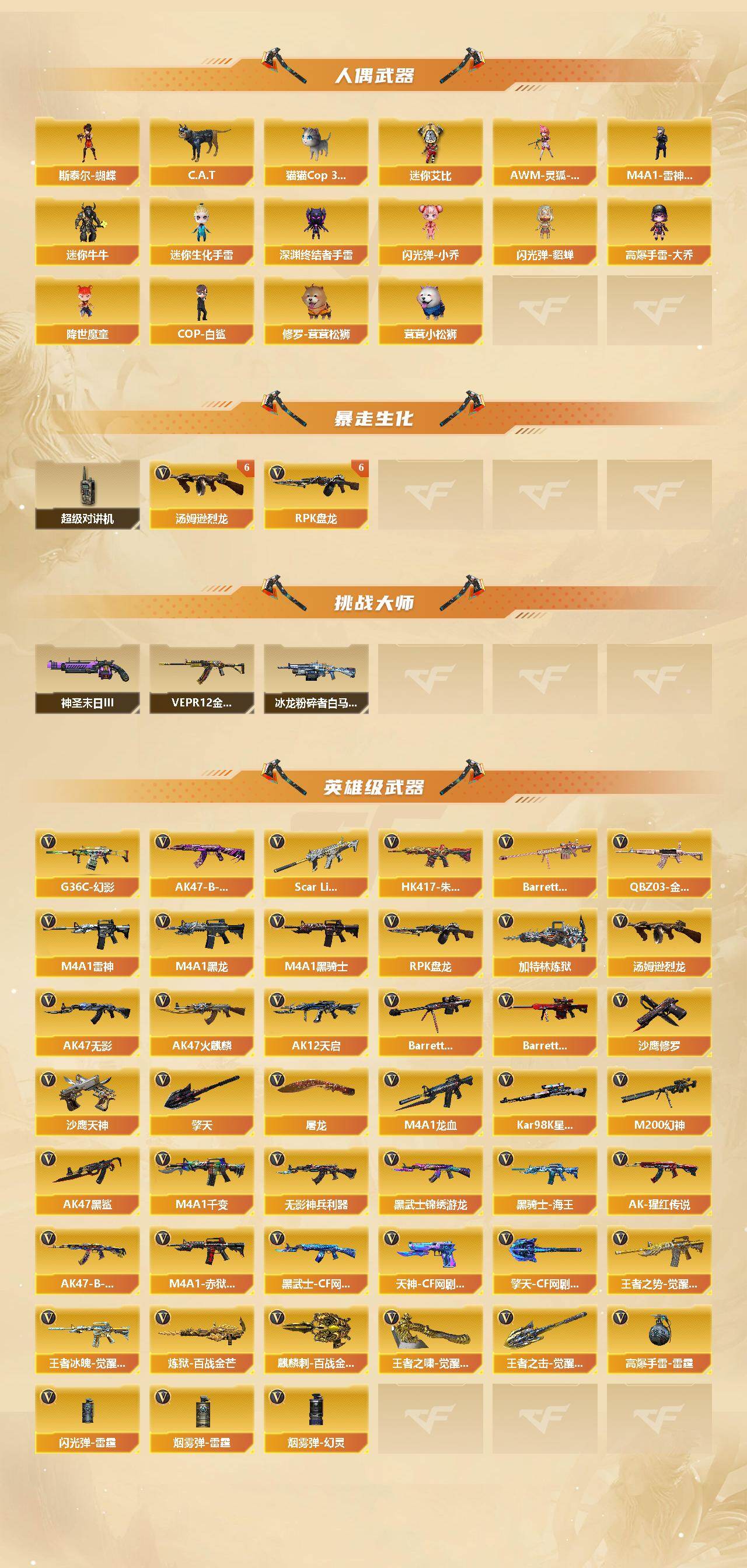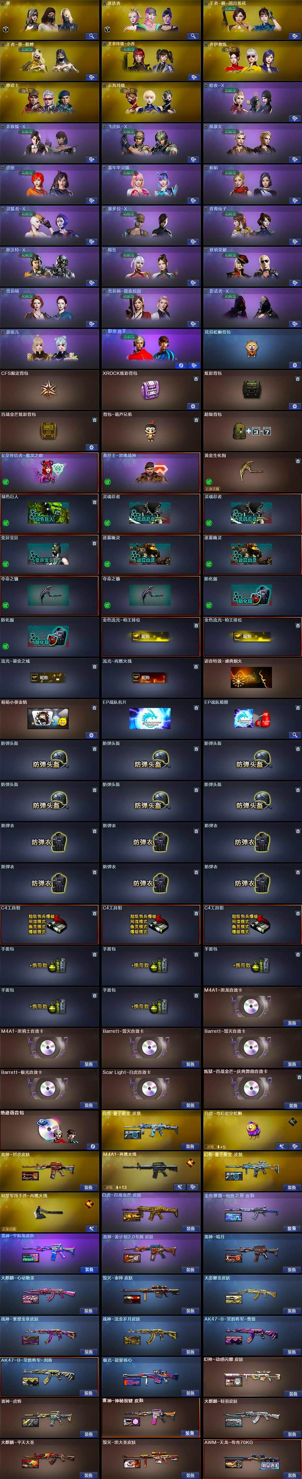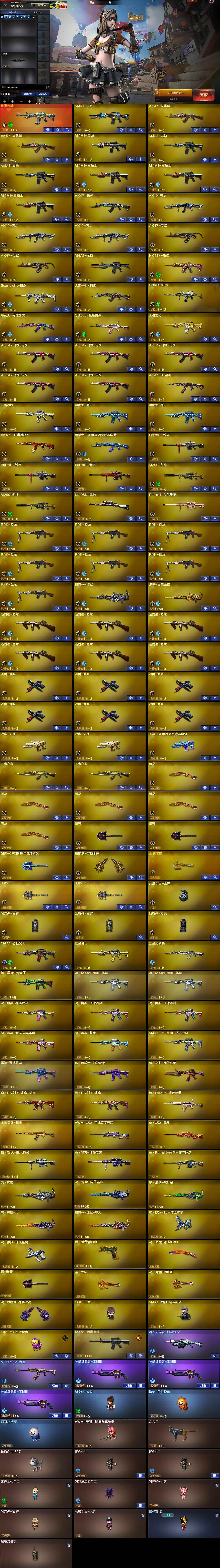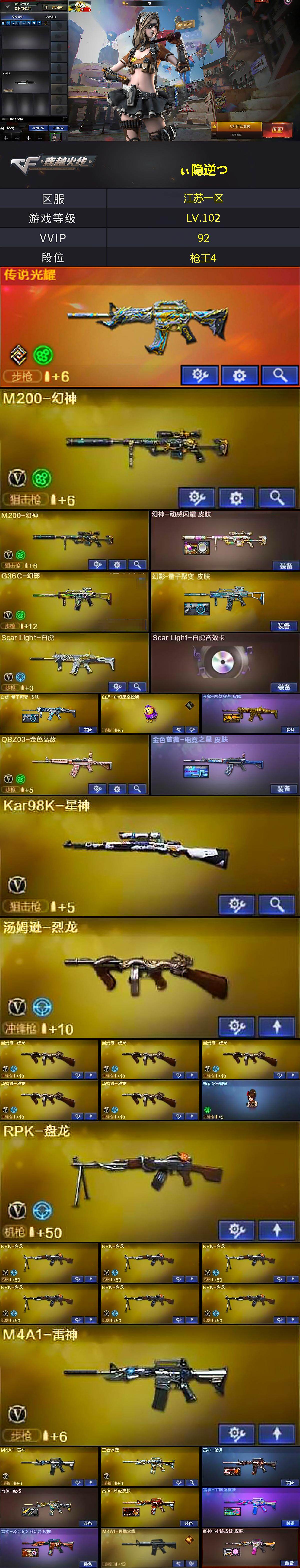 【热门武器】:传说光耀,G36C-幻影,QBZ03-金色蔷薇,Scar Light-白虎,HK417-朱雀,M200-幻神*2,Kar98K-星神,C.A.T,M4A1-黑骑士*3,汤姆逊-烈龙*6,RPK-盘龙*7,加特林-炼狱,斯泰尔-蝴蝶,猫猫Cop 357,降世魔童,COP-白鲨,沙鹰-修罗*6