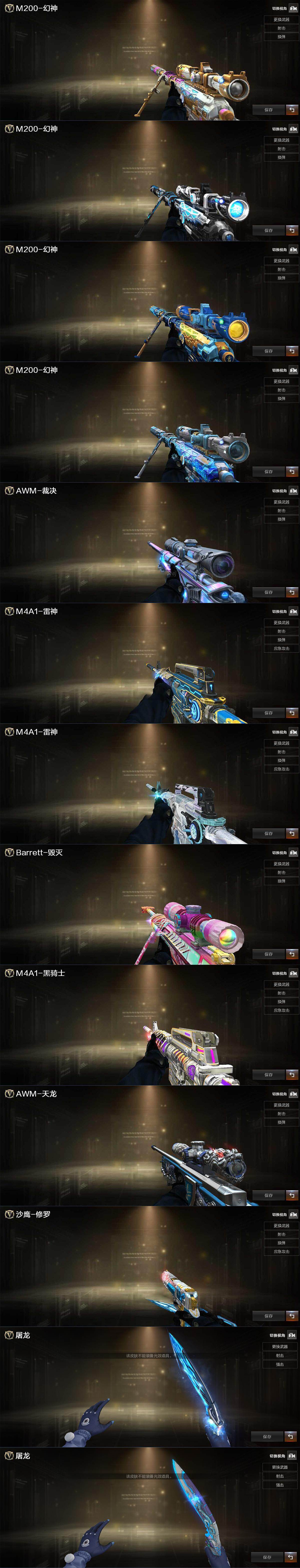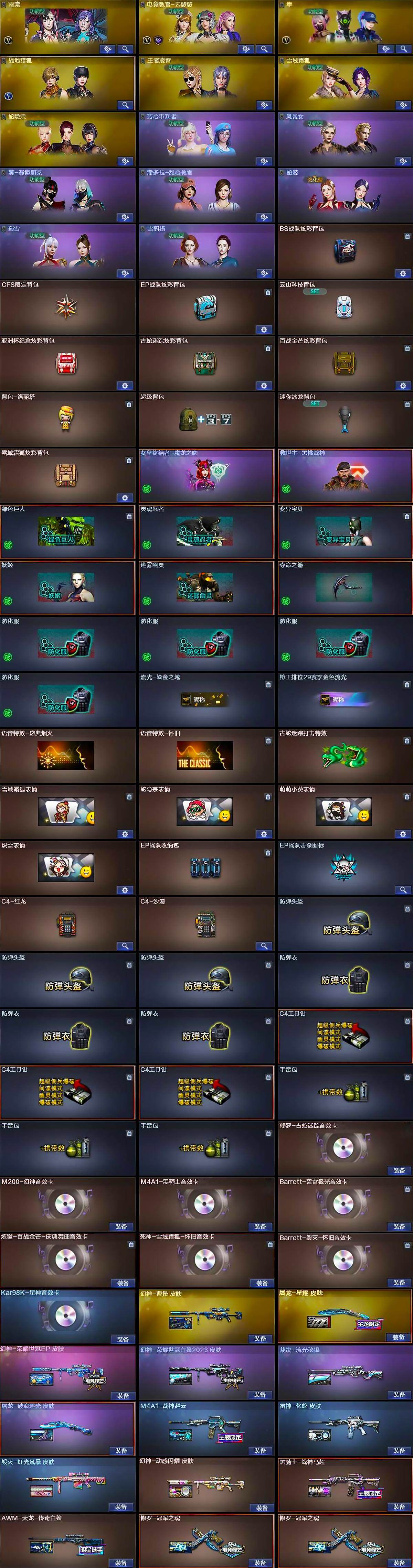 【音效卡】:修罗-古蛇迷踪音效卡,M200-幻神音效卡,M4A1-黑骑士音效卡,Kar98K-星神音效卡,Barrett-碧霄极光音效卡,炼狱-百战金芒-庆典舞曲音效卡,死神-雪域霜狐-怀旧音效卡,Barrett-毁灭-怀旧音效卡