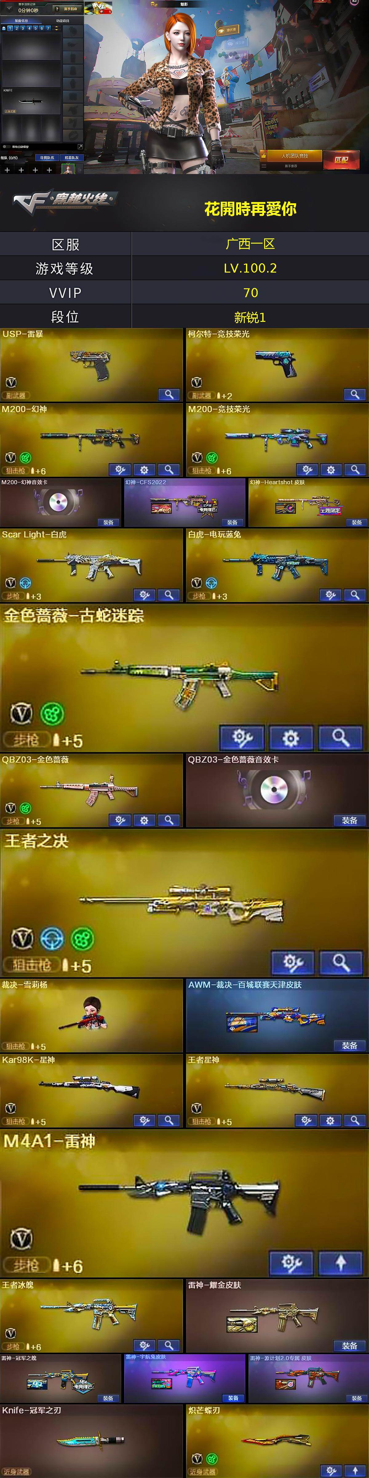 【热门武器】:QBZ03-金色蔷薇,Scar Light-白虎,M200-幻神,金色蔷薇-古蛇迷踪,修罗-古蛇迷踪,M200-竞技荣光,死亡之眼,白虎-电玩蓝兔,Kar98K-星神,Cat-刀锋,牛牛-AK47,M4A1-黑骑士,加特林-炼狱,裁决-雪莉杨,USP-雷暴,沙鹰-修罗,Knife-冠军之刃,炽芒蝶刃,炽芒蝶刃-破浪逐光 皮肤,黄金猫猫手套-白鲨