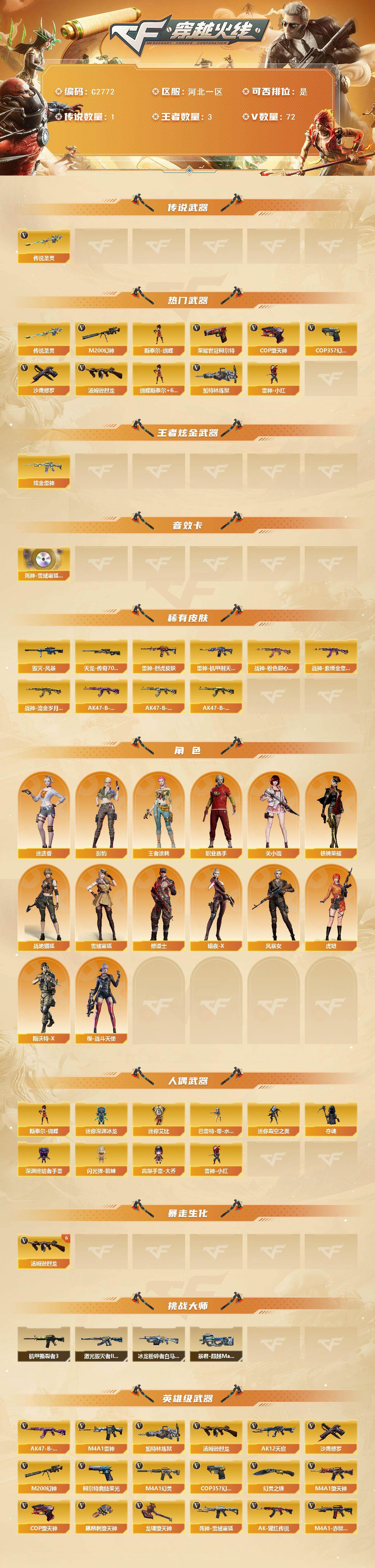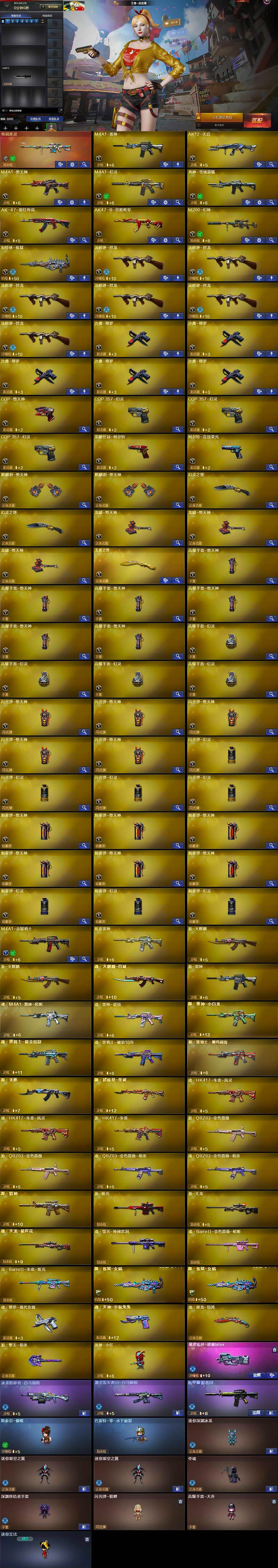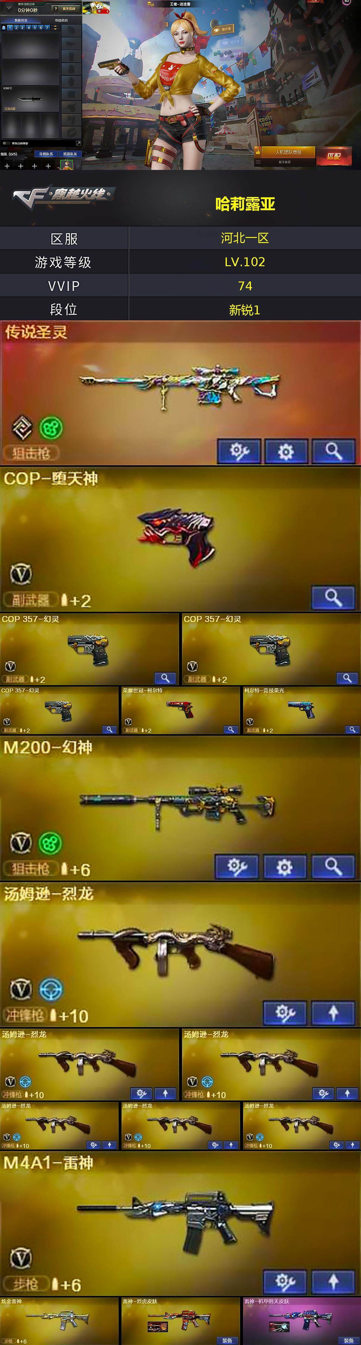 【热门武器】:传说圣灵,M200-幻神,荣耀世冠-柯尔特,汤姆逊-烈龙*6,加特林-炼狱,斯泰尔-蝴蝶,雷神-小红,COP-堕天神,COP 357-幻灵*3,沙鹰-修罗*5