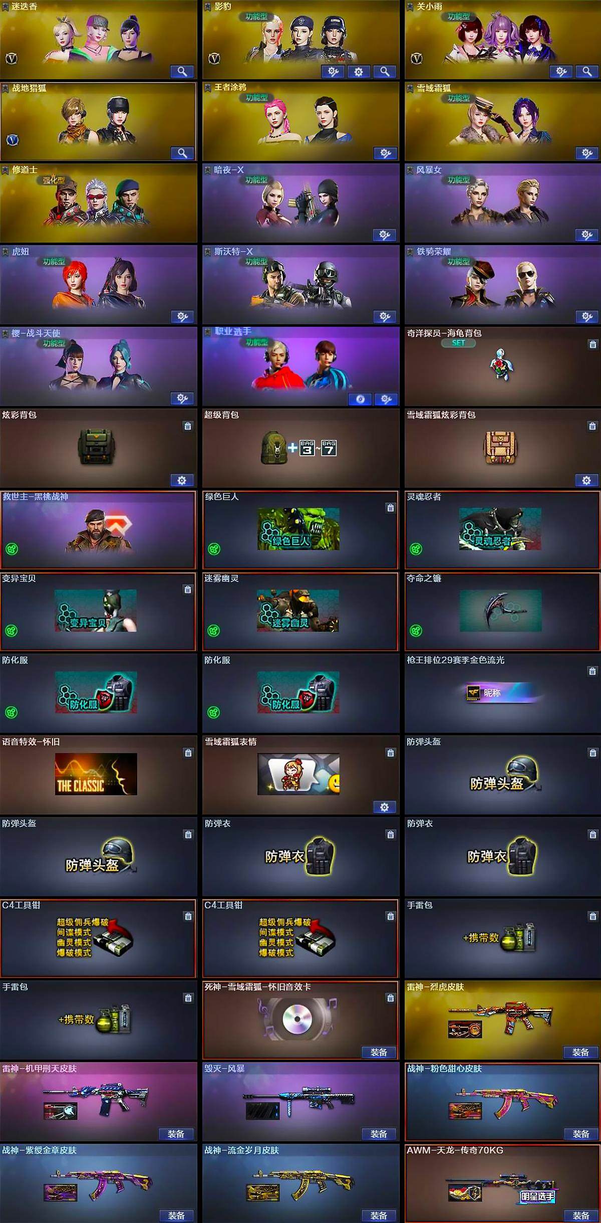 【皮肤】:雷神-烈虎皮肤,雷神-机甲刑天皮肤,毁灭-风暴,战神-粉色甜心皮肤,战神-紫绶金章皮肤,战神-流金岁月皮肤,AK47-B-常胜将军-曹操,AK47-B-常胜将军-刘备*2,AK