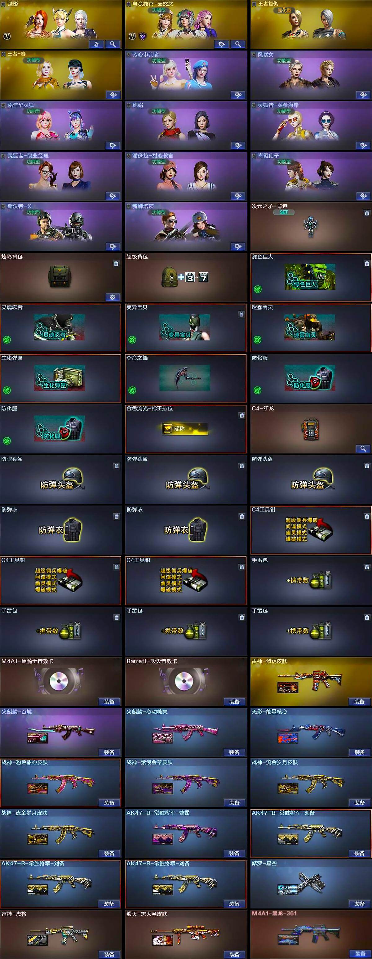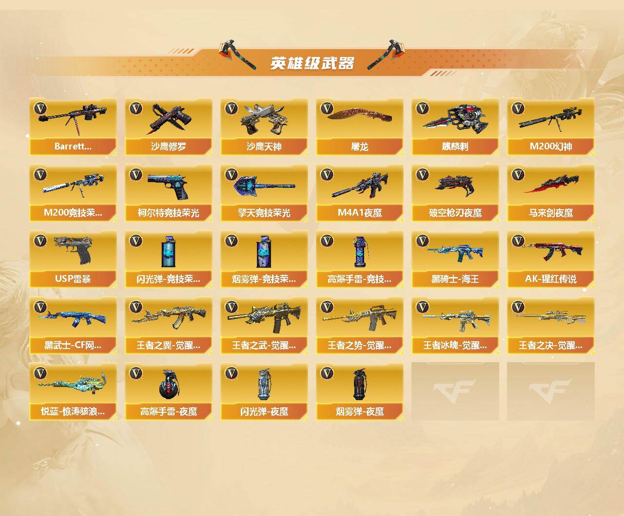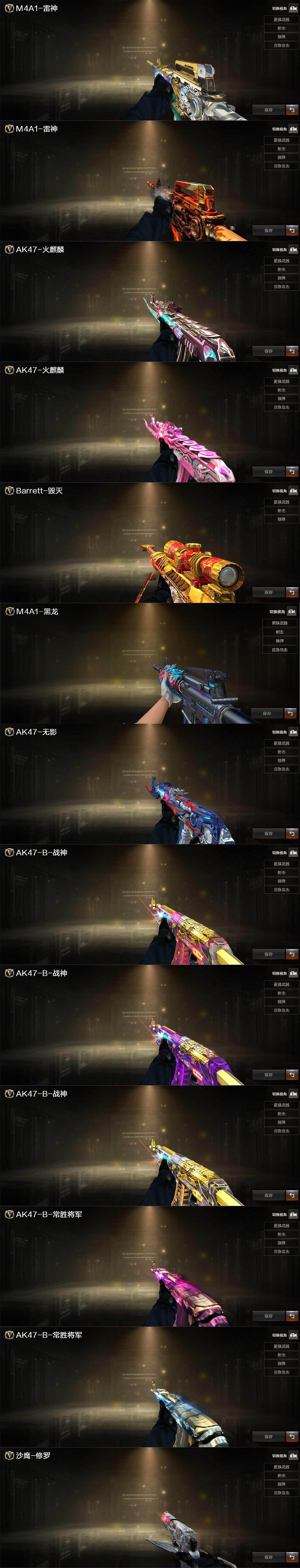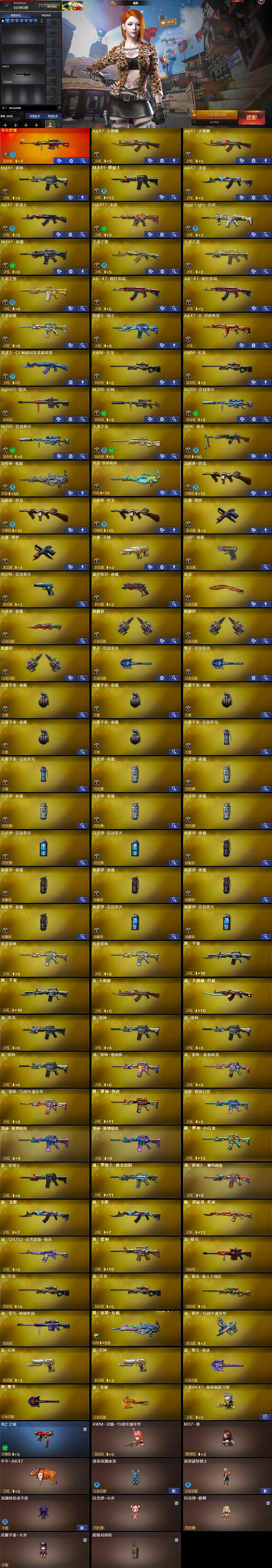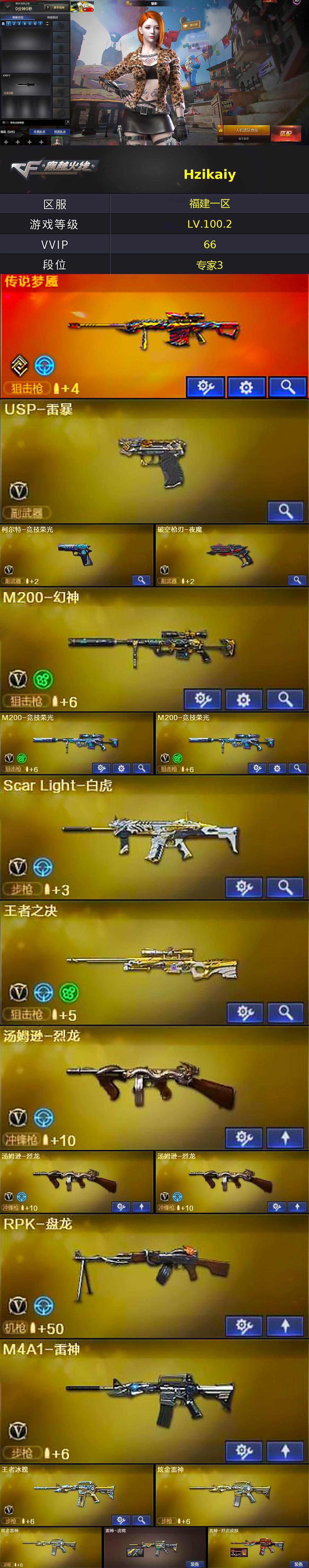 【热门武器】:传说梦魇,Scar Light-白虎,HK417-朱雀,M200-幻神,M200-竞技荣光*2,死亡之眼,牛牛-AK47,M4A1-黑骑士,汤姆逊-烈龙*3,RPK-盘龙,加特林-炼狱,王者AK47-萌萌银发刀锋,USP-雷暴,沙鹰-修罗*2