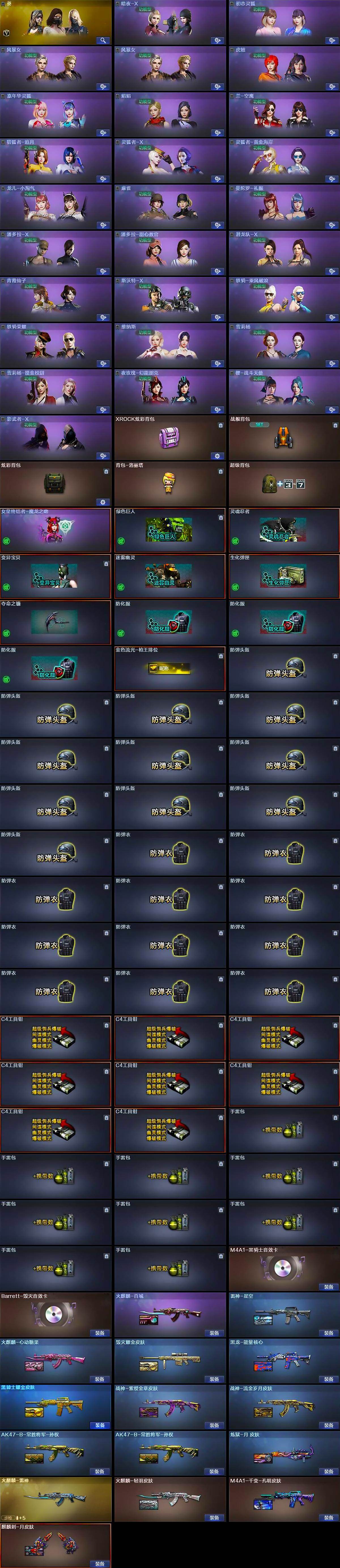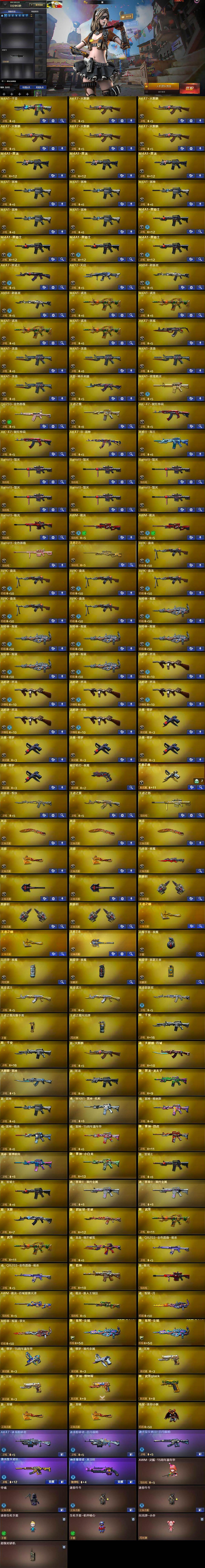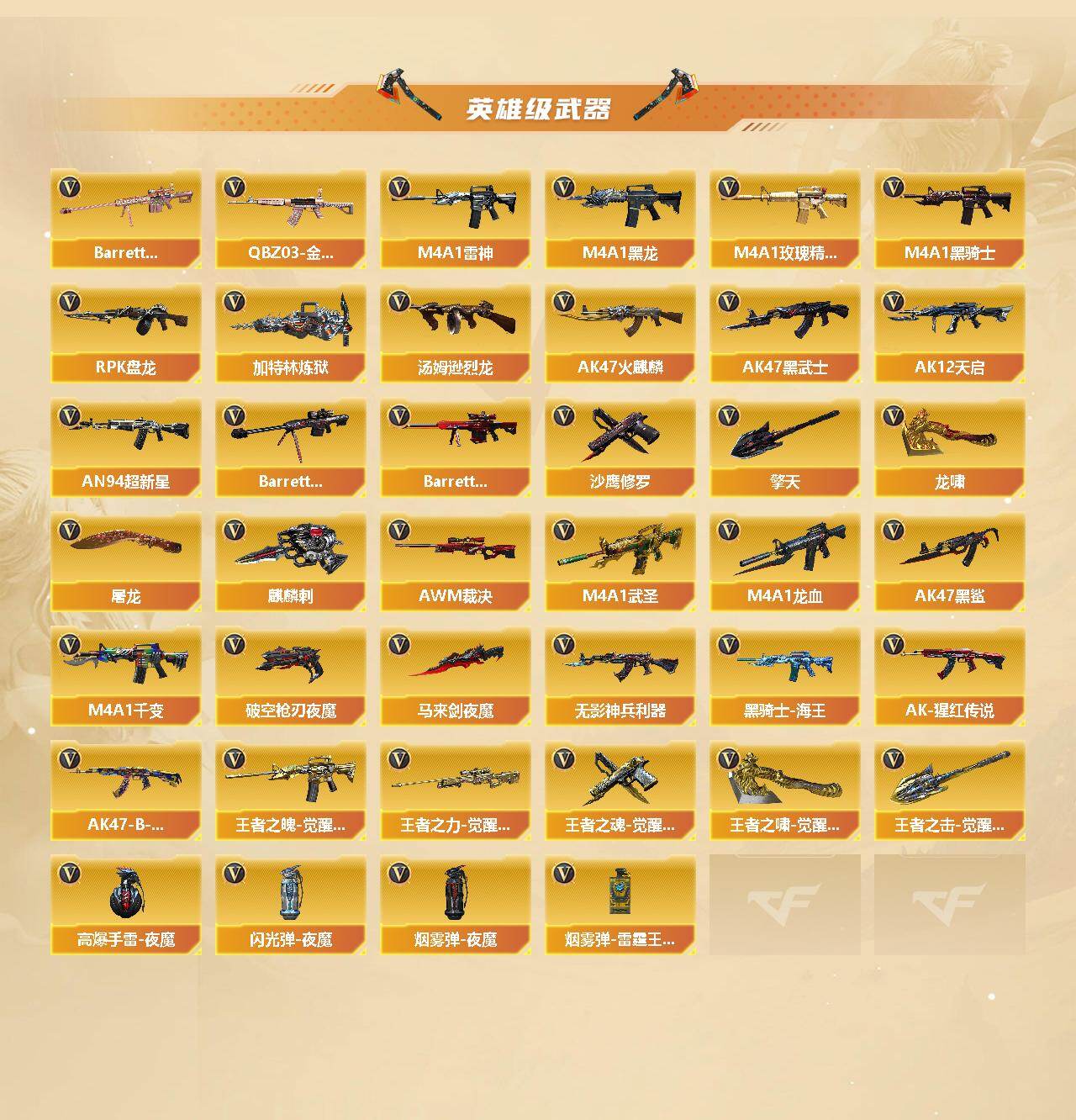【热门武器】:QBZ03-金色蔷薇,金色小号,炼狱-迷你小钢,M4A1-黑骑士*4,汤姆逊-烈龙*6,RPK-盘龙*6,加特林-炼狱*6,沙鹰-修罗*5,金刚伞