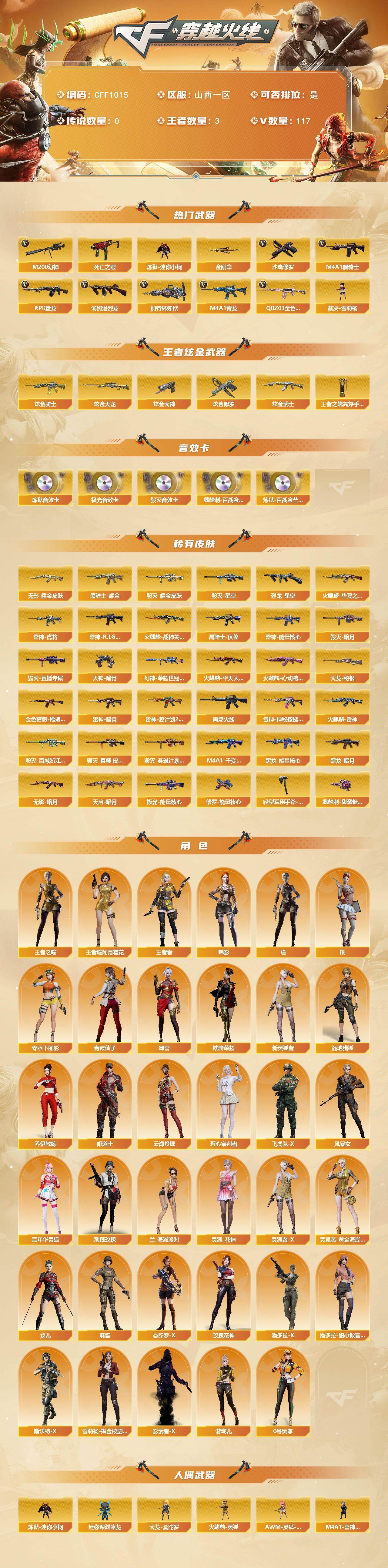 【CFF1015】113V/102级/荣耀元首/3王者/8炫金/4英雄/QBZ03-金色蔷薇/M4A1_青龙/M200_幻神/死亡之眼/炼狱-迷你小钢/M4A1_黑骑士/汤姆逊烈龙/RPK_盘龙/加特林_炼狱/裁决-雪莉杨/沙鹰_修罗/金刚伞/炫金骑士/炫金武士/炫金天龙/炫金天神/炫金修罗/王者之魄高爆手雷/Barrett-毁灭音效卡/Barrett-极光音效卡/加特林-炼狱音效卡/麒麟刺-百战金芒-盛典舞曲音效卡/炼狱-百战金芒-庆典舞曲音效卡/M200-幻神-荣耀世冠白鲨/金色蔷薇-枪娘阿