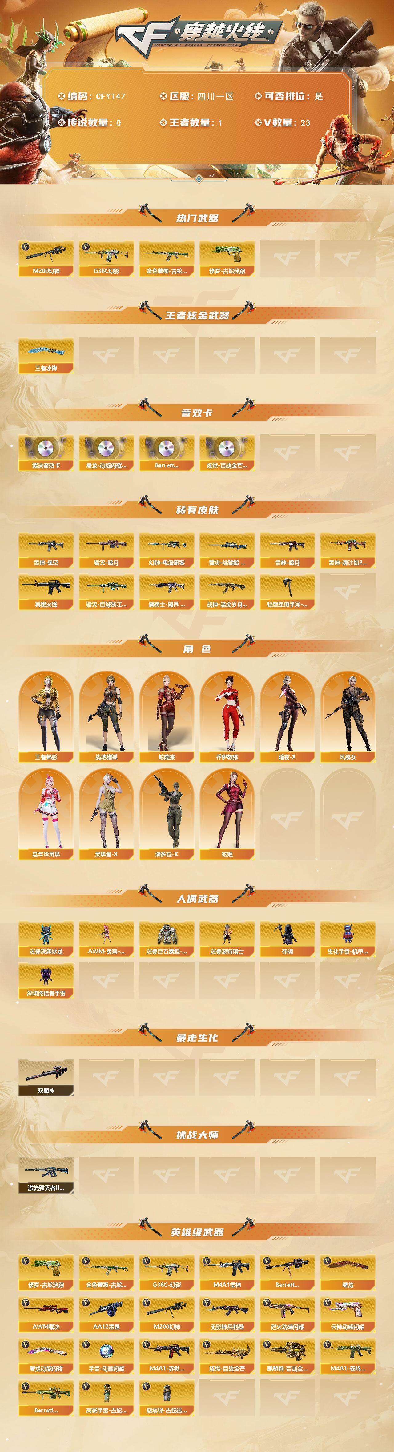 【CFYT47】21V/88级/将帅/1王者/2英雄/G36C-幻影/M200_幻神/金色蔷薇-古蛇迷踪/修罗-古蛇迷踪/王者冰锋/屠龙-动感闪耀 音效卡/AWM-裁决音效卡/Barrett-碧霄极光音效卡/炼狱-百战金芒-庆典舞曲音效卡/幻神-电流骇客 皮肤/裁决-运输船 皮肤/雷神-暗月/雷神-星空/雷神-源计划2.0专属 皮肤/M4A1-再燃火线/毁灭-暗月/毁灭-百城浙江 皮肤/黑骑士-破界 皮肤/战神-流金岁月皮肤/轻型军用手斧-再燃火线/战地猎狐/王者-魅影/蛇隐宗/乔伊教练/暗夜-