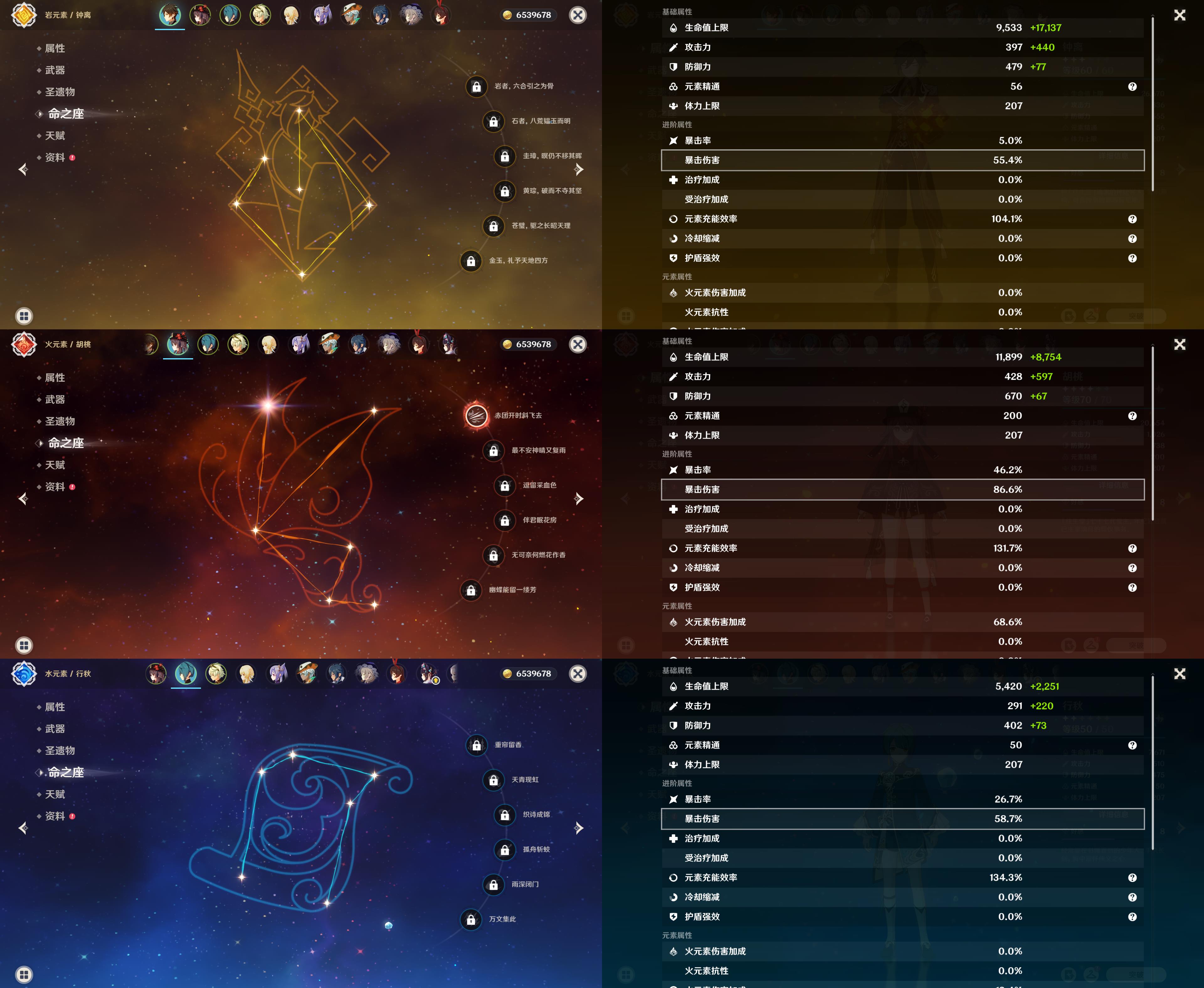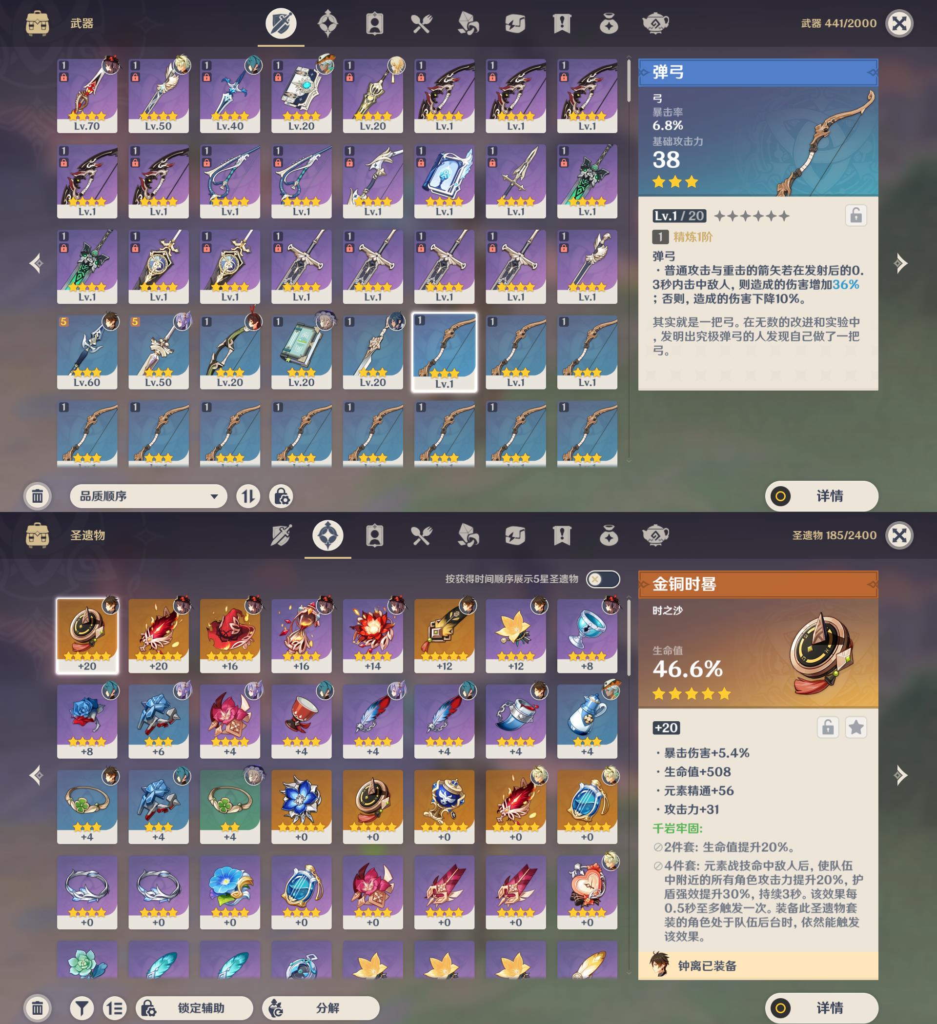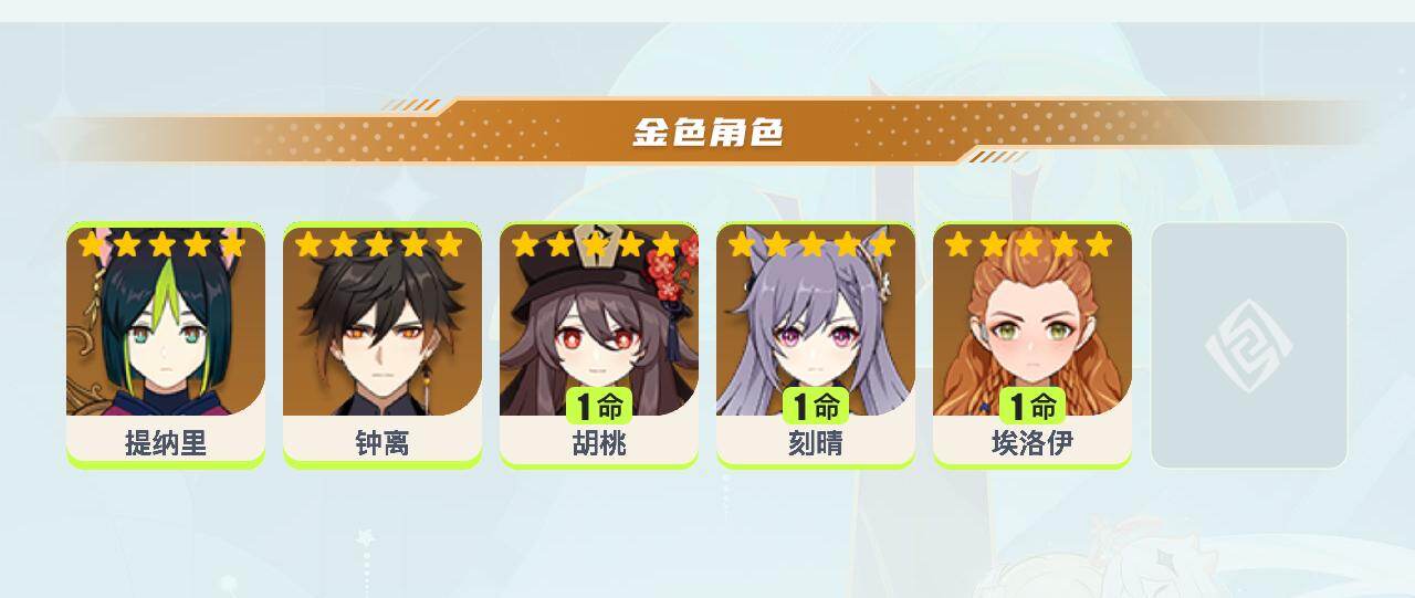44级/7黄/女主/5个五星角色/钟离/1命胡桃/1命刻晴/0命埃洛伊/提纳里