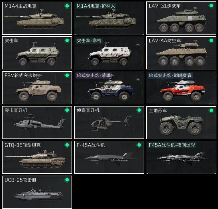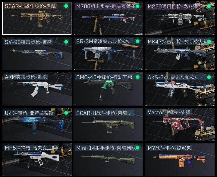 红狼-电锯惊魂,近战-黑鹰,SCAR-H战斗步枪-启航,M250通用机枪-寒冬猎手,M700狙击步枪-哈夫克警备,AKM突击步枪-肃杀,M7战斗步枪-捣蛋鬼,MP5冲锋枪-哈夫克卫队,Vector冲锋枪-先