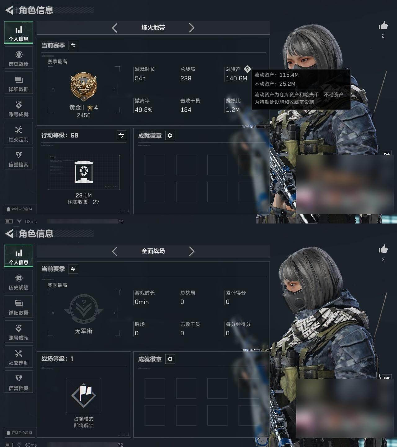 总资产:140.6M, 哈夫币:16097K ;总资产(M):140M/哈夫币(K):16097K/哈夫币(K):16097K/全面战场等级:1_段位:无段位/烽火地带等级:60_段位:黄金