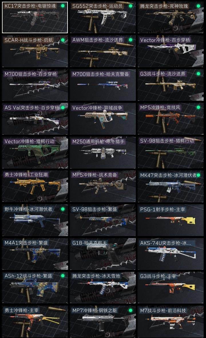 红狼-电锯惊魂,近战-黑鹰,SG552突击步枪-运动员,SCAR-H战斗步枪-启航,腾龙突击步枪-死神玫瑰,KC17突击步枪-电锯惊魂,G3战斗步枪-流沙送葬,AS Val突击步枪-百步穿杨,MP5冲锋枪-战术竞