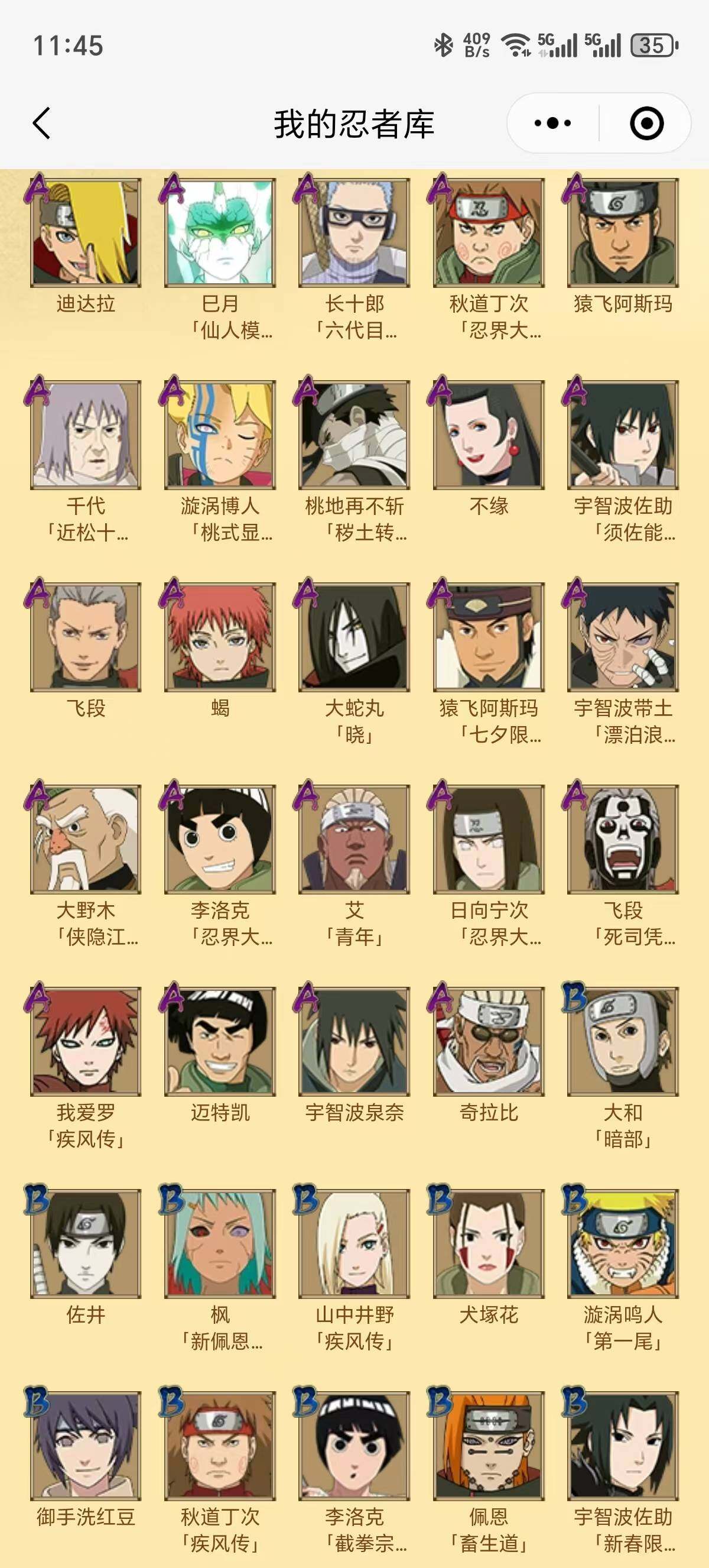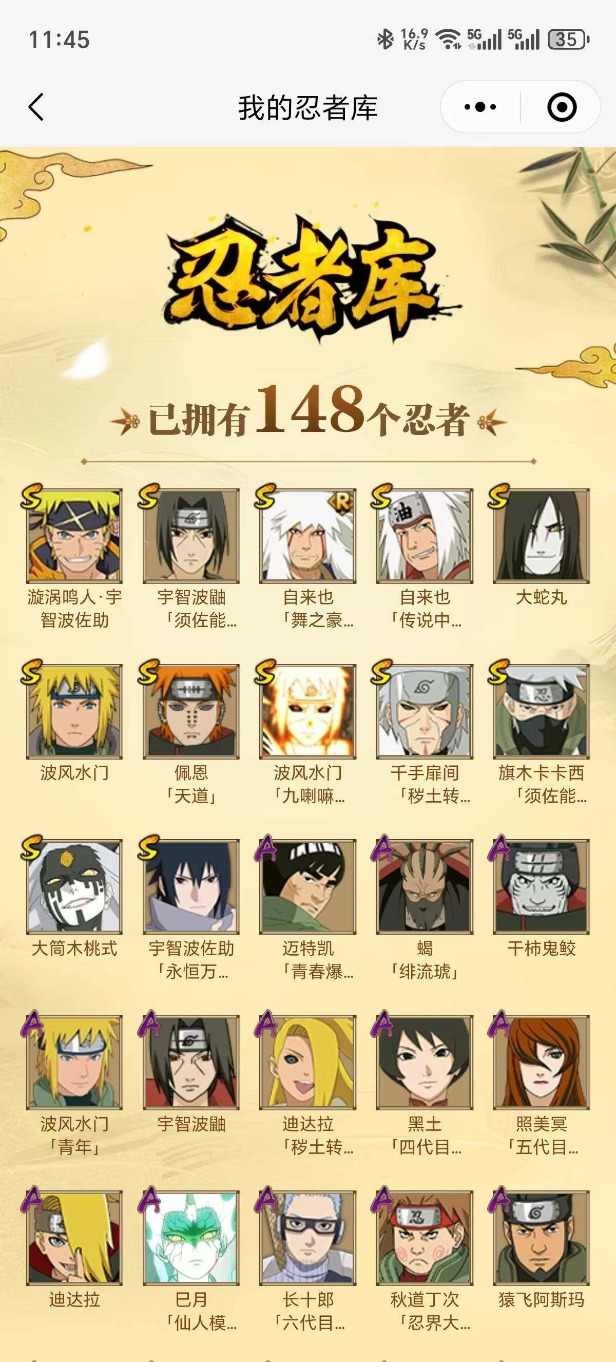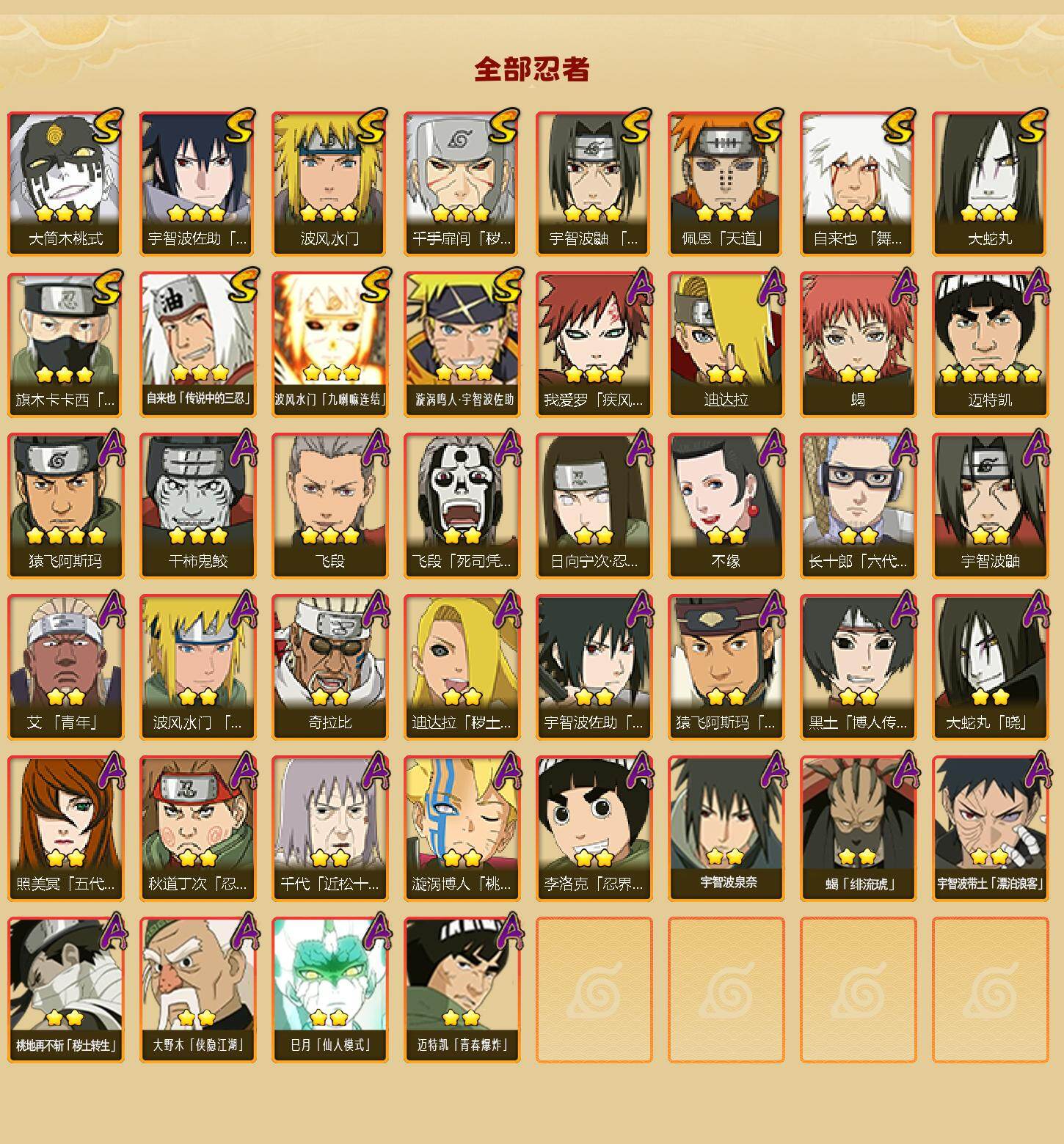 【S级忍者】:千手扉间「秽土转生」(3星),宇智波鼬「须佐能乎」(3星),旗木卡卡西「须佐能乎」(3星),自来也「舞之豪杰」(3星),大蛇丸(3星),自来也「传说中的三忍」(3星),波风水门(3星),佩恩「天道」(3星),宇智波佐助「永恒万花筒」(3星),大筒木桃式(3星),波风水门「九喇嘛连结」(3星),漩涡鸣人·宇智波佐助(3星)