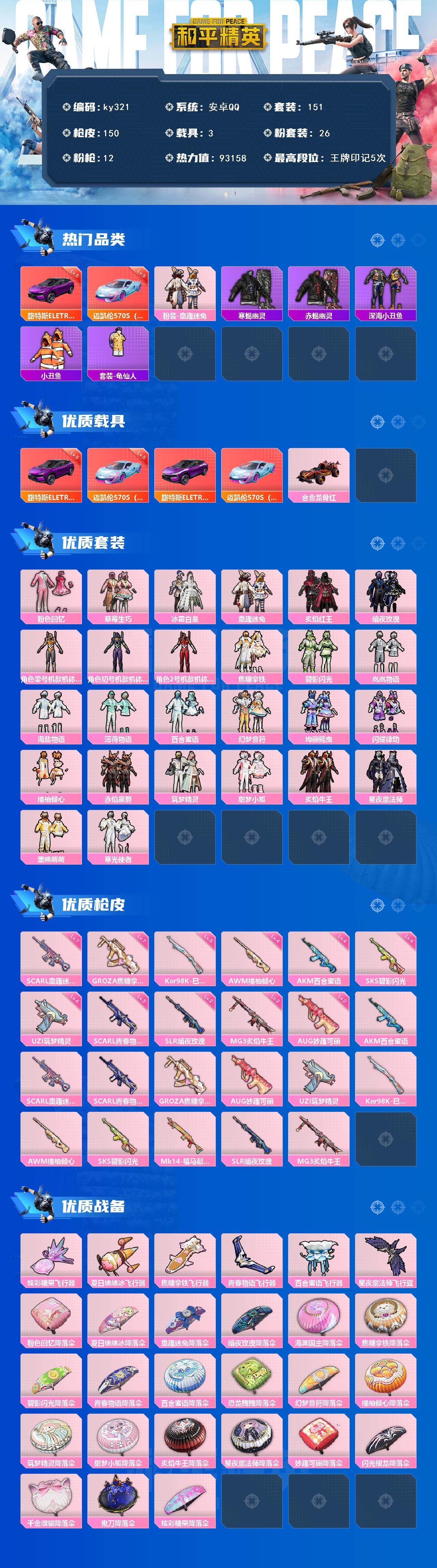 安卓 手Q-26粉装-12特效枪-3载具-6粉色飞行器-93158热力值-5王牌印记-151套装-150枪皮