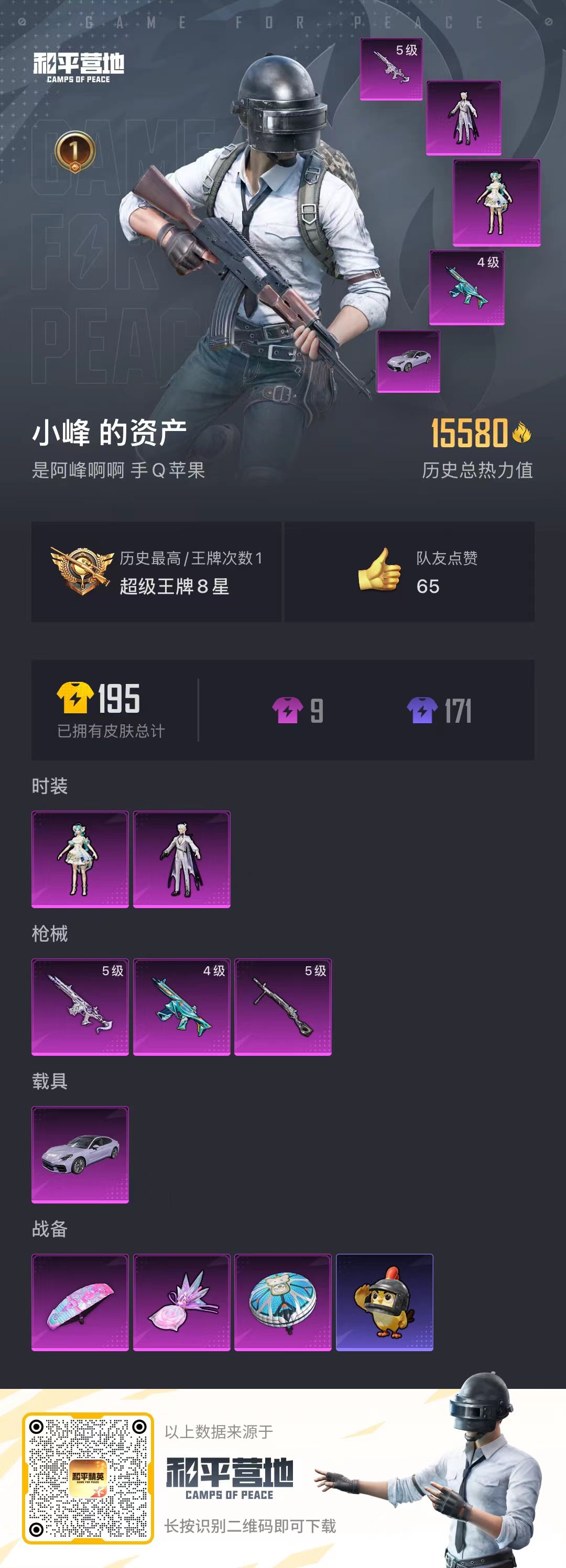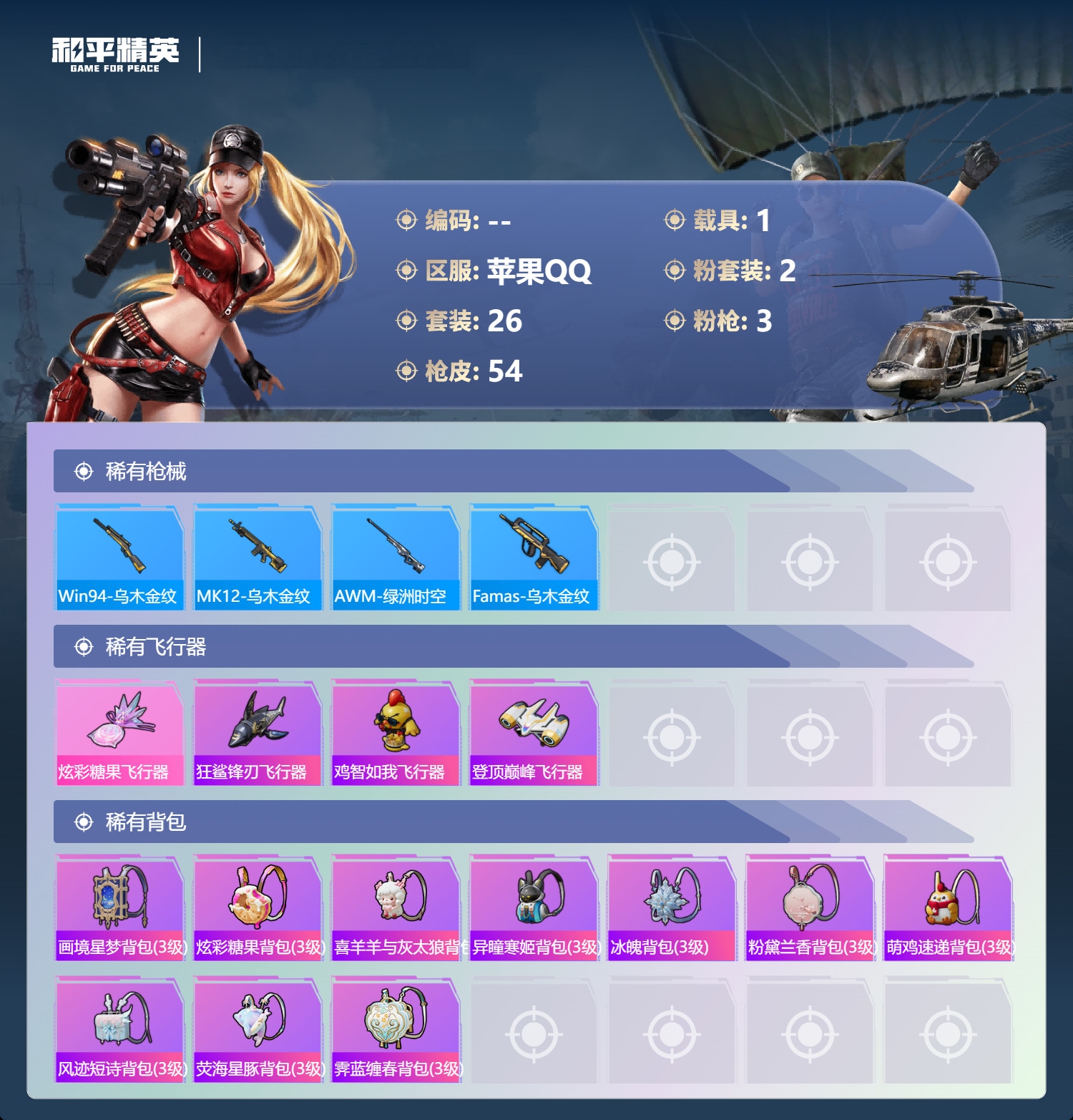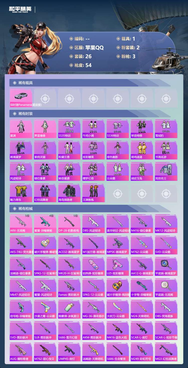 a4281/苹果QQ/1王牌印记-2粉装-3特效枪-1载具-15580热力值-26套装-54枪皮
