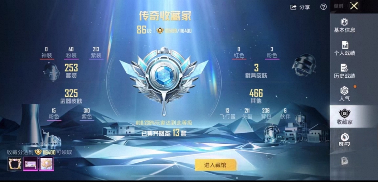 出和平精英公主号 传奇收藏家86级,连体王者贵八。