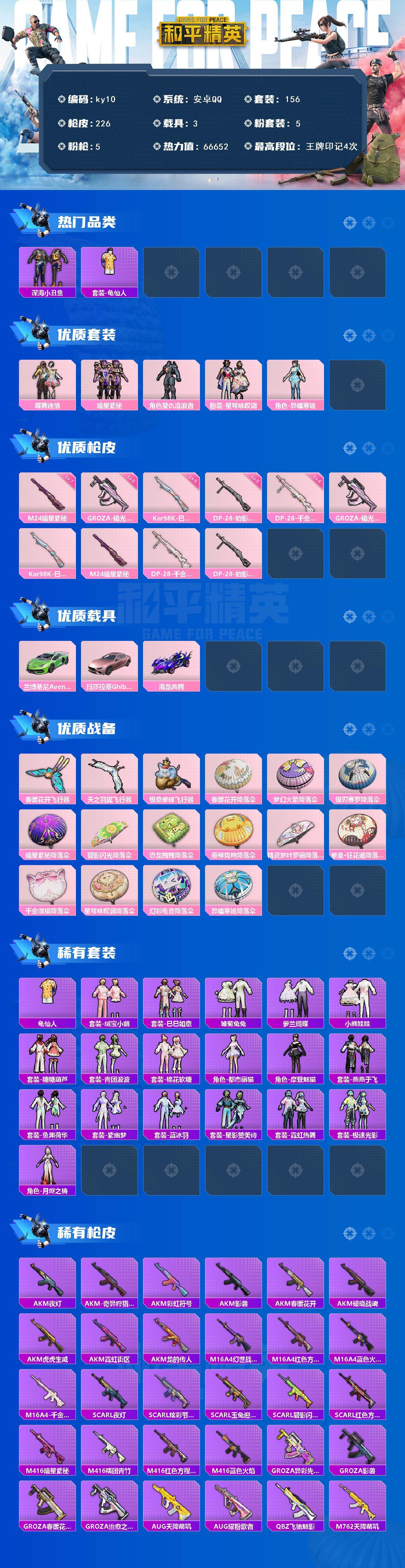 安卓 手Q-5粉装-5特效枪-3载具-4粉色飞行器-66652热力值-4王牌印记-156套装-226枪皮