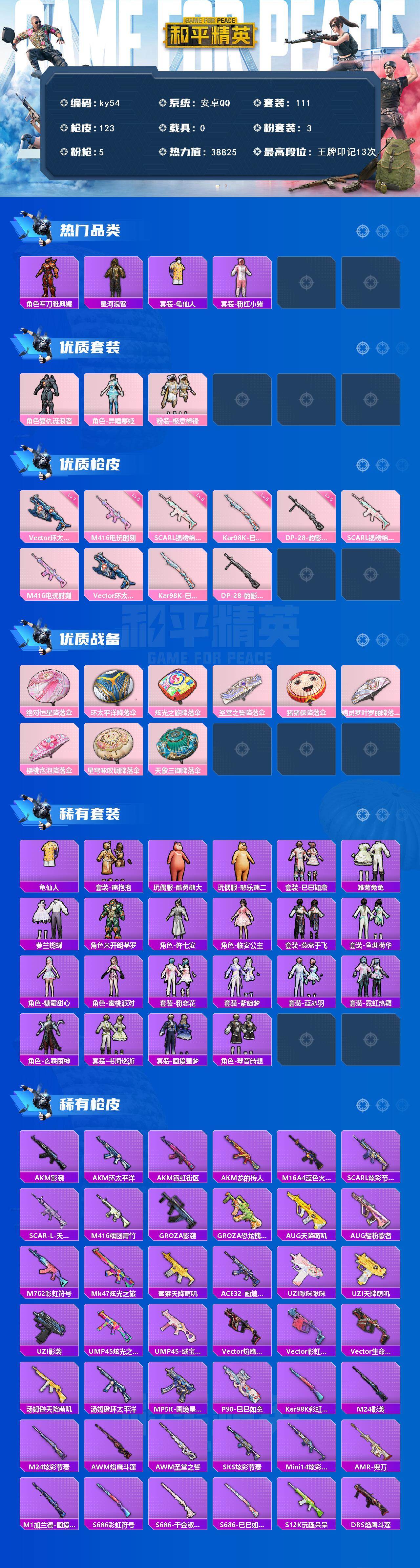 安卓 手Q-3粉装-5特效枪-0载具-1粉色飞行器-38825热力值-13王牌印记-111套装-123枪皮