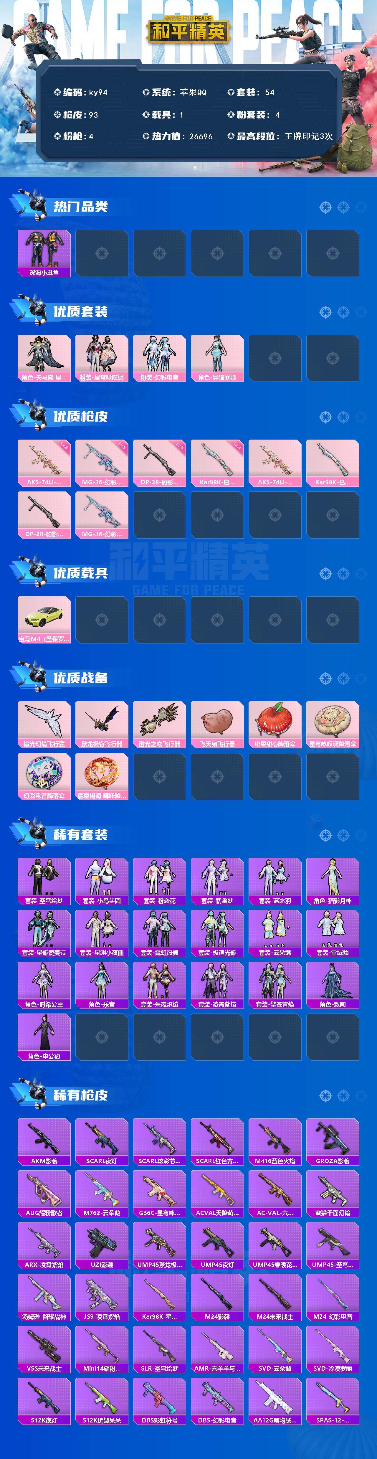 苹果 手Q-4粉装-4特效枪-1载具-5粉色飞行器-26696热力值-3王牌印记-54套装-93枪皮