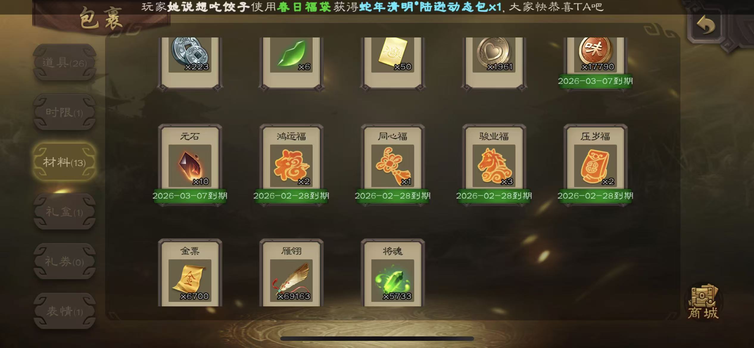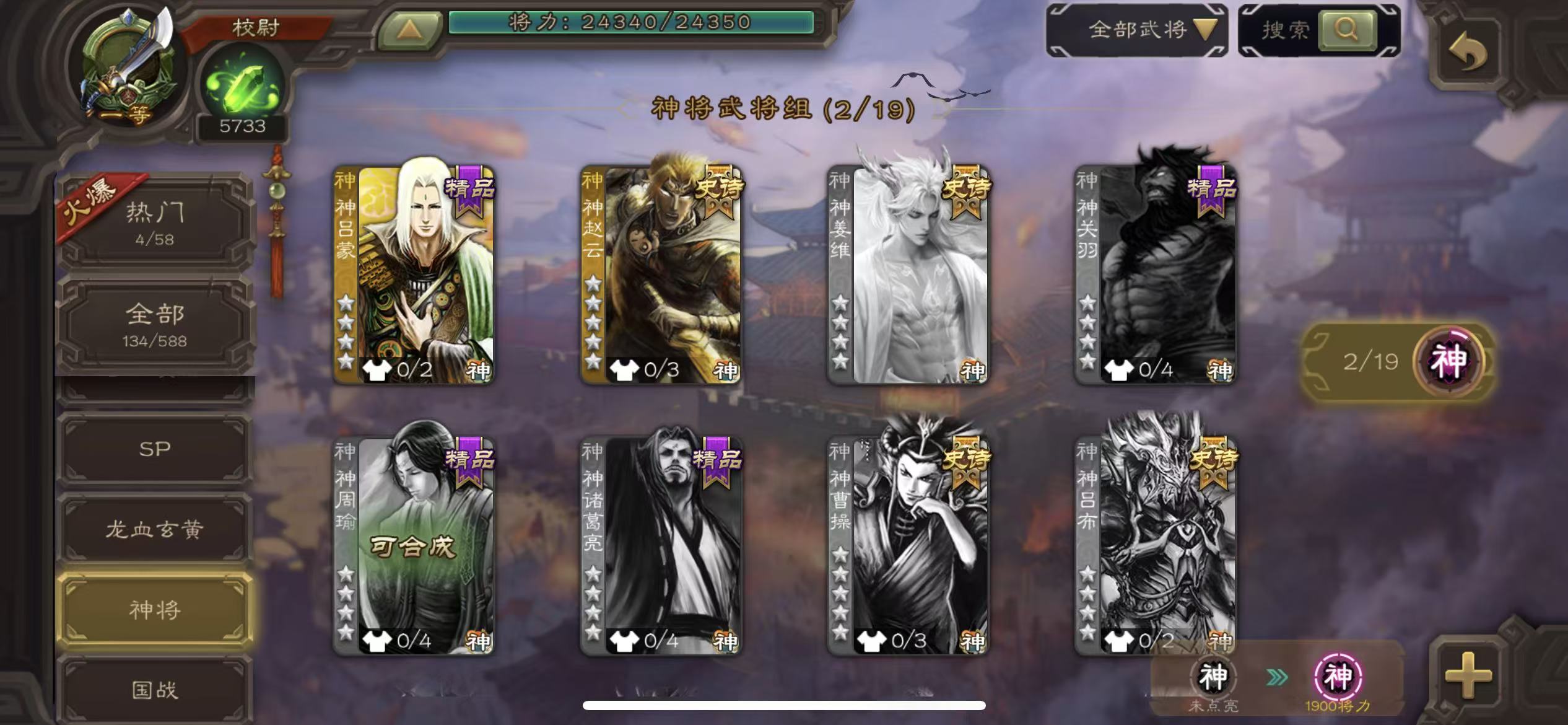 校尉火龙果势魏延大宝神赵云5700将魂7万羽毛三卡35天宫石8400元宝月卡
