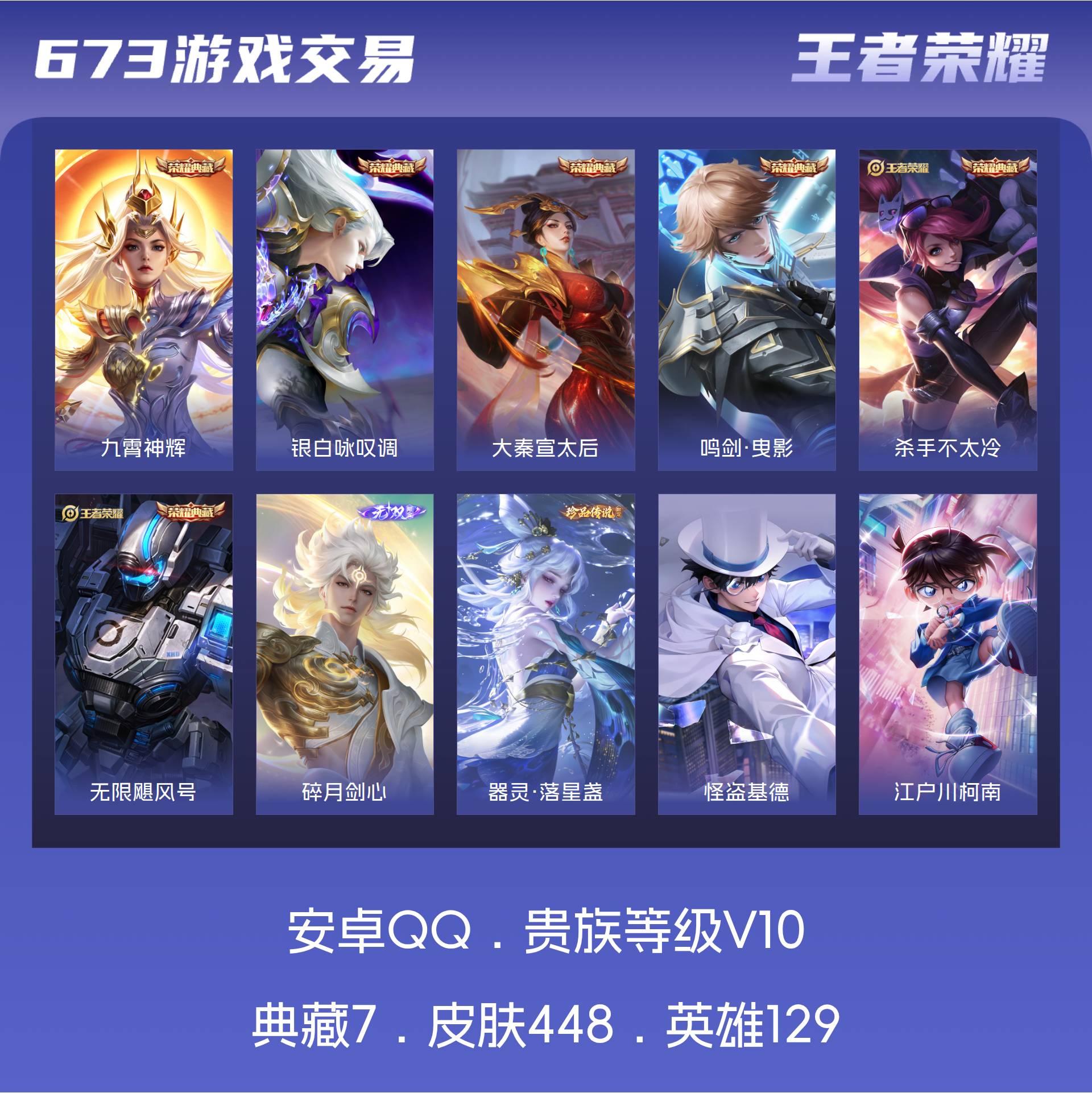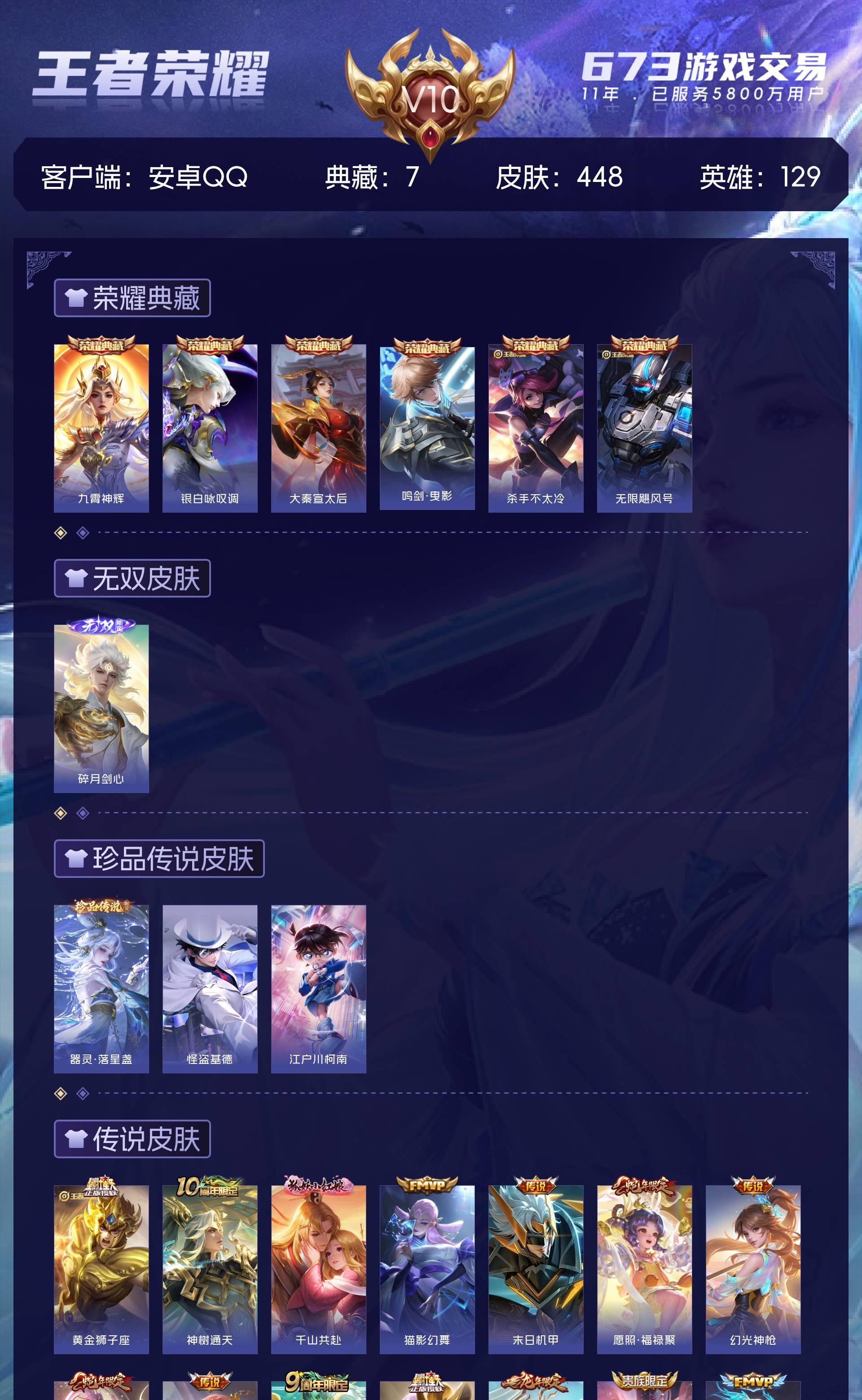 V10 皮肤448 英雄129 永恒钻石 荣耀典藏7 无双皮肤1 珍品传说3 星传说8 传说41 其