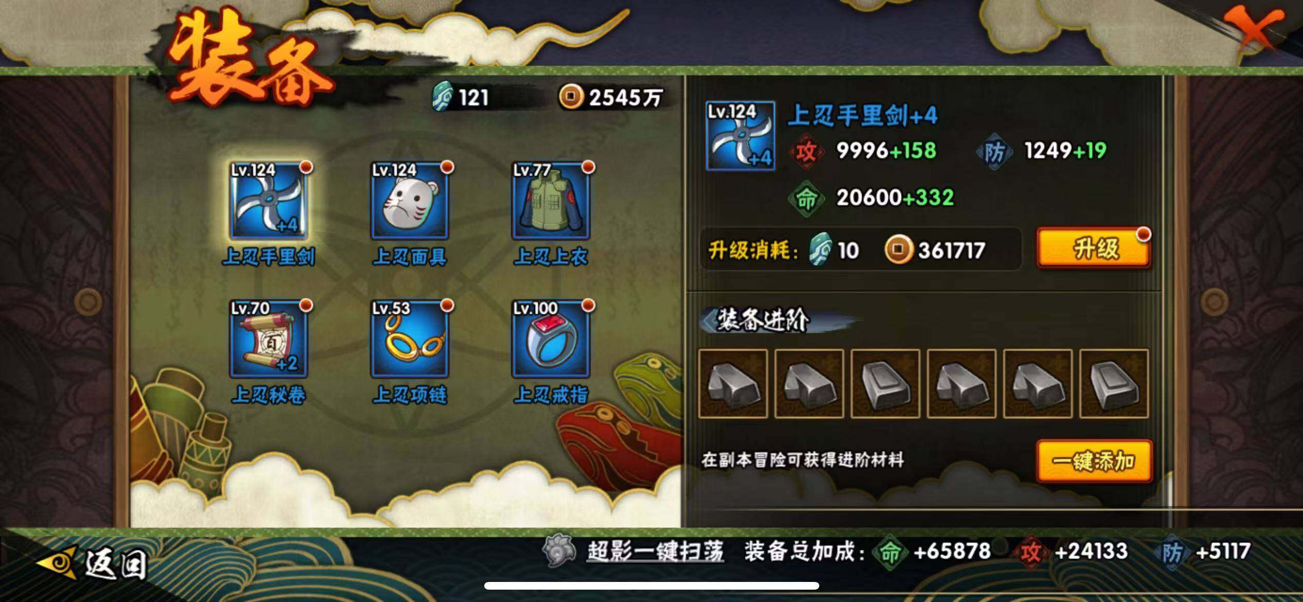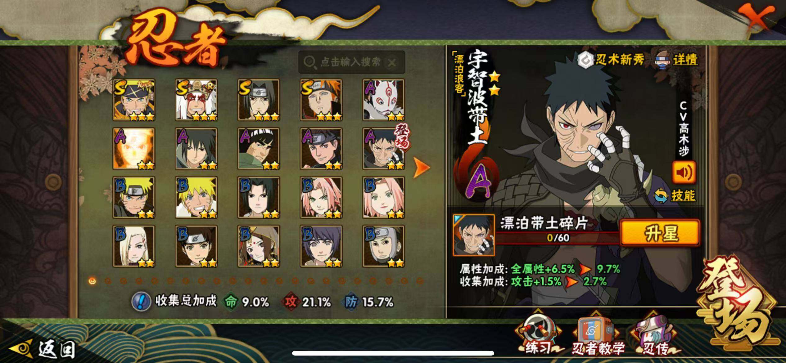 【A级忍者】:漩涡鸣人「九尾查克拉」(2星),猿飞日斩「火影继承人」(2星),宇智波带土「漂泊浪客」(2星),神秘面具男「忍者之路」(2星),宇智波泉奈(2星),迈特凯「青春爆炸」(2星)