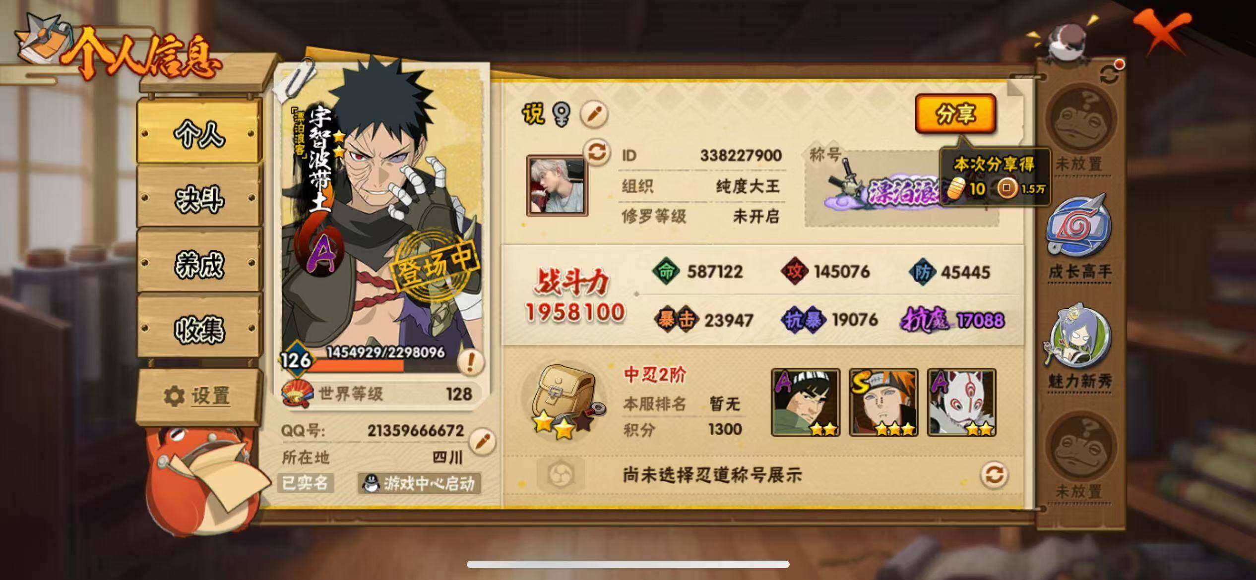 【S级忍者】:宇智波鼬「须佐能乎」(3星),自来也「舞之豪杰」(3星),佩恩「天道」(3星),漩涡鸣人·宇智波佐助(3星)