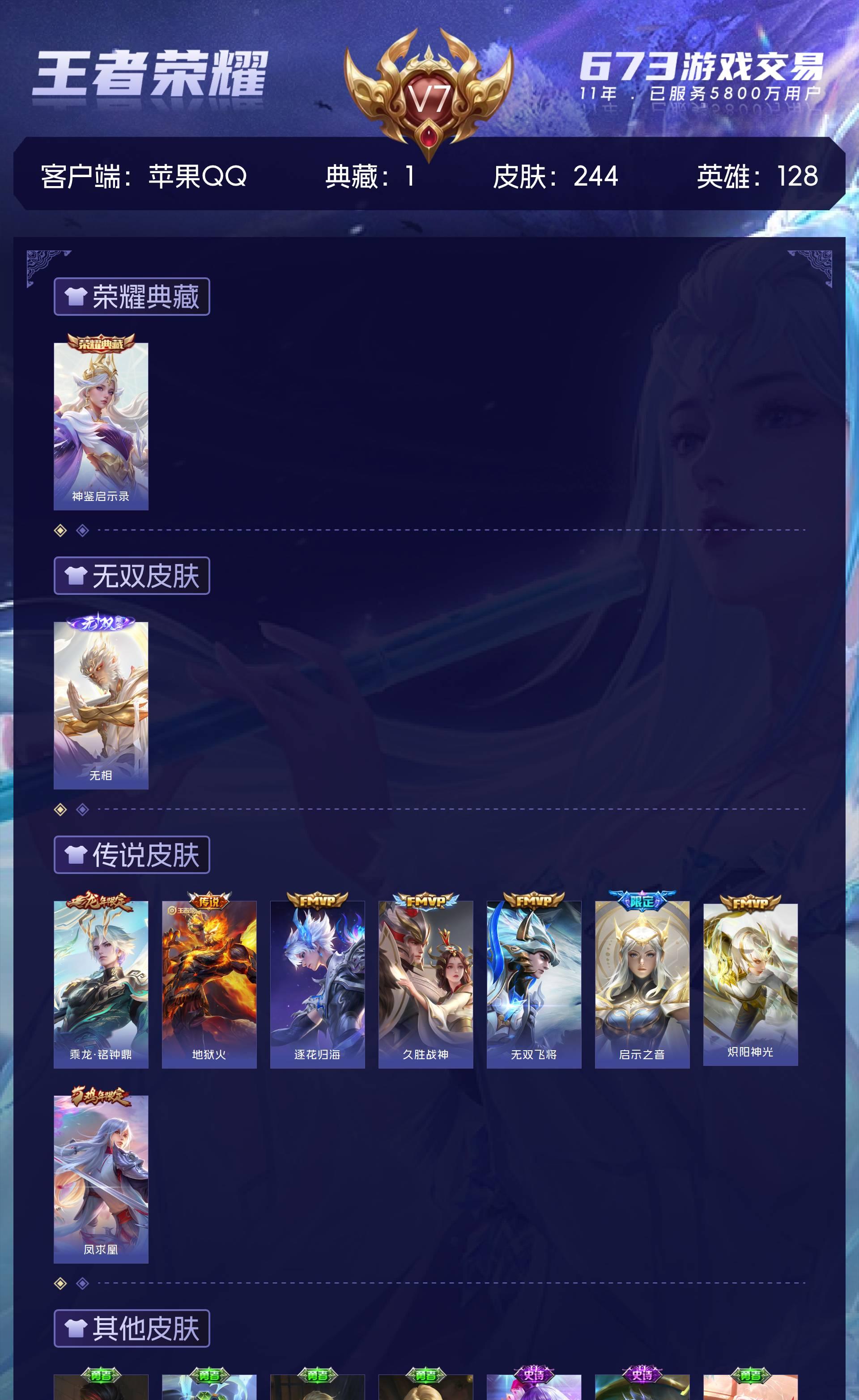 V7 皮肤244 英雄128 至尊星耀 荣耀典藏1 无双皮肤1 传说8 其他皮肤240