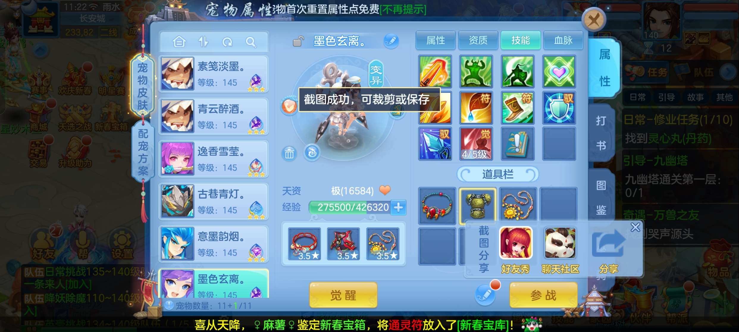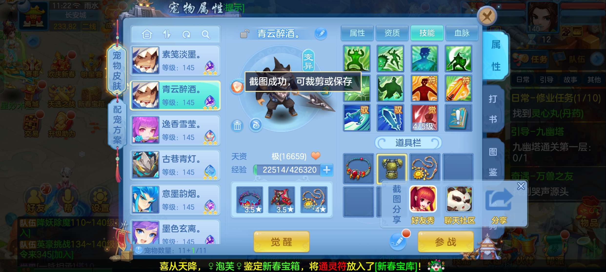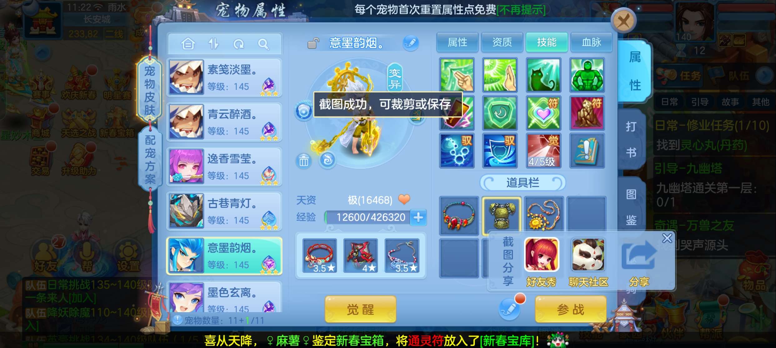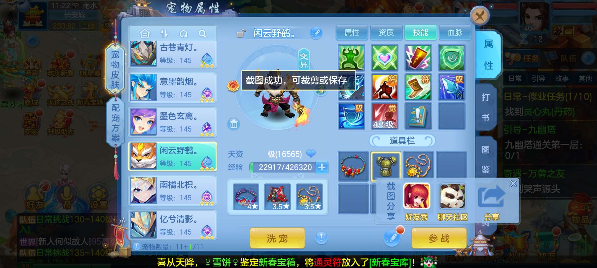 飞升140 648坐骑 宠物基本都带皮肤 修差一个宝宝全满 两套属性 神武币和金币都不少有存货