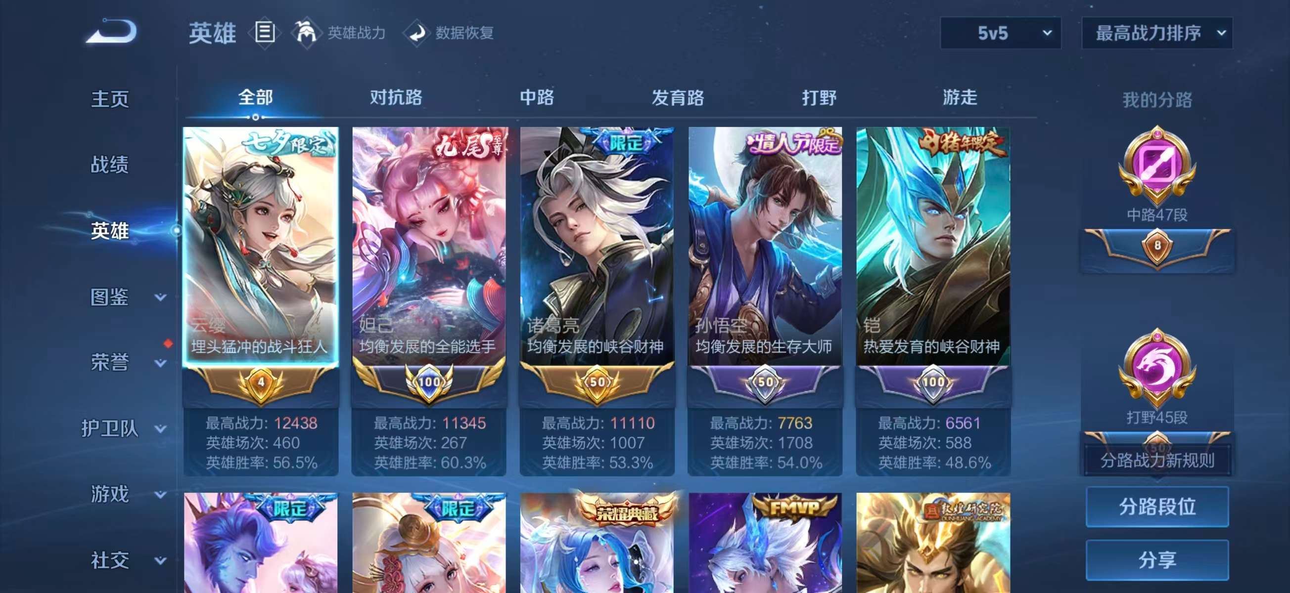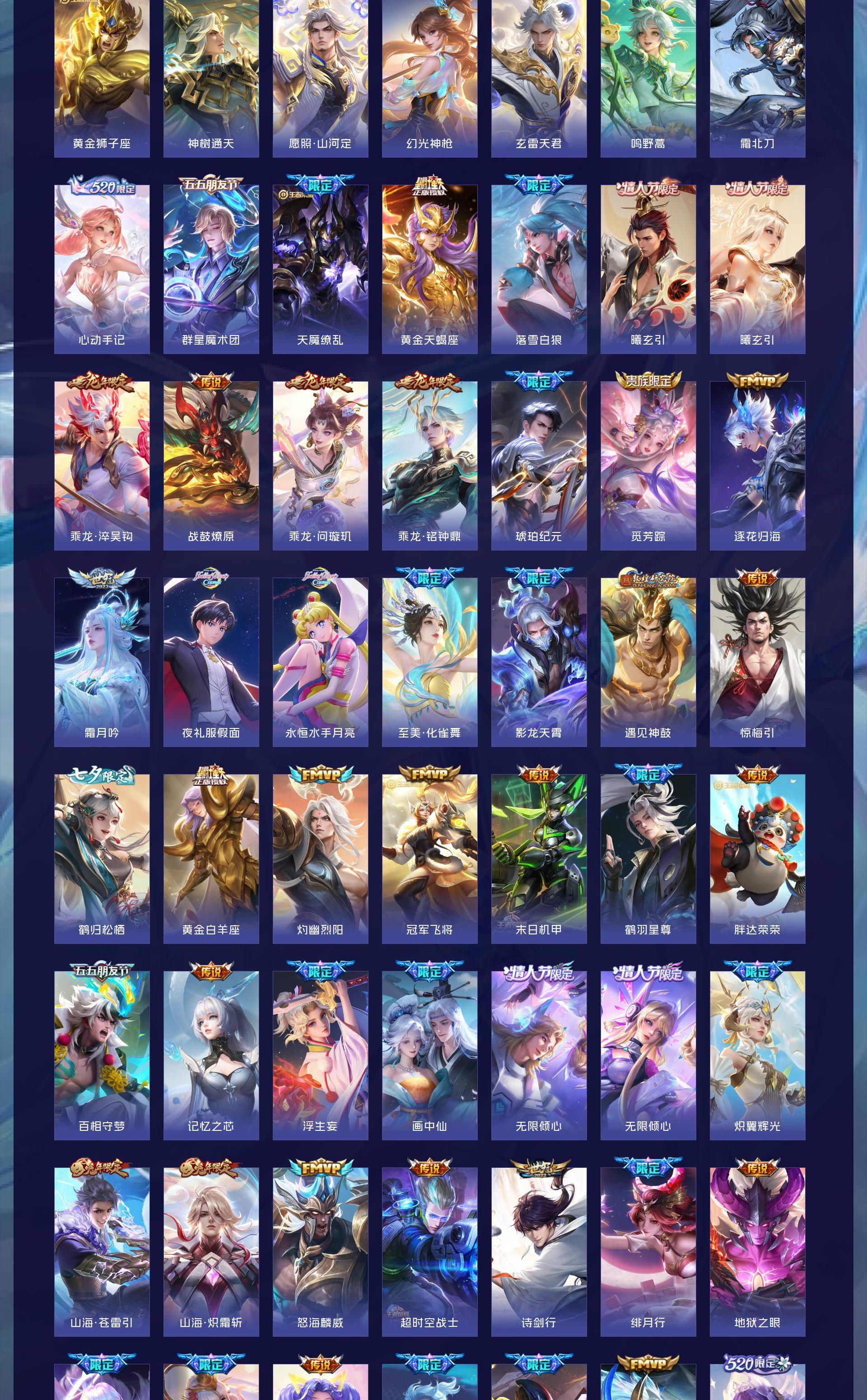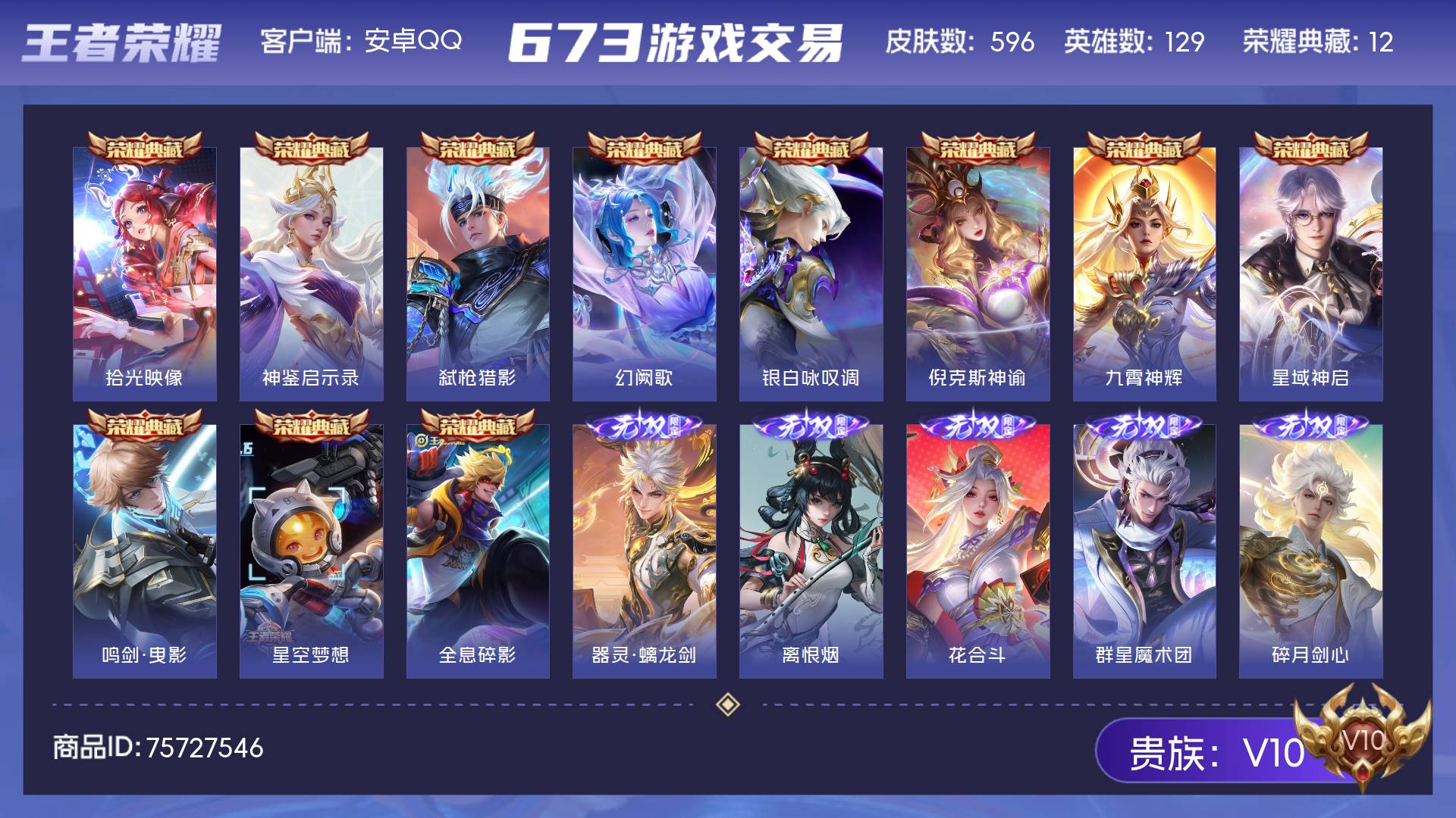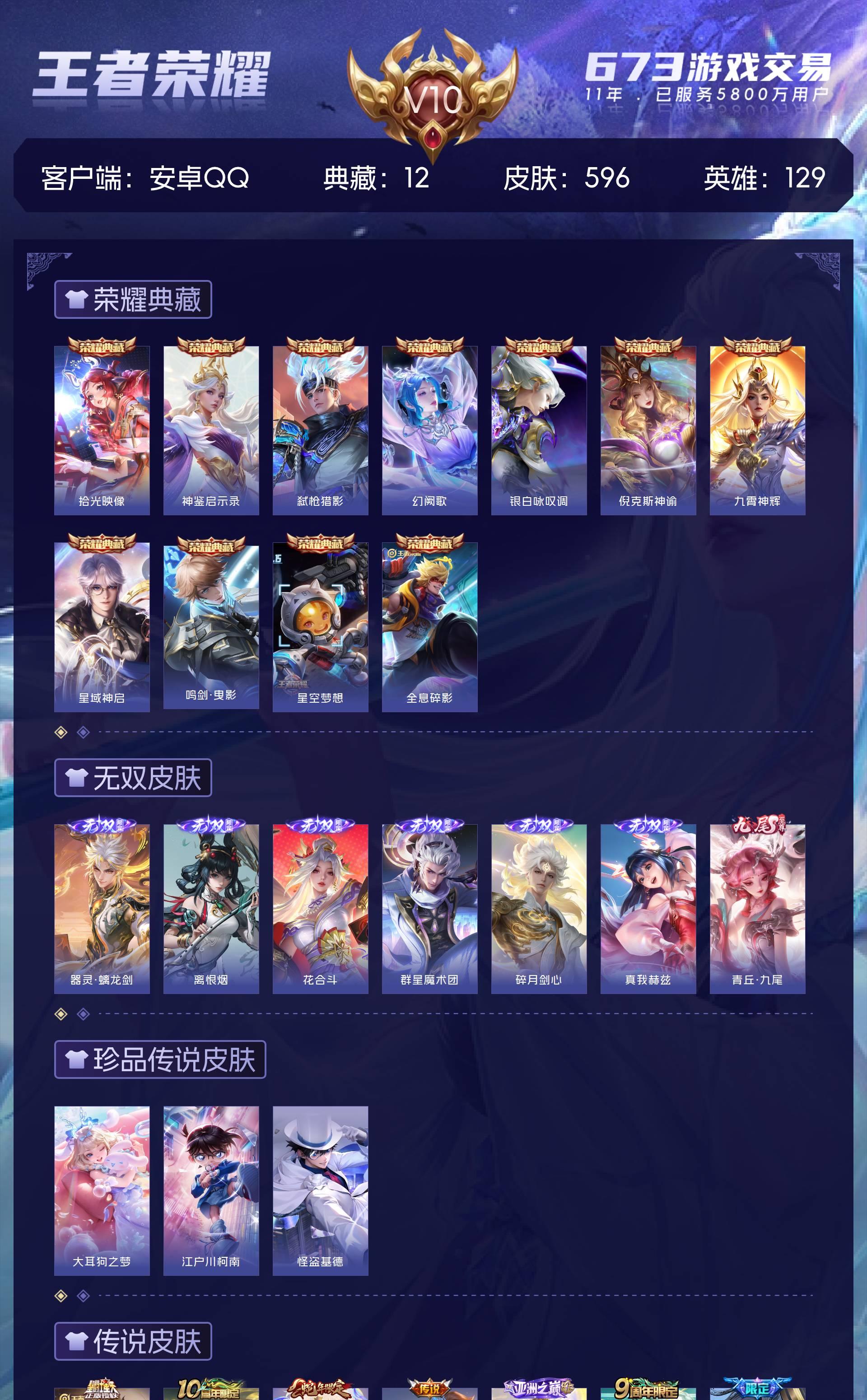 安卓QQ/荣耀王者/596皮肤/129英雄/11典藏/0珍品无双/7无双/3珍品传说/87传说/