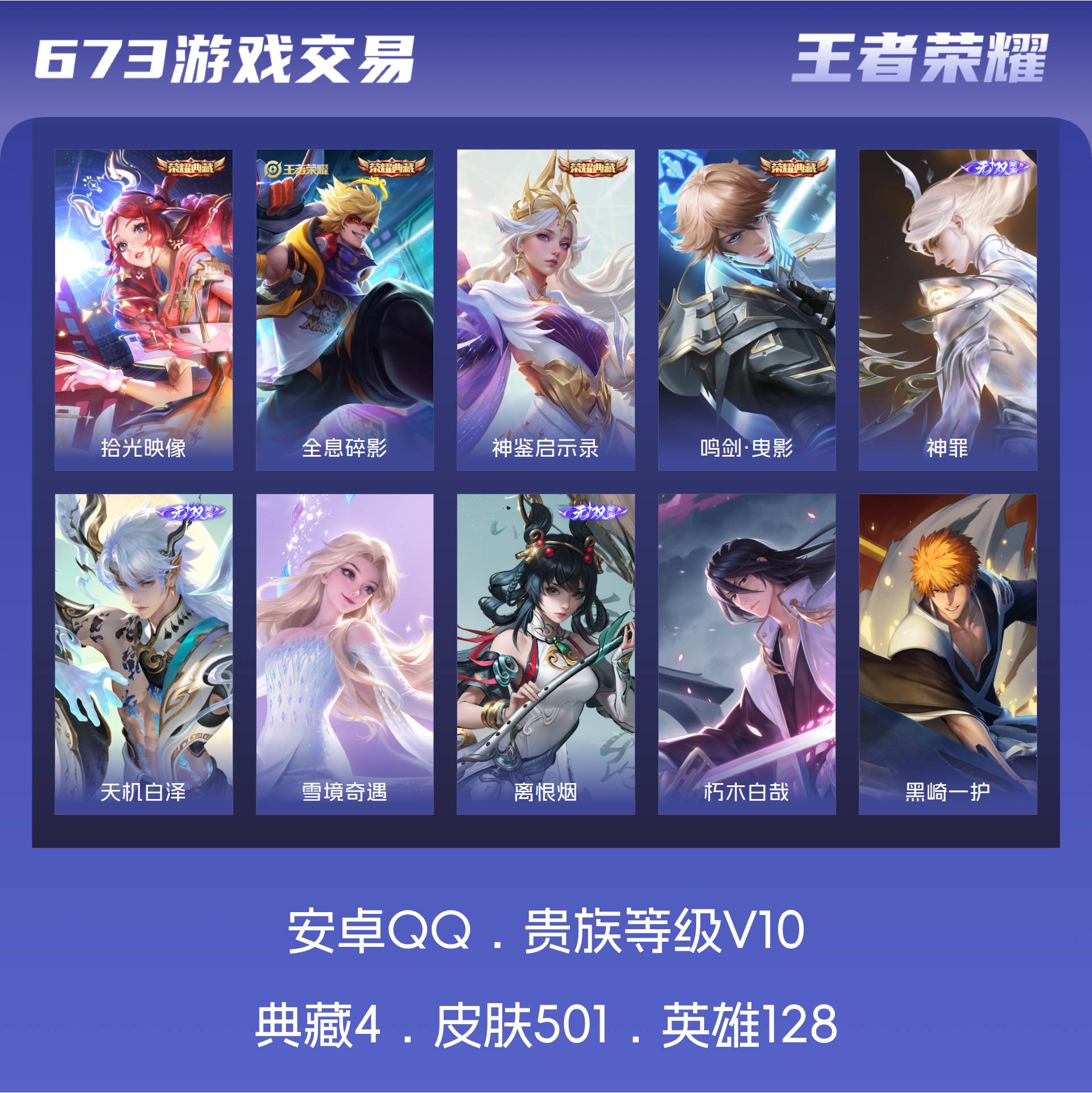 A514/贵10/【英雄数量】128/【皮肤数量】501/【区服】安卓